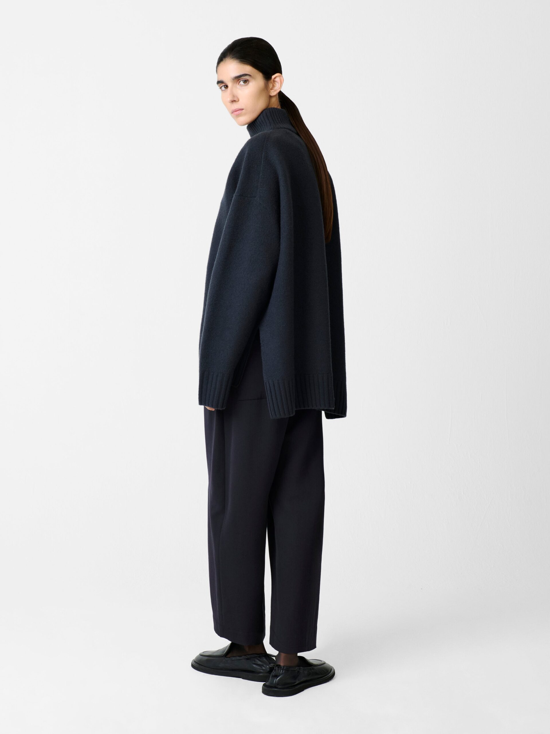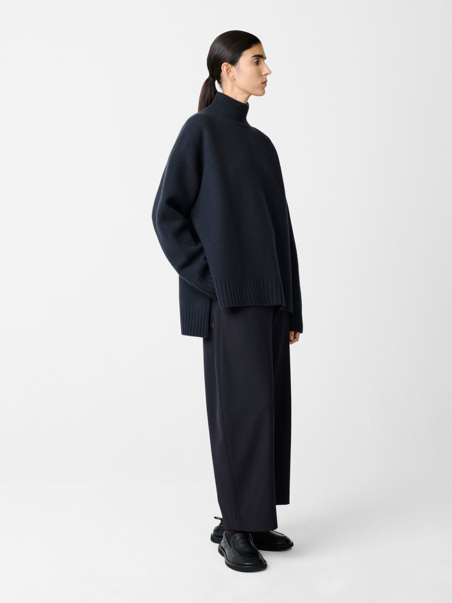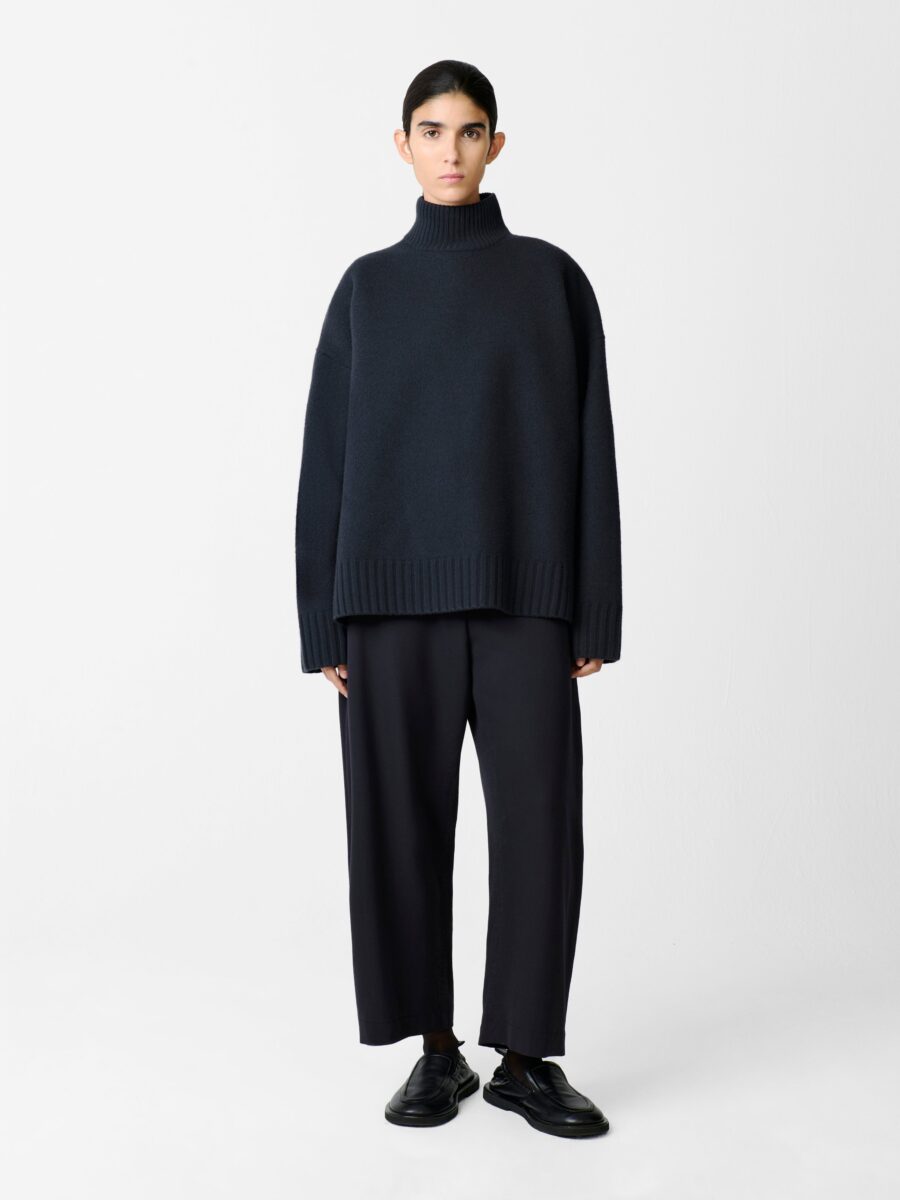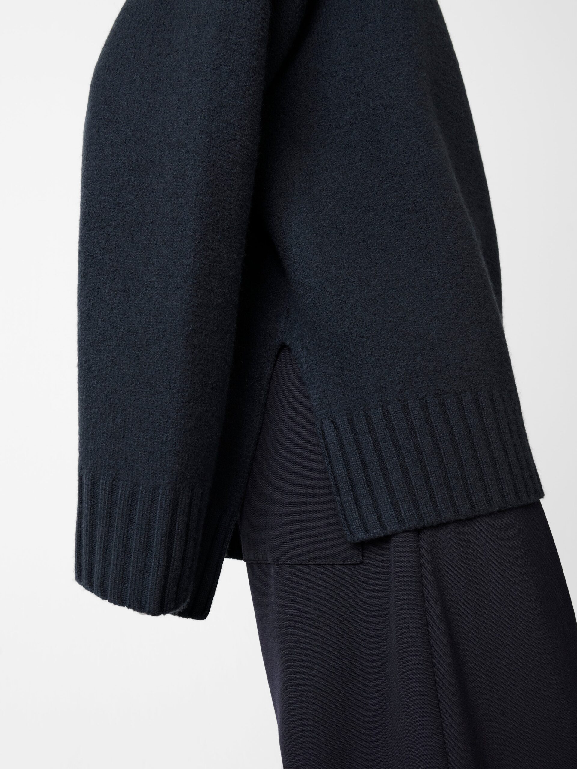 Hozu has a square body shape and a high neck that combine to create a flattering, minimalist silhouette. It has a side split detail and a stepped hem that’s longer at the back. The softly boiled wool has an extraordinarily fleecy texture.