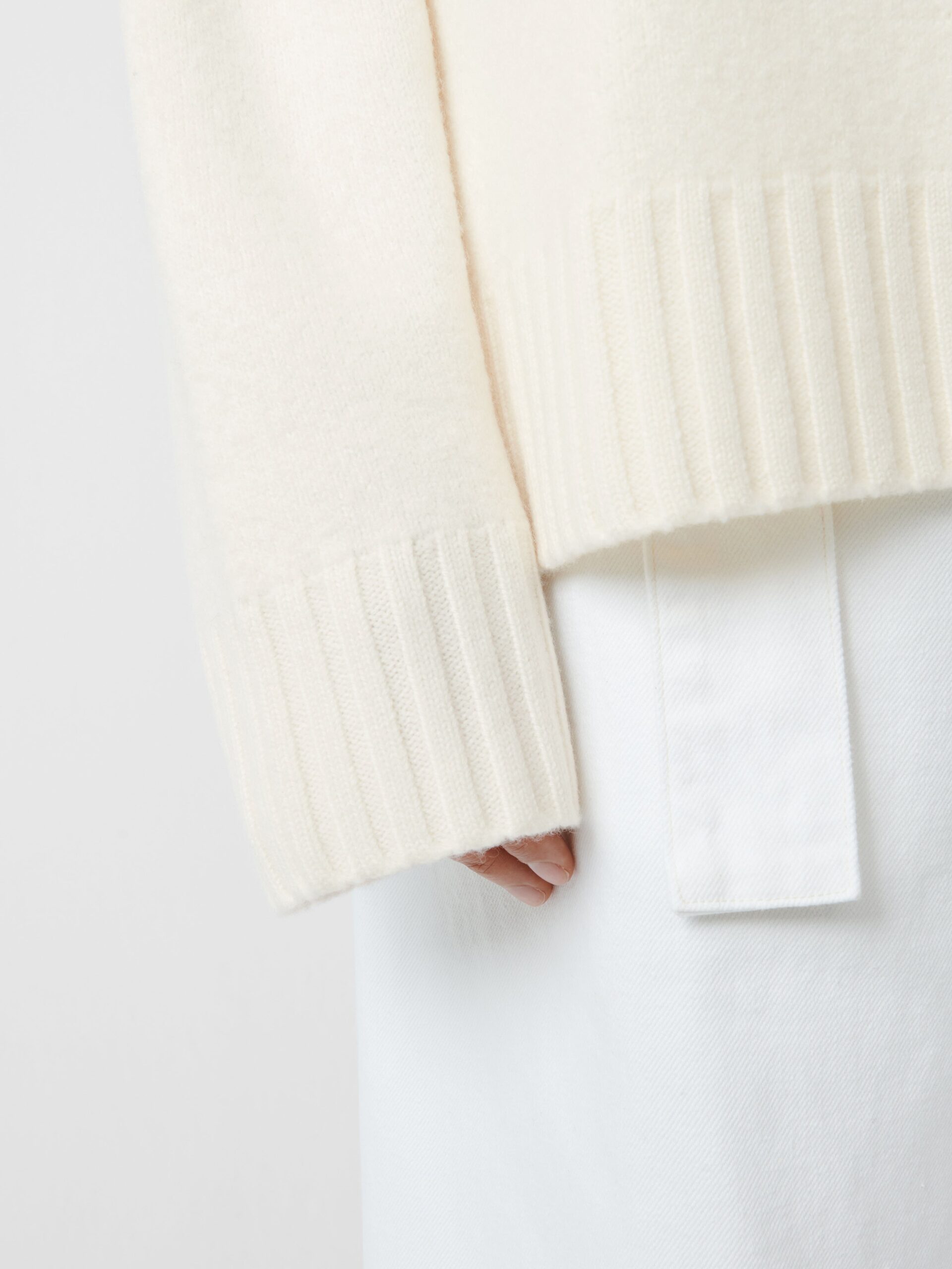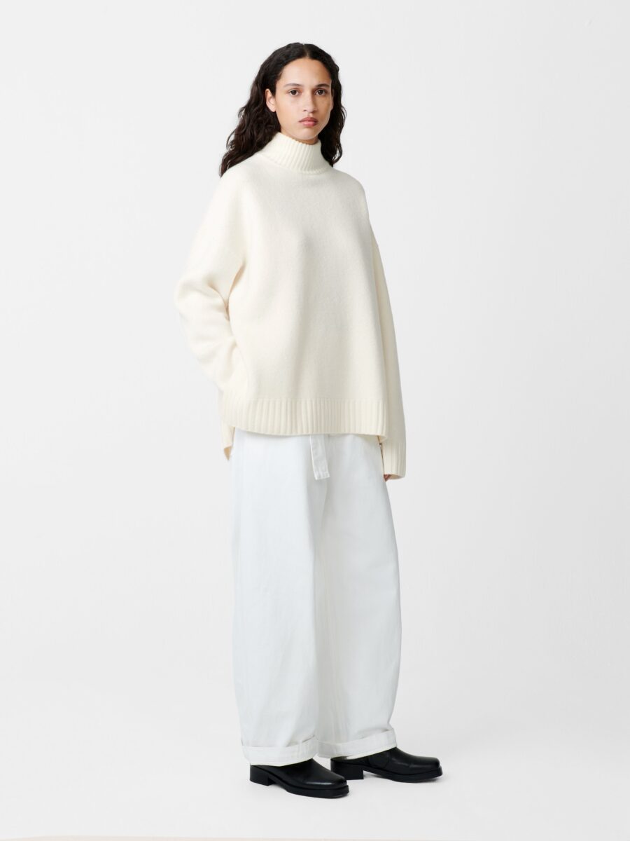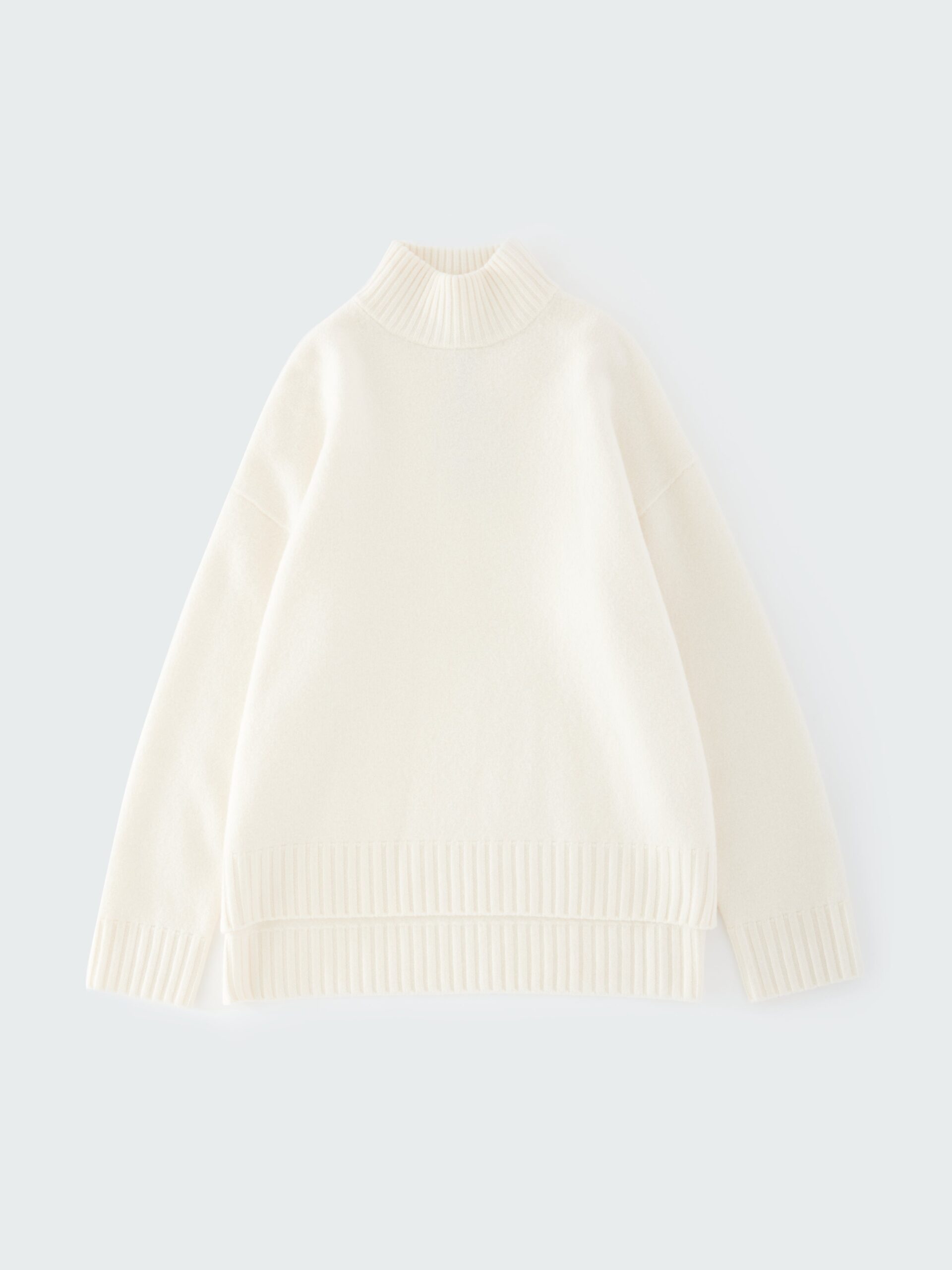 Hozu has a square body shape and a high neck that combine to create a flattering, minimalist silhouette. It has a side split detail and a stepped hem that’s longer at the back. The softly boiled wool has an extraordinarily fleecy texture.