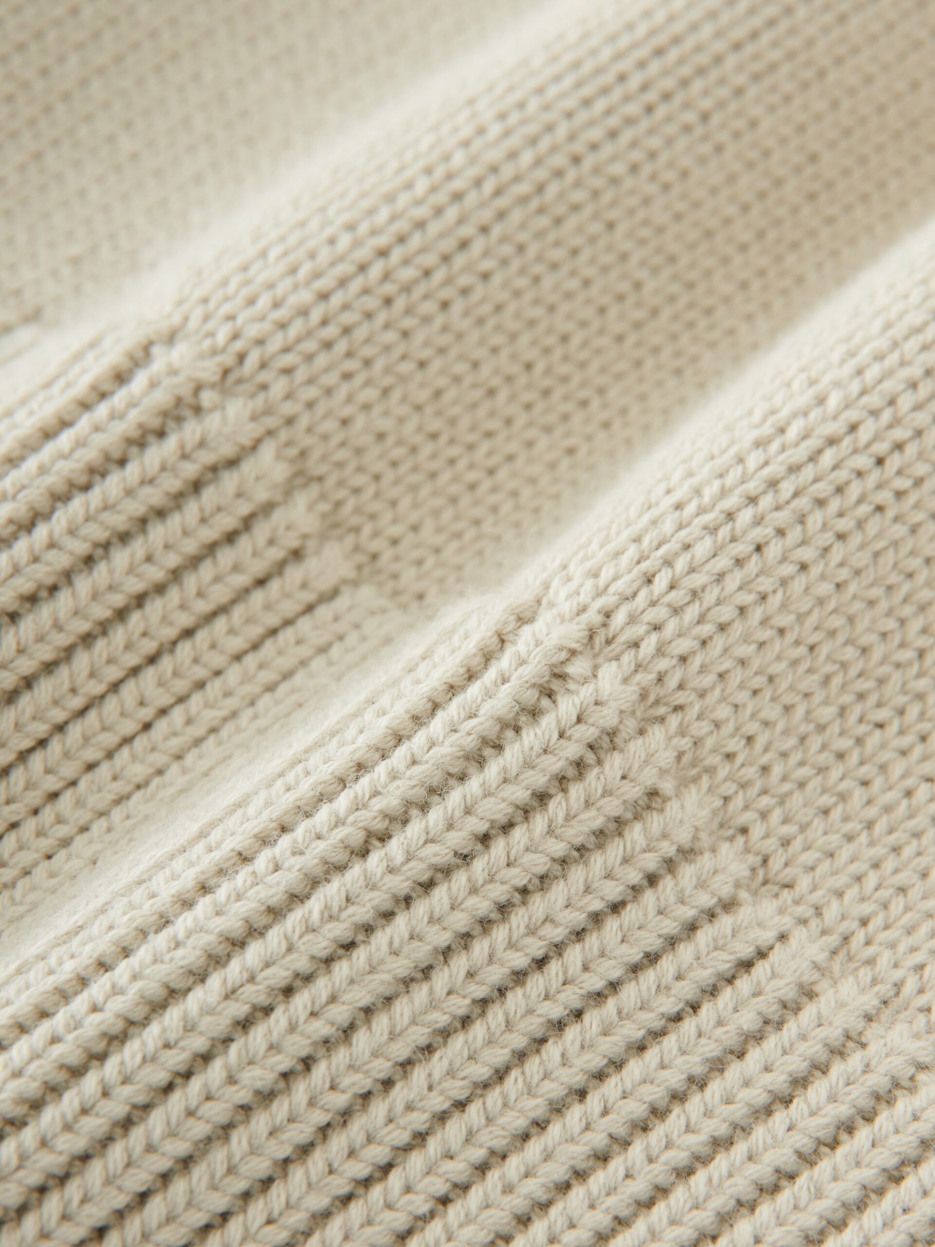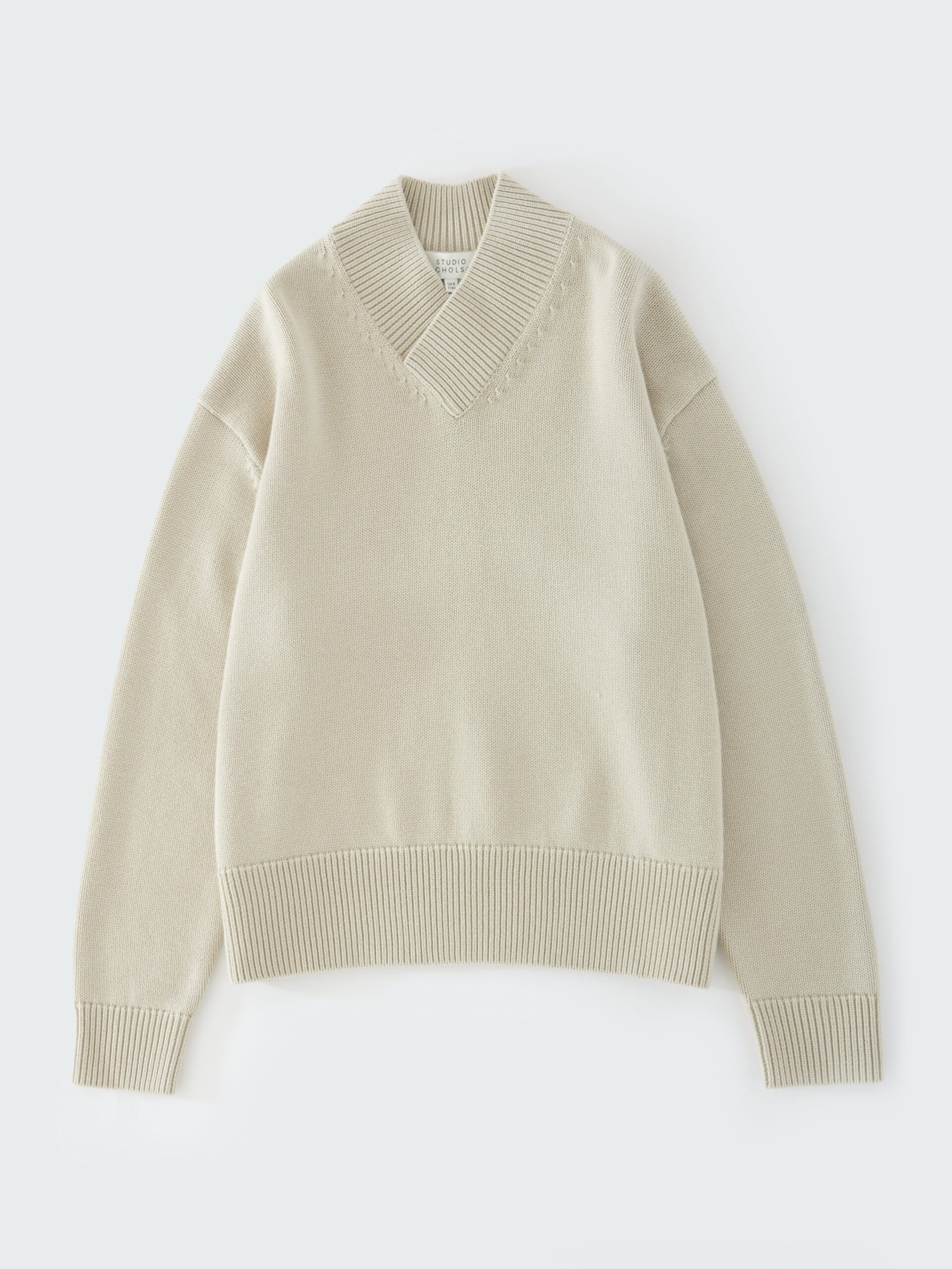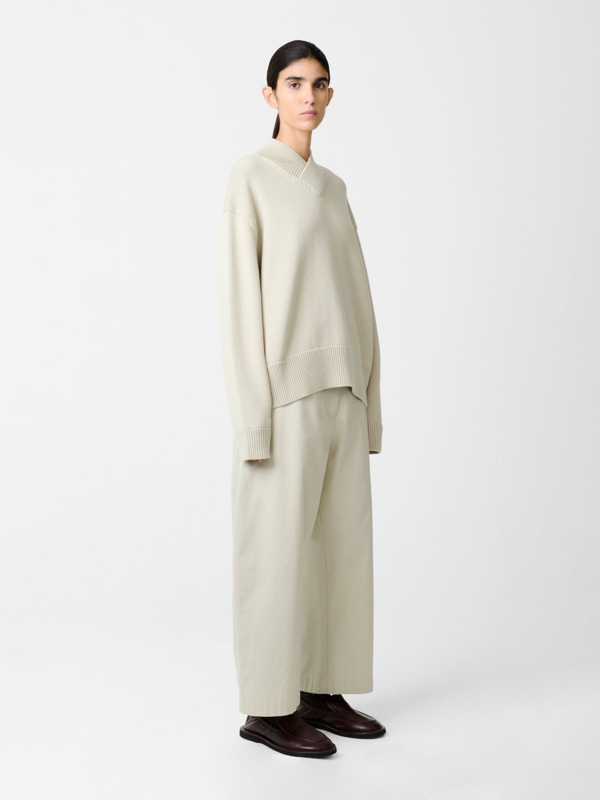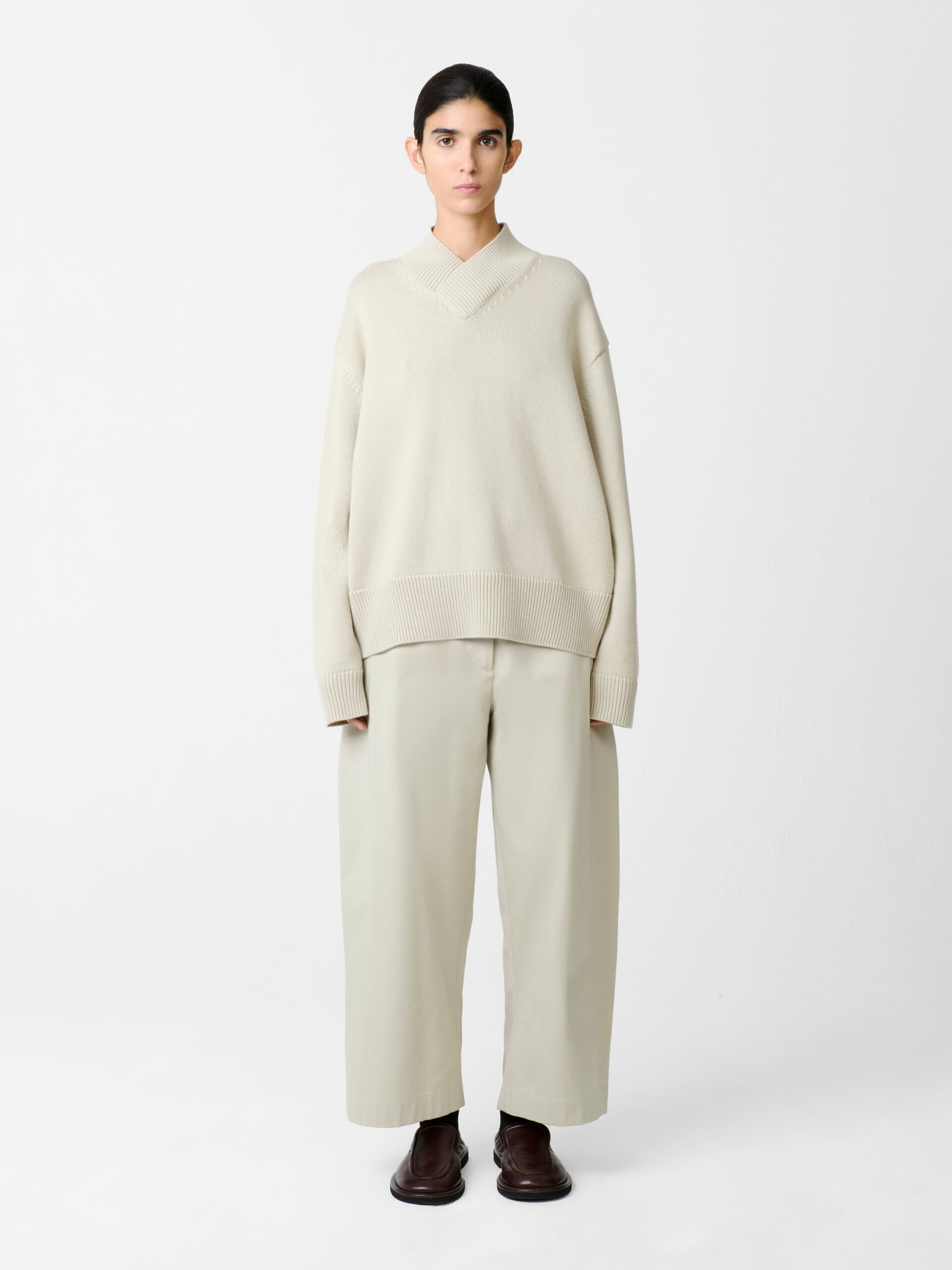 Knitted from a blend of merino wool and cotton with the best properties of both, Nohwe is a loose, cropped jumper ideal for seasonal layering. It features a high V-neck collar, which is constructed with a wrap-like crossover detail.