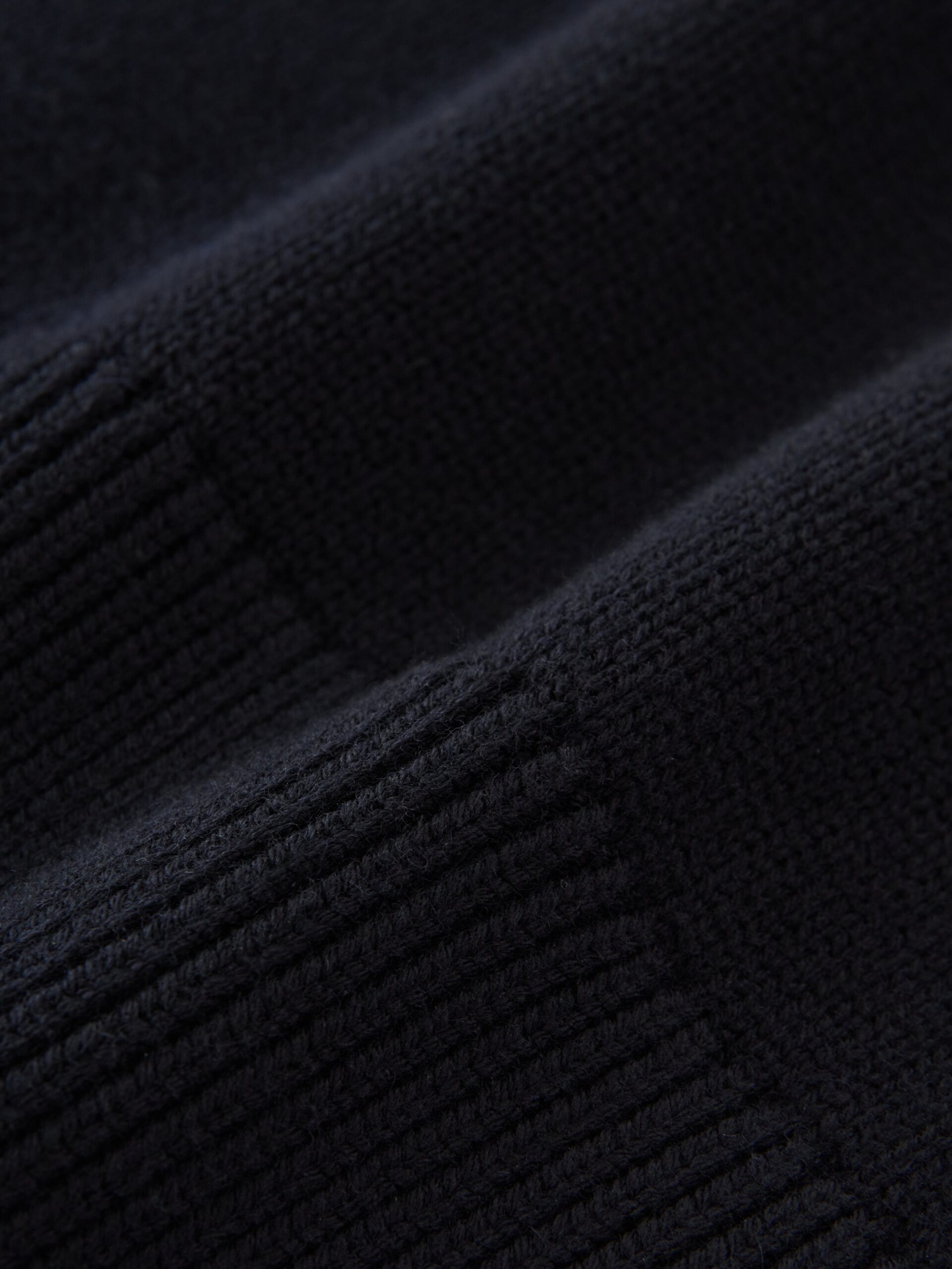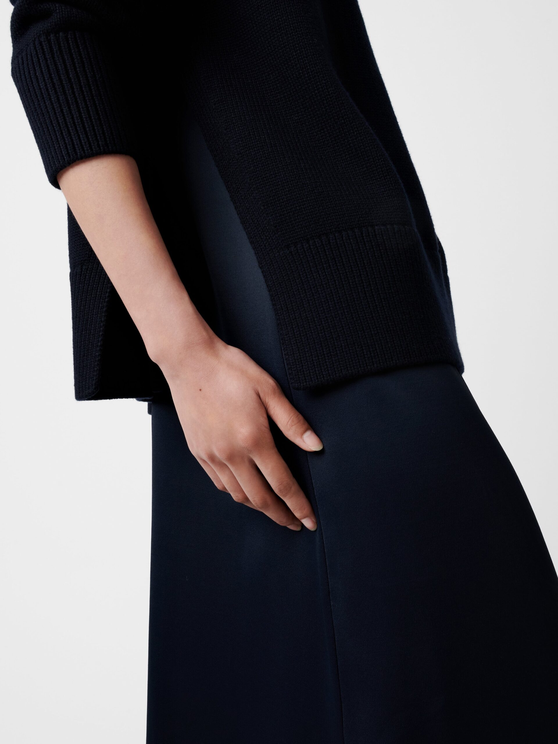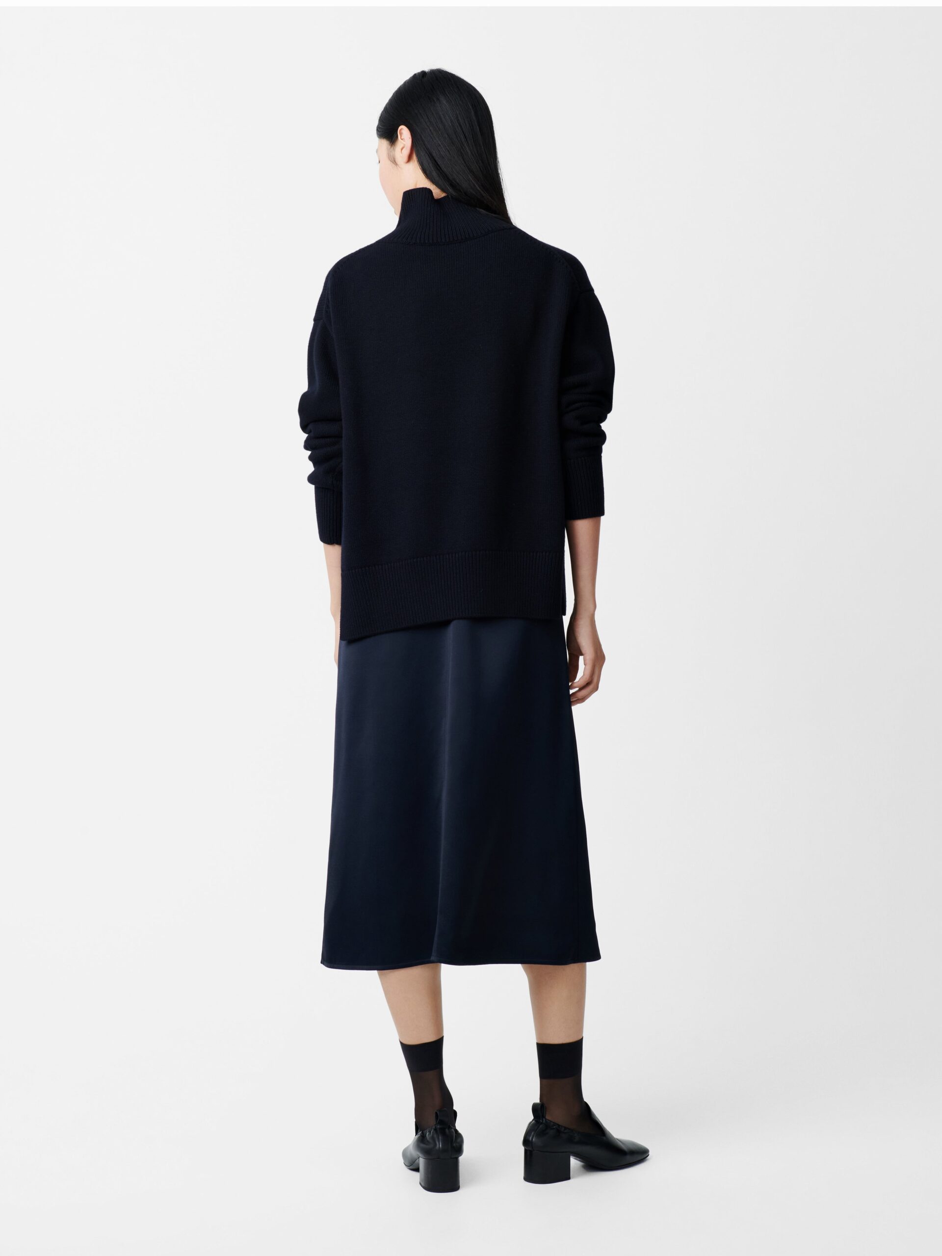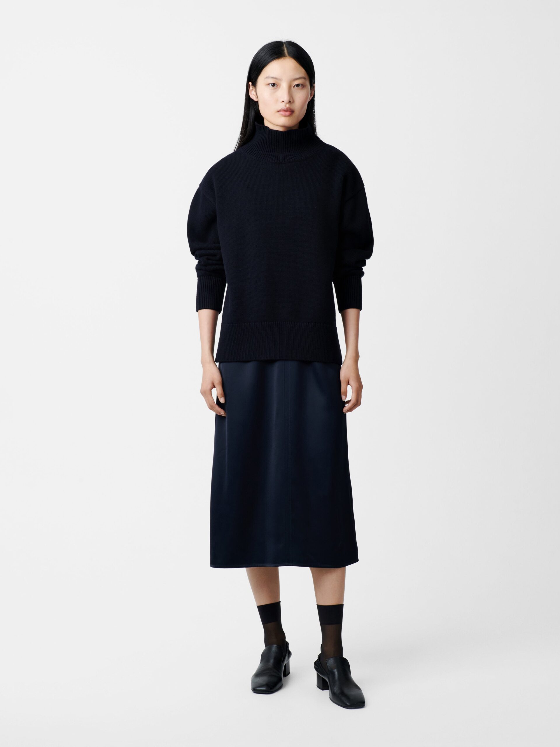 Winter ‘24 focuses on relaxed and oversized knitwear proportions, seen in the slouchy dropped shoulders on this Patria jumper. Spun from merino and cotton yarns that have a roundness and elasticity, it has a high neck with heavy ribbed stitching to hold its shape and deep side slits that allow it to sit nonchalantly over high-rise trousers and skirts.