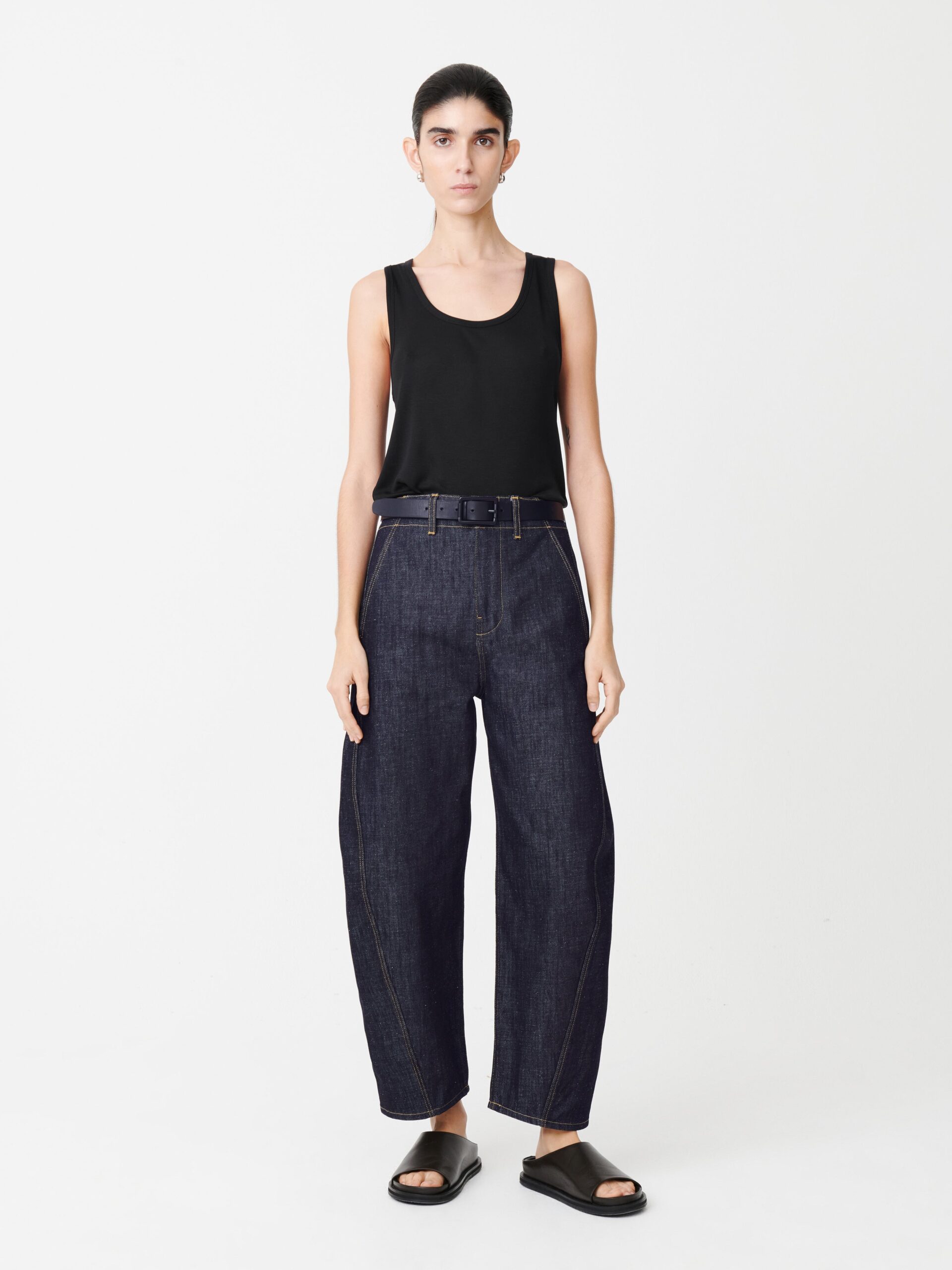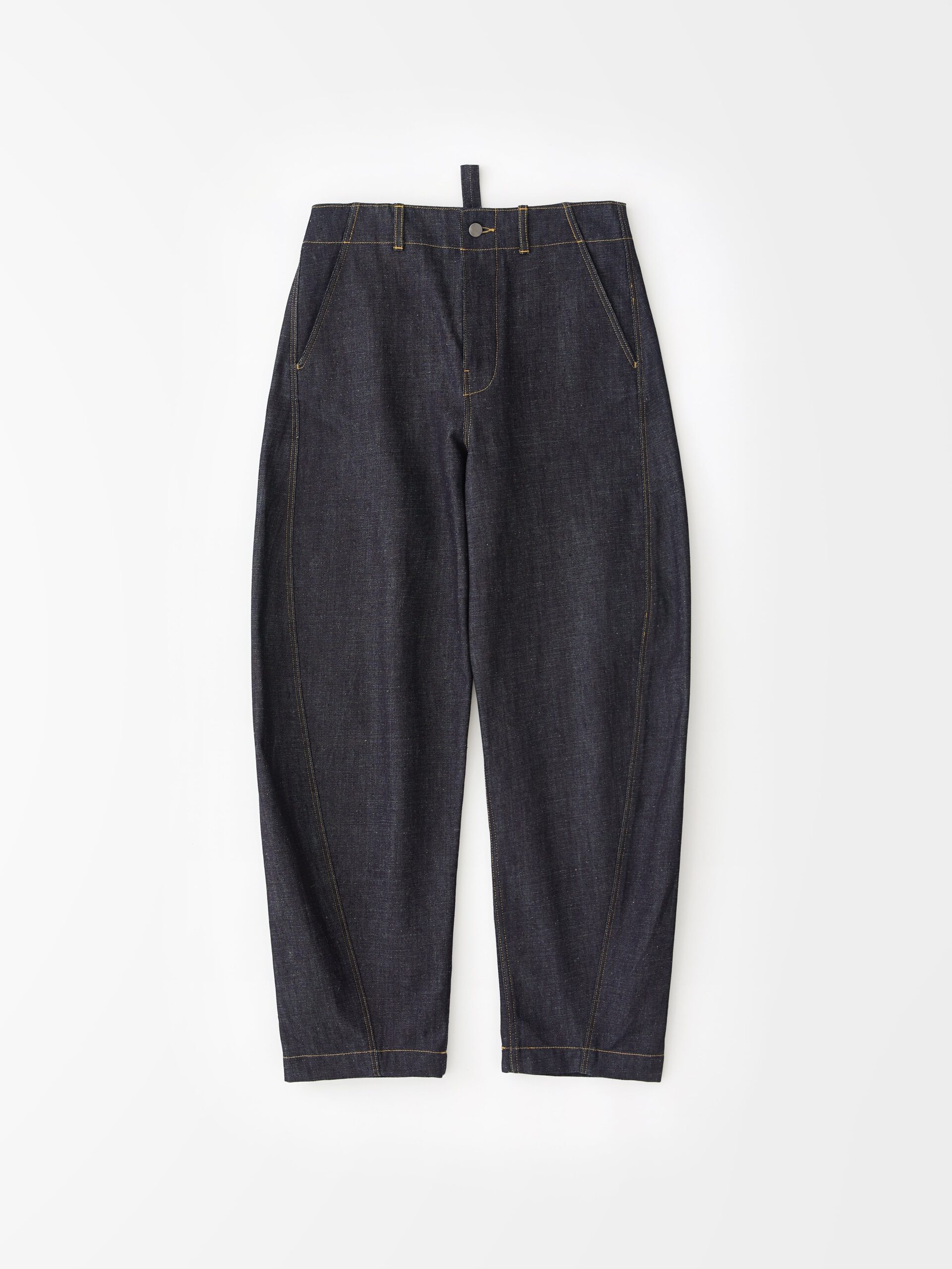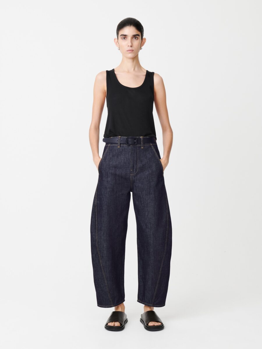 Five-pocket jeans with added volume, Akerman creates a distinctive silhouette with its curved leg and cropped length. They are made from renowned fabrics manufacturer ISKO’s sustainable raw R-TWO™ denim which will gain character with wear.