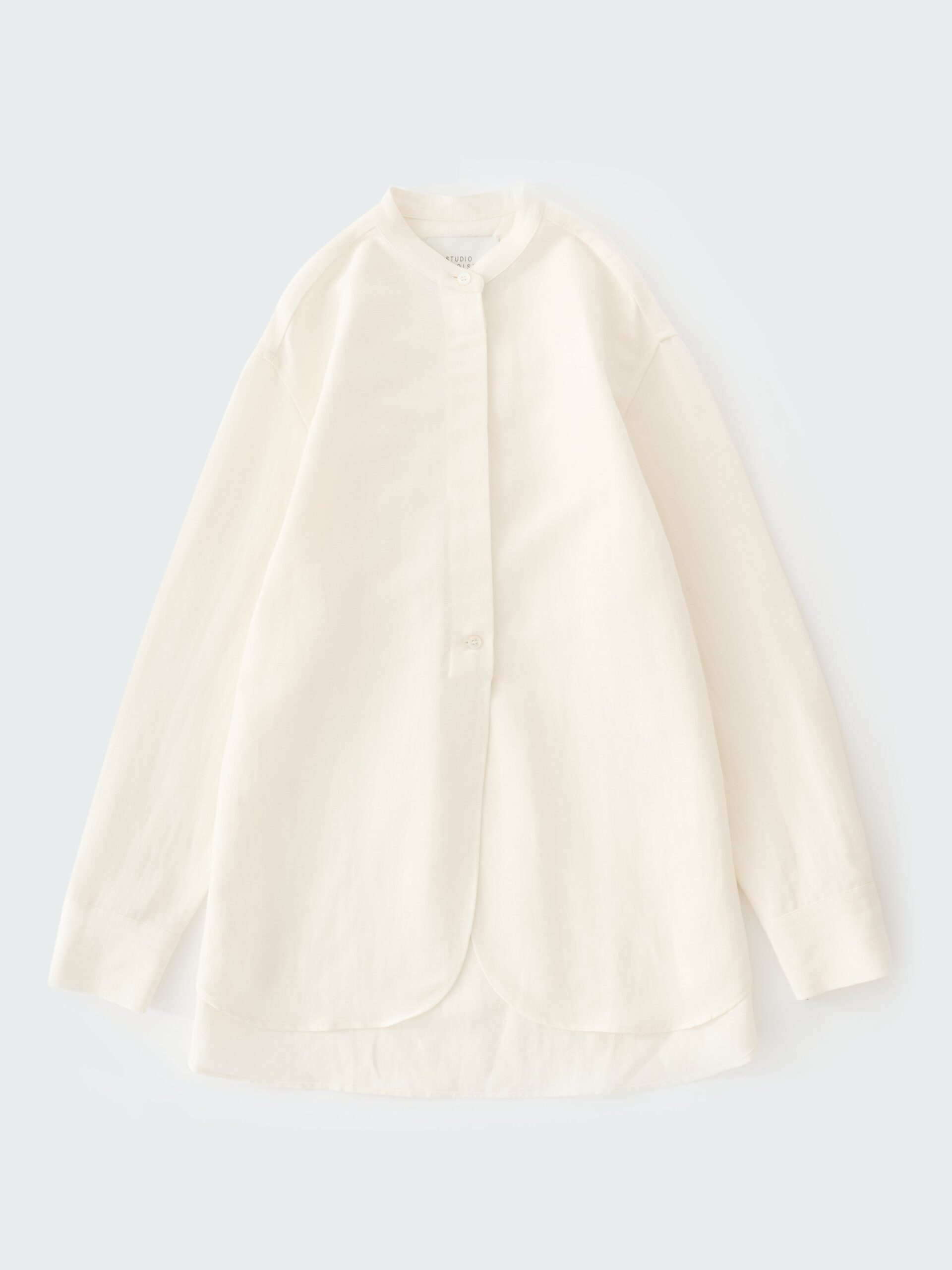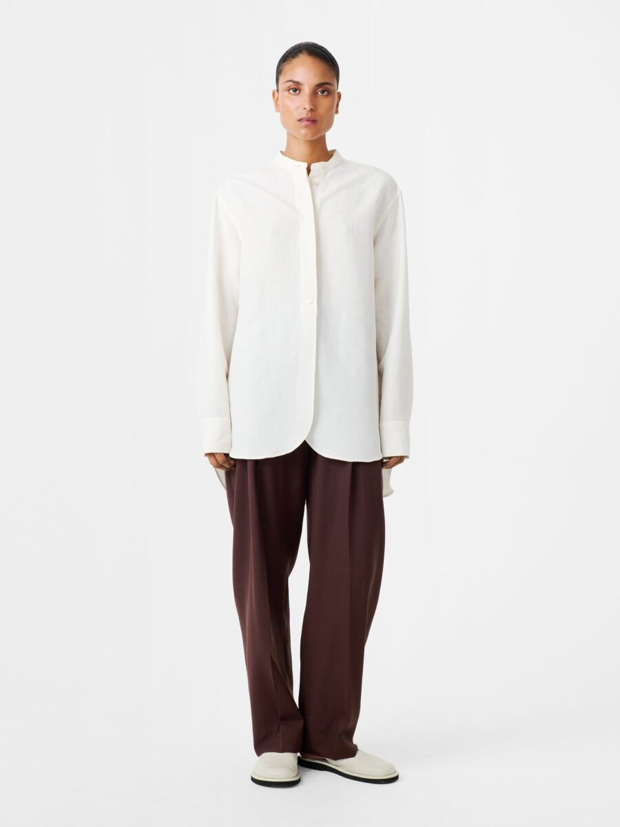 The Beam shirt is neatly tailored from a subtly tactile slubbed linen and wool blend, with flat felled seams conveying the careful creation process. The pared-back effect is enhanced by the fuss-free grandad collar and a partially concealed front placket – sparingly detailed with mother-of-pearl buttons.