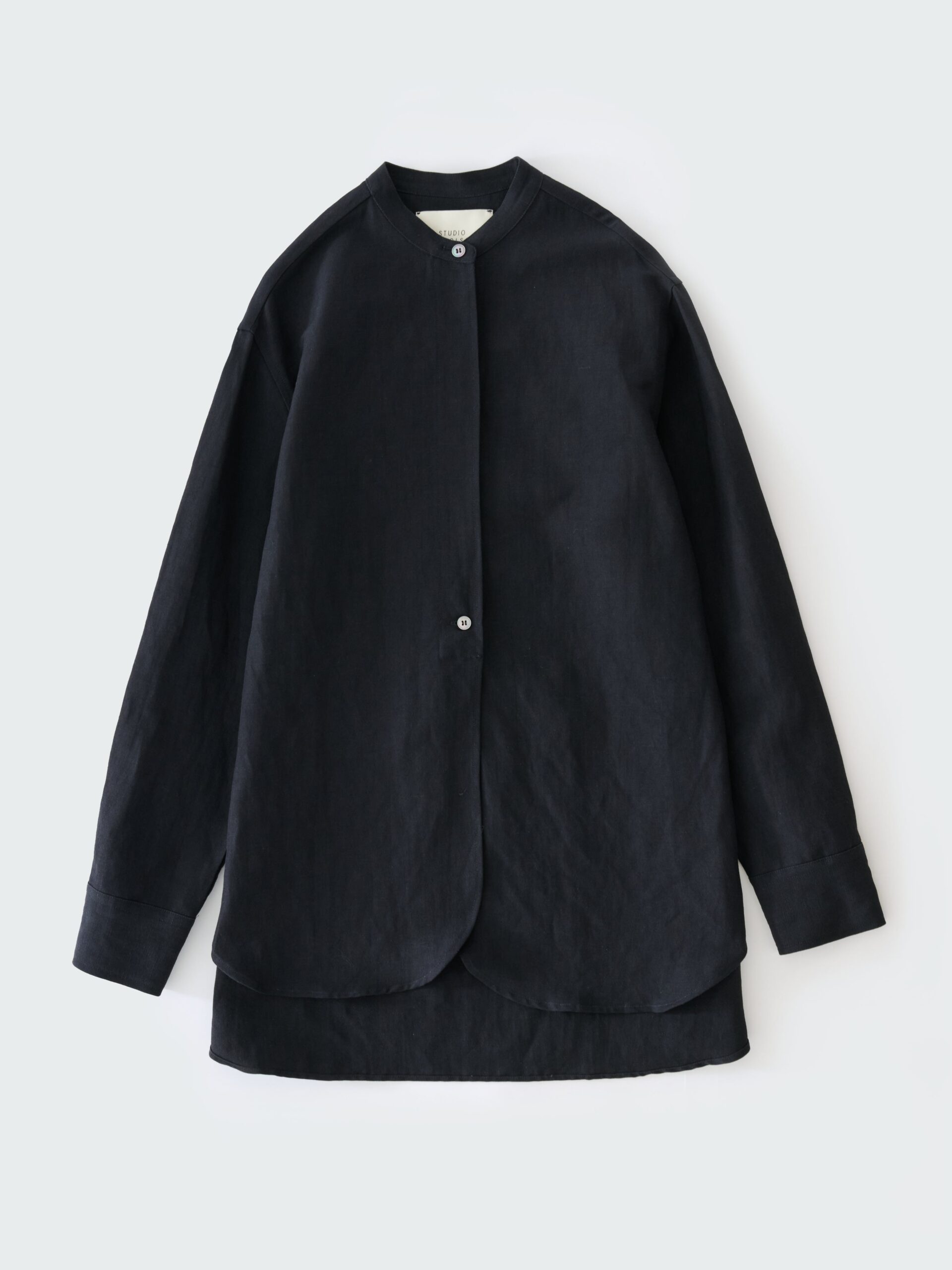 The Beam shirt is neatly tailored from a subtly tactile slubbed linen and wool blend, with flat felled seams conveying the careful creation process. The pared-back effect is enhanced by the fuss-free grandad collar and a partially concealed front placket – sparingly detailed with mother-of-pearl buttons.