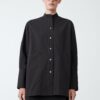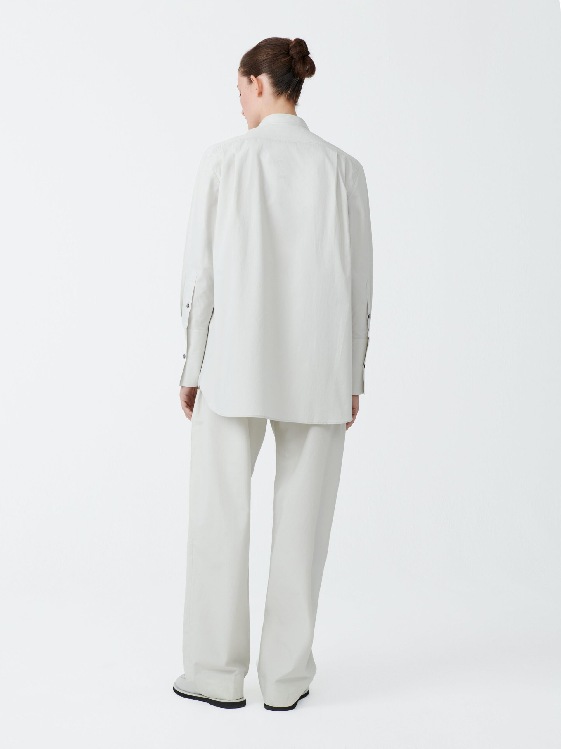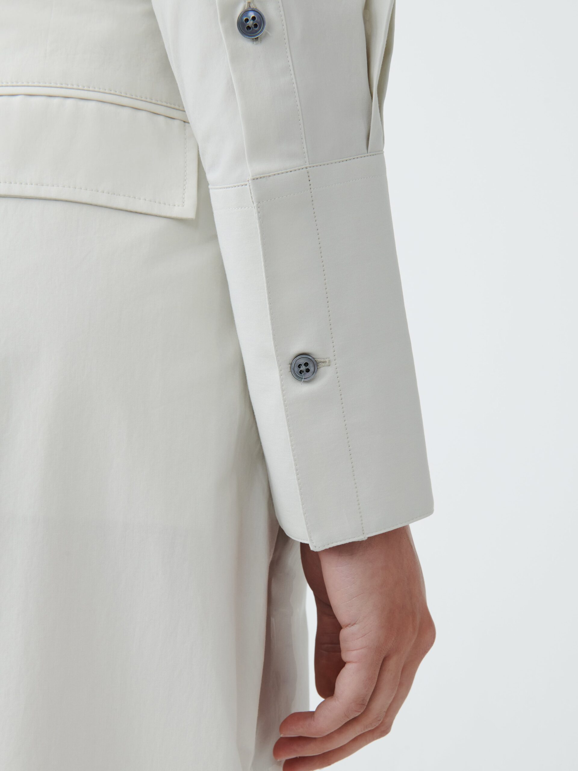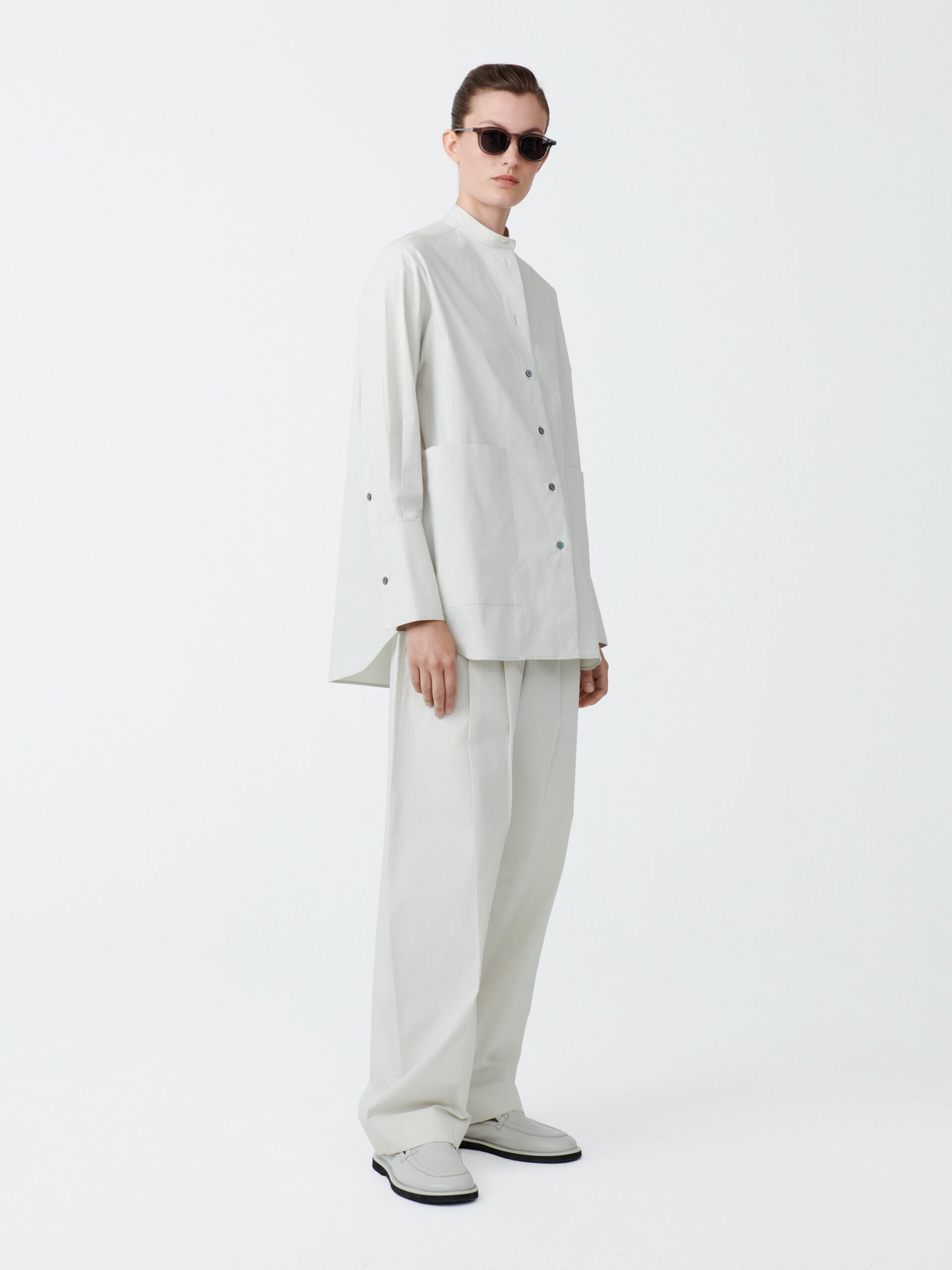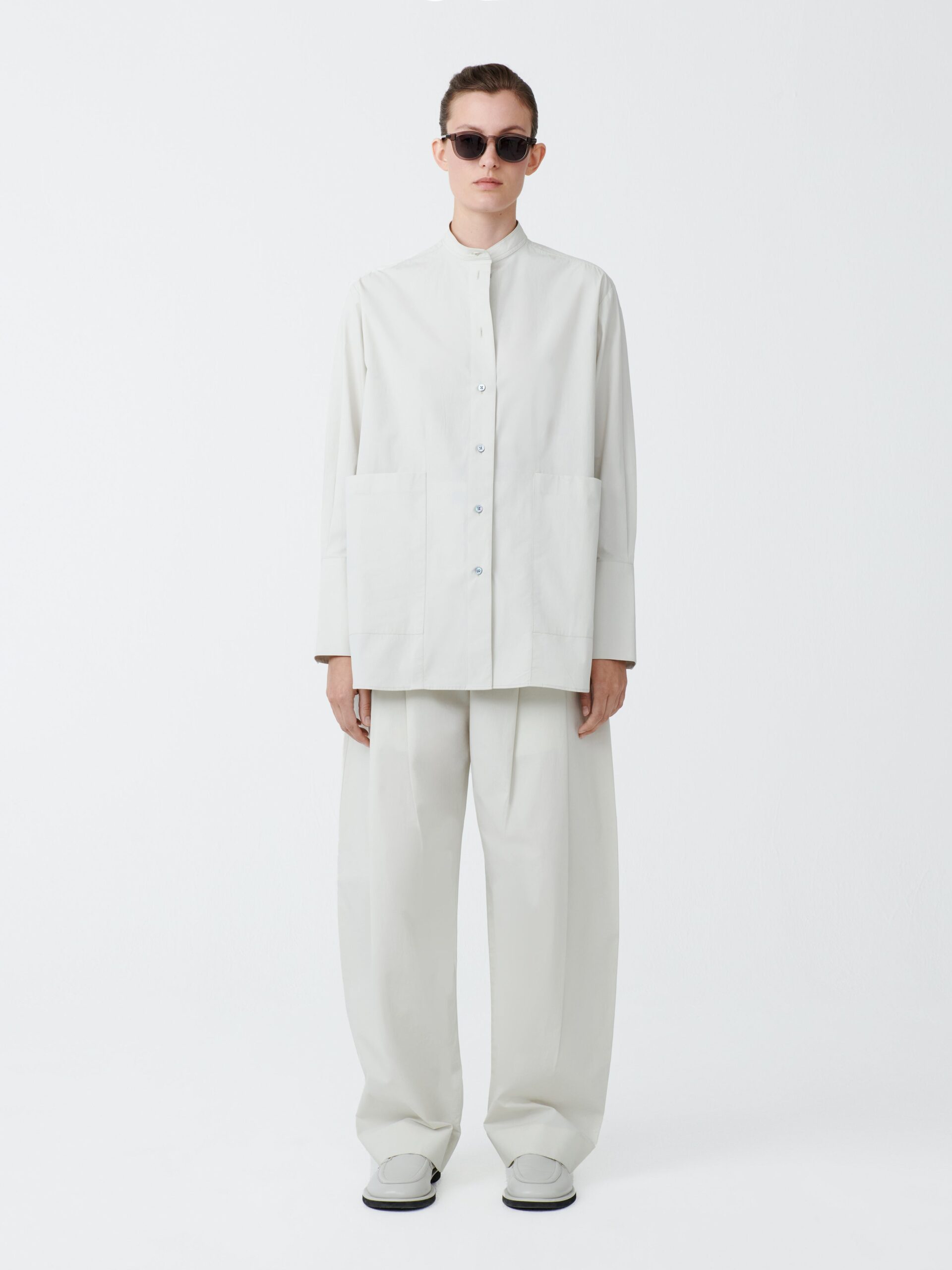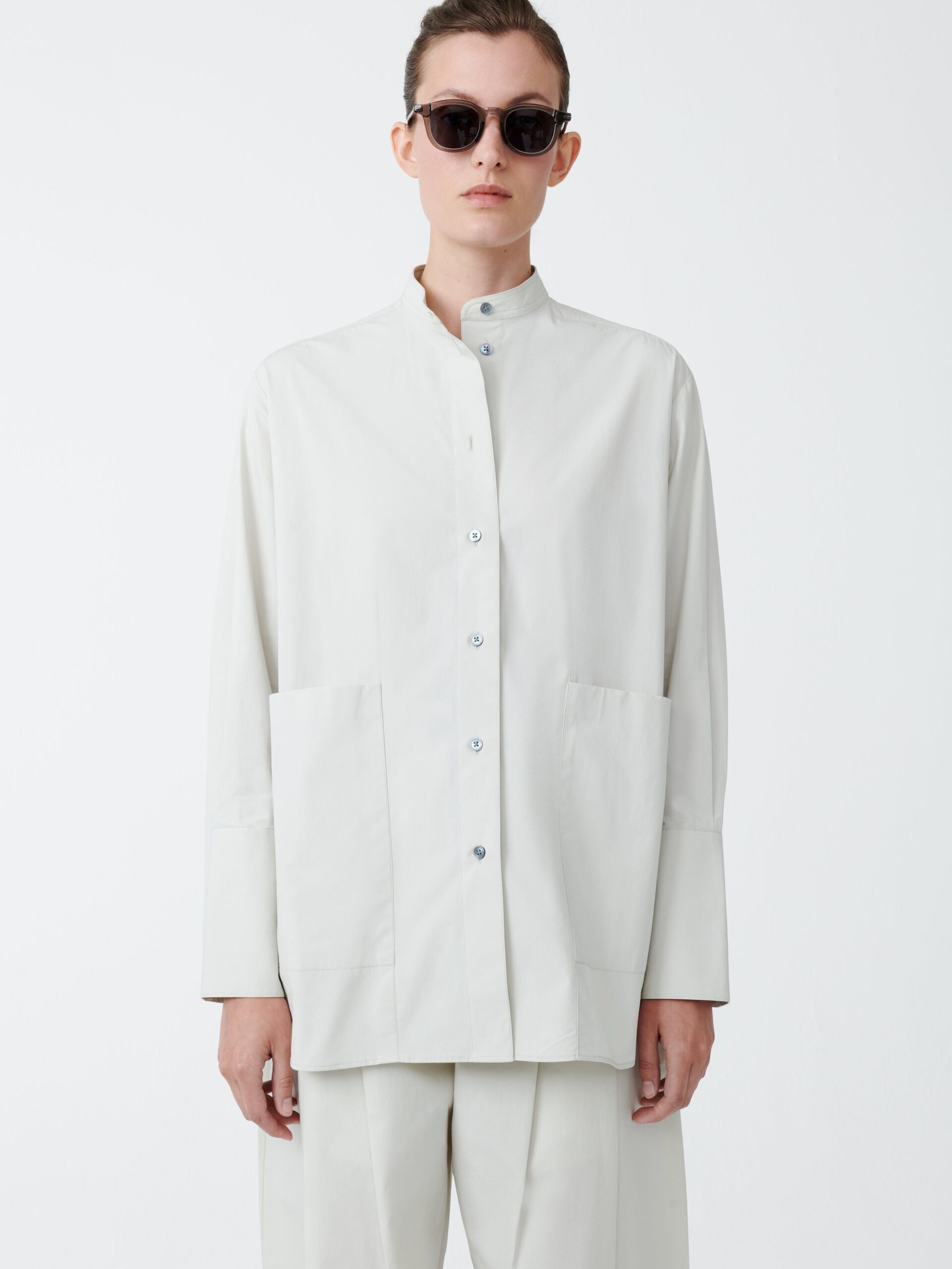 The Beek is a subtle twist on a classic collarless shirt, with elongated front patch pockets at the waist and double cuffs that can be worn open or fastened. It is made from a midweight cotton with a matte finish and a powdery hand feel.
