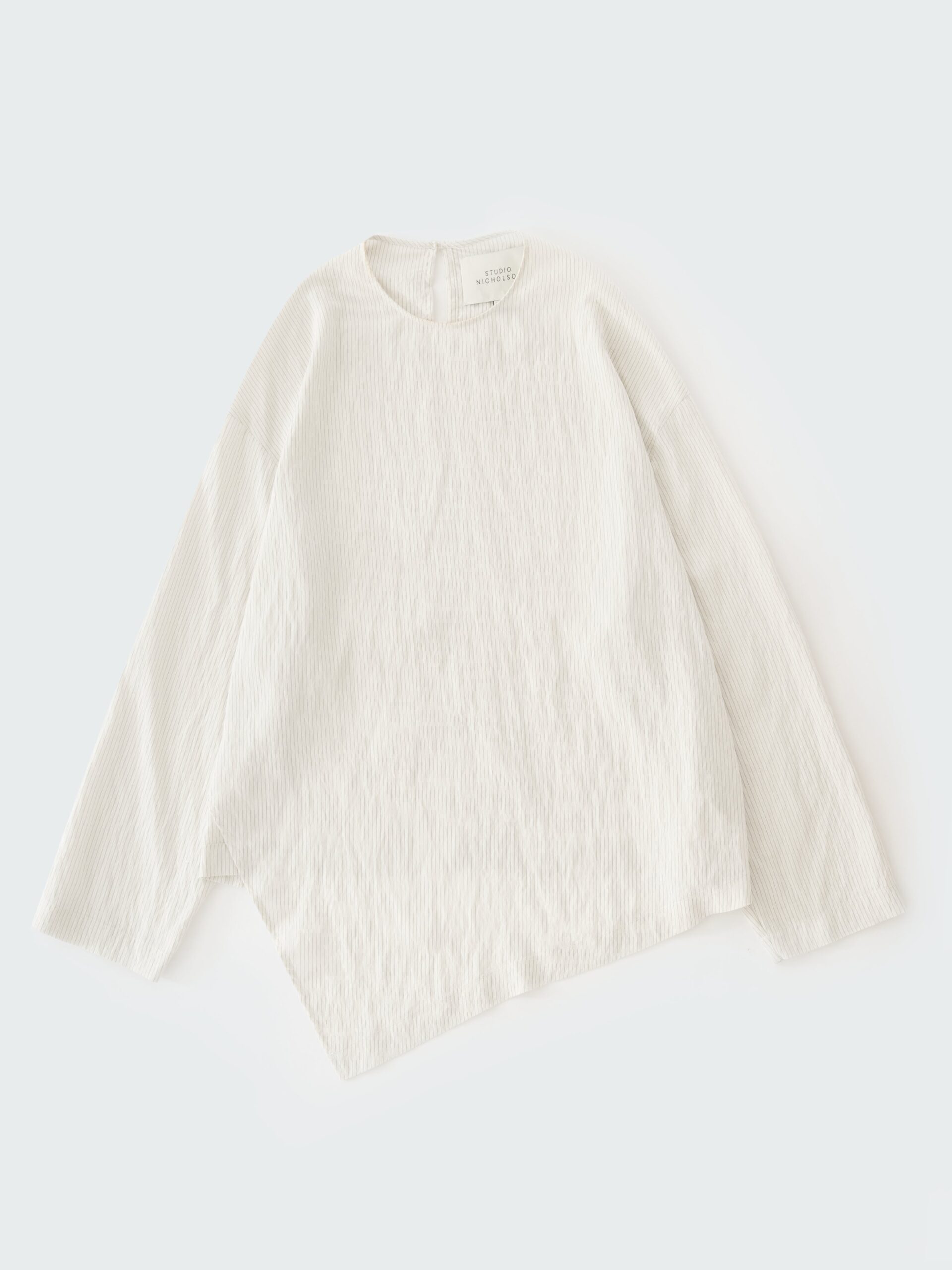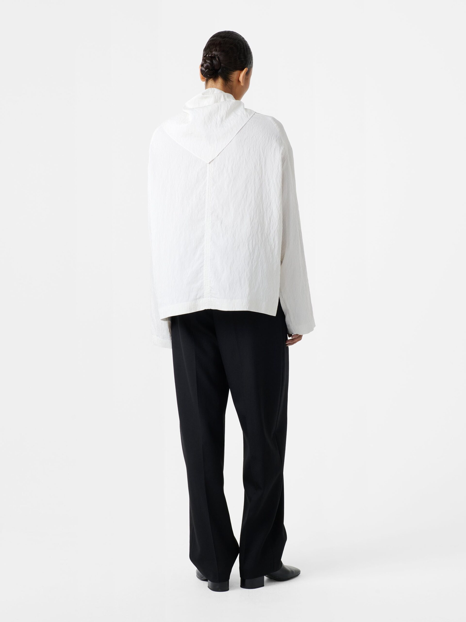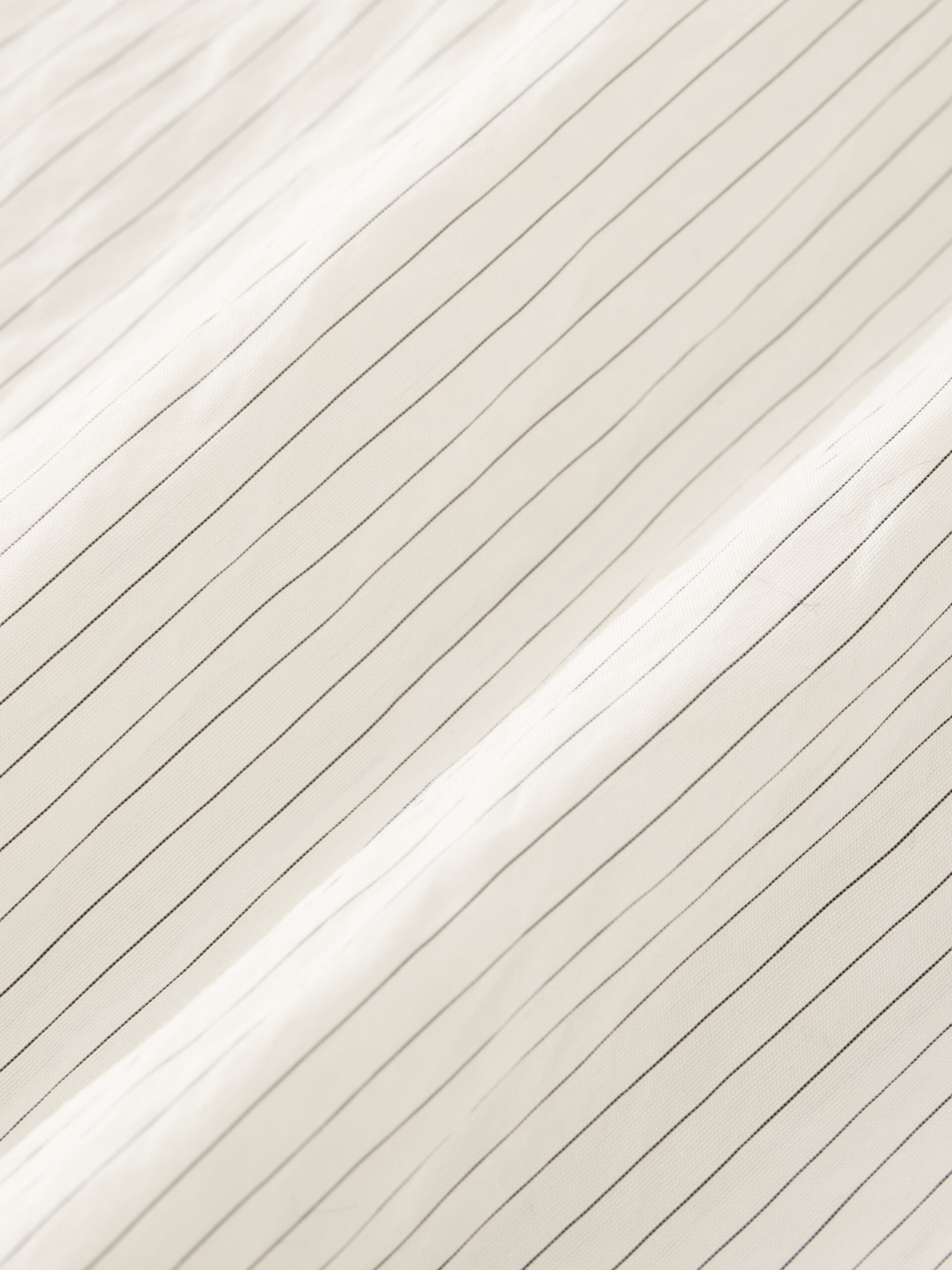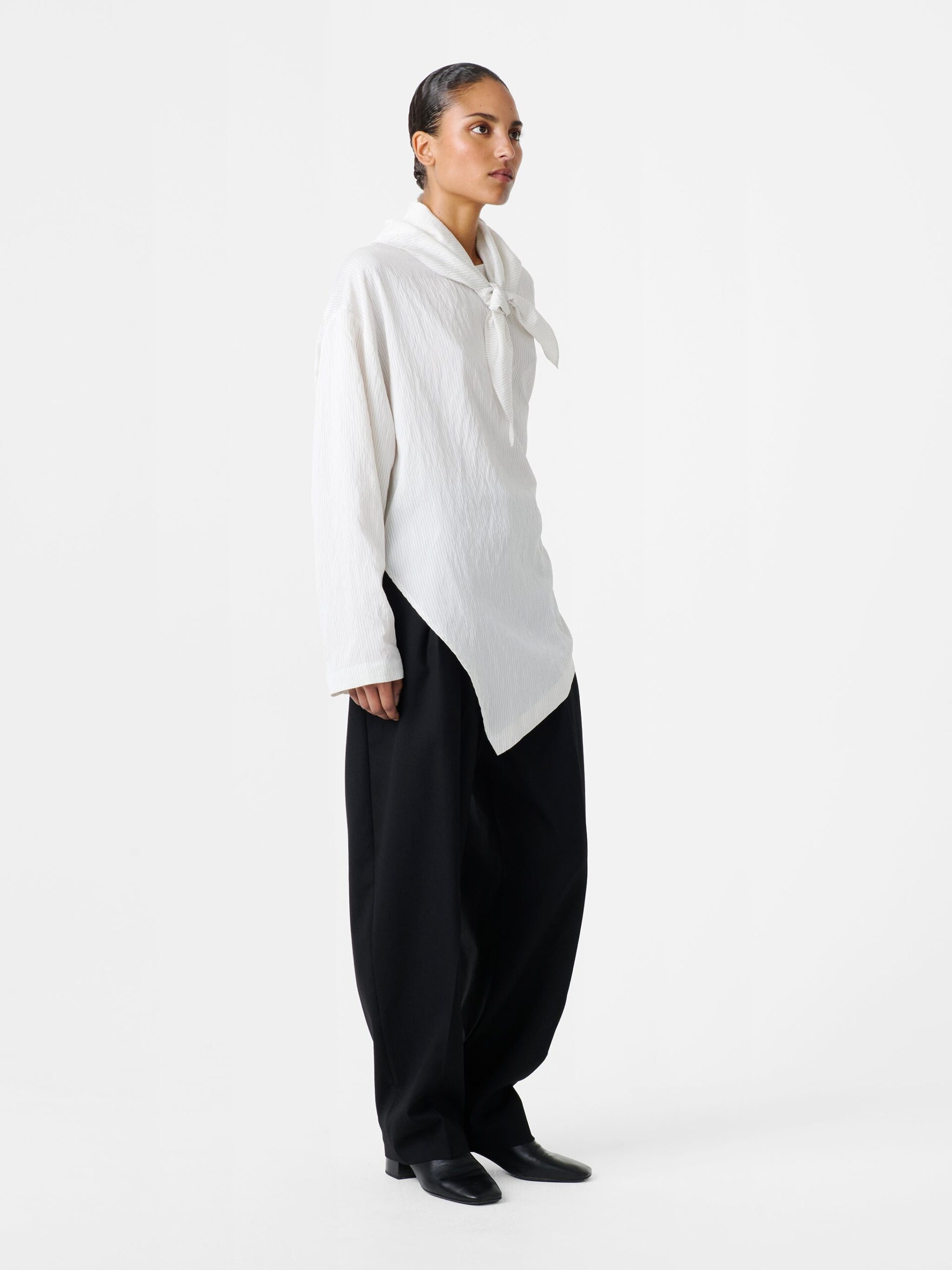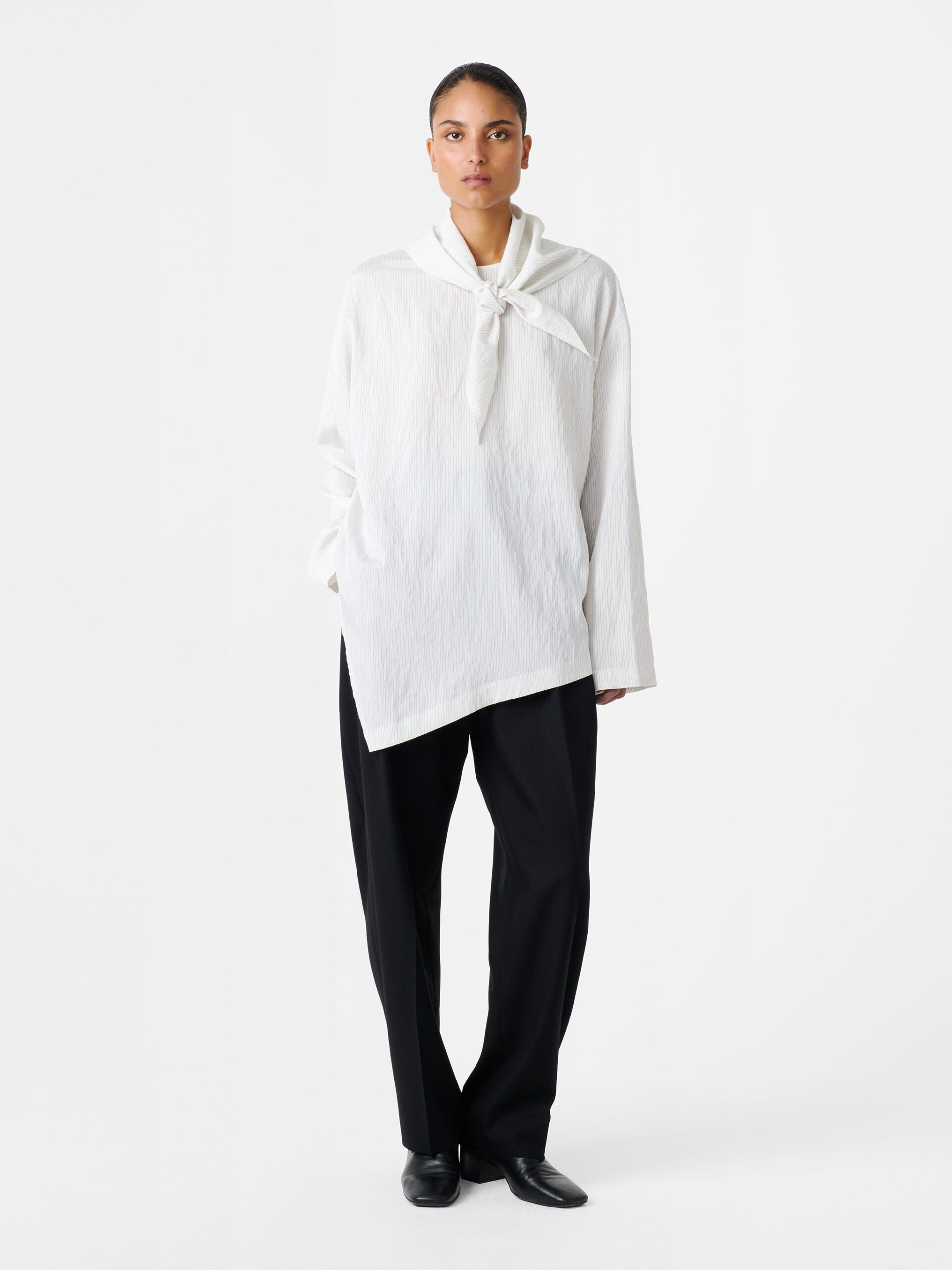 The Bute shirt is cut with an asymmetric front panel that falls softly over the body, embodying a relaxed feel that’s complemented by the detachable scarf. This striped style is cut from crisp poplin and is finished with neat straight cuffs.