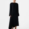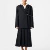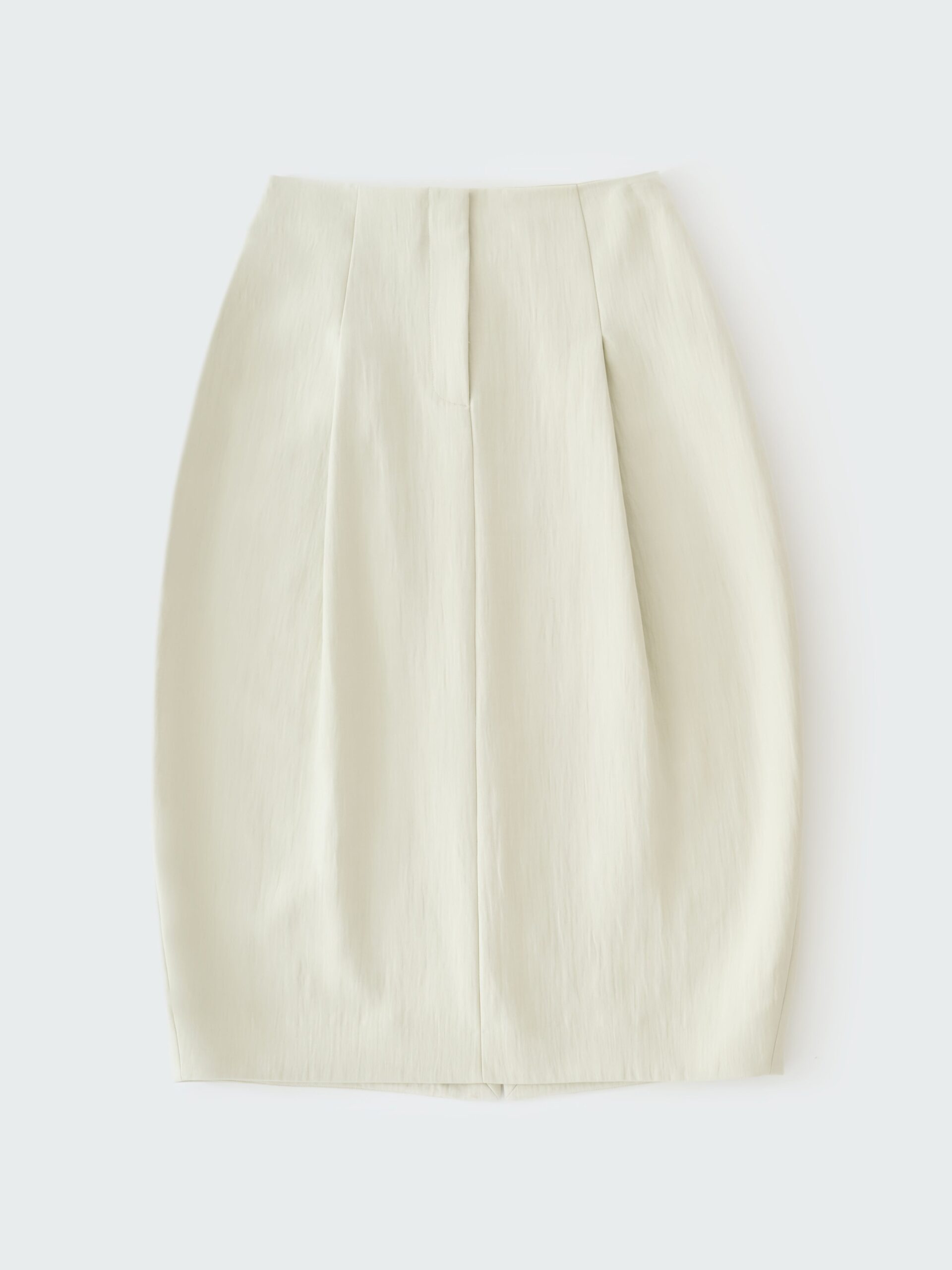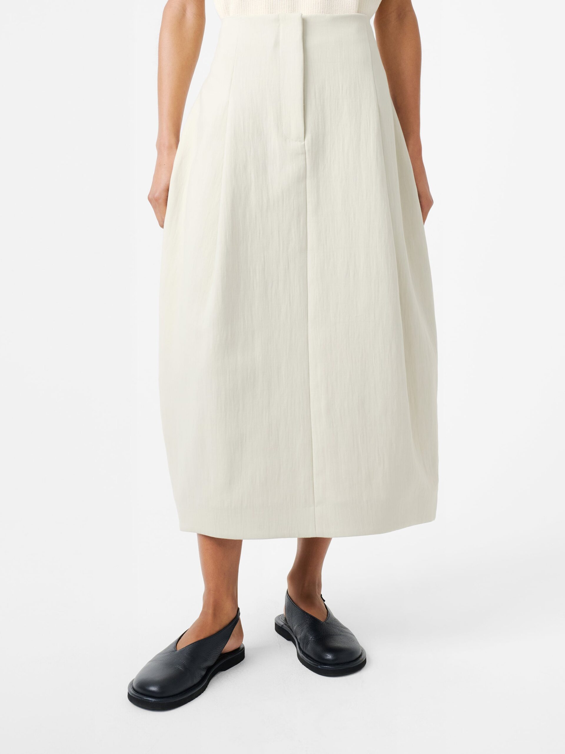 The Carson skirt is cut from a textured double cotton that’s woven to a twill weave, creating a soft structure that helps lend a sculptural bell-like shape to the silhouette. It has deep inverted pleats that are cleverly folded to create extra volume and which also draw the eye down to a thick folded midi hem that stops at the calf.