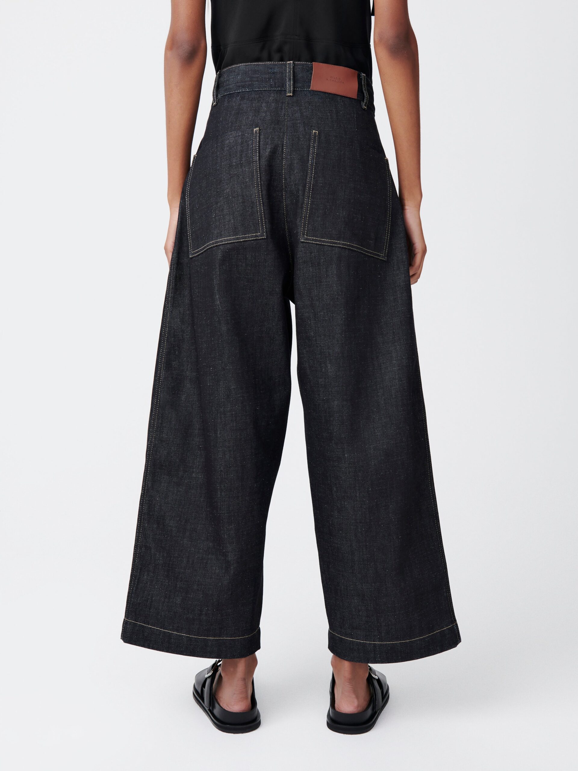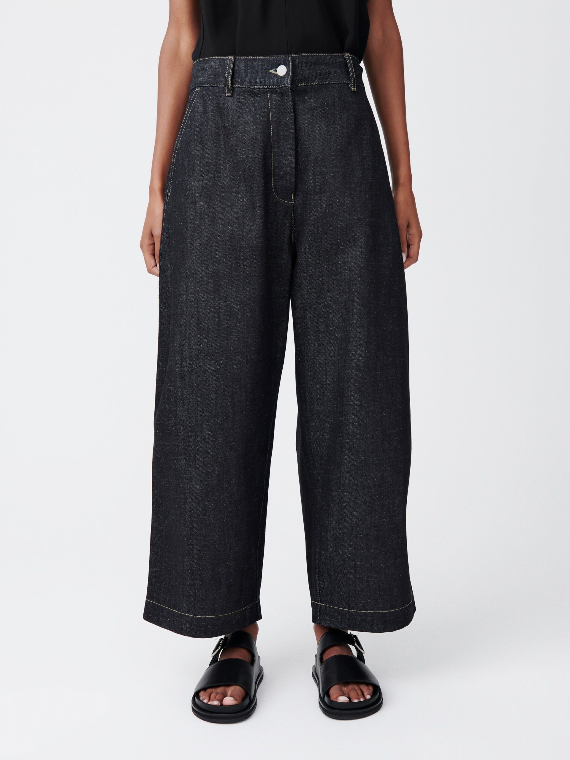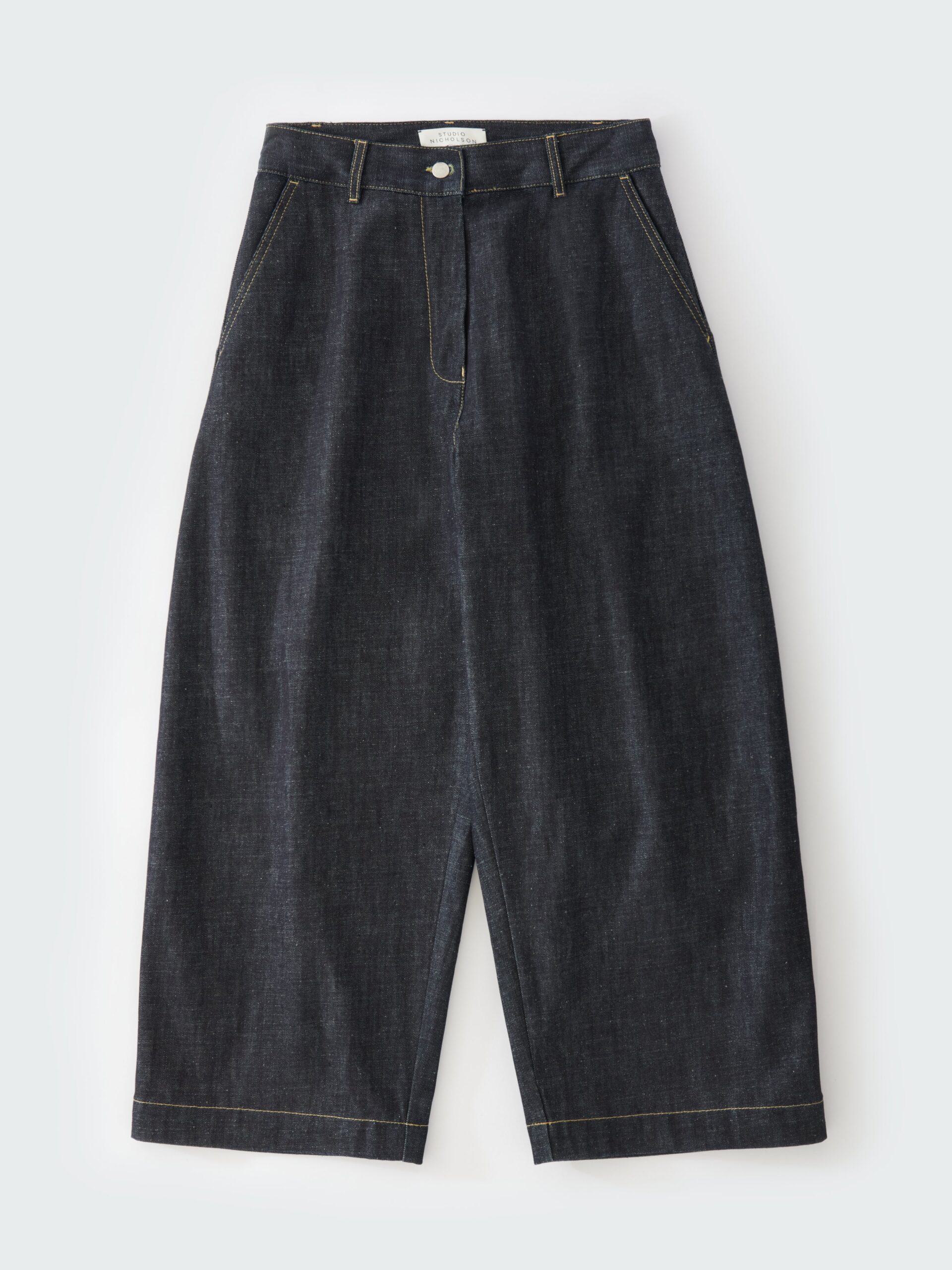 A true SN staple from season to season, our Chalco pants are cut wide and cropped, with a curved leg and dropped crotch. Here they are constructed from a recycled denim.