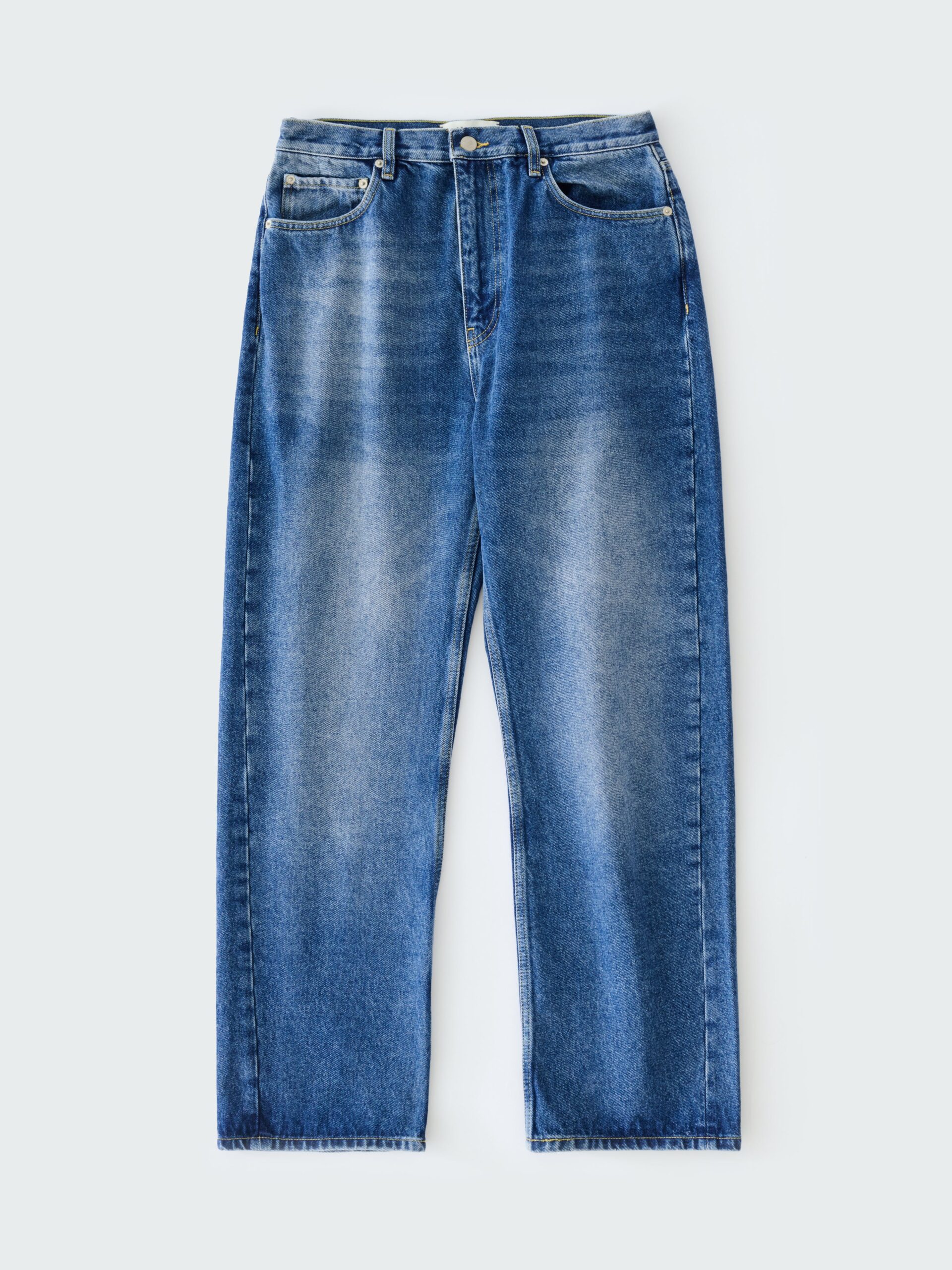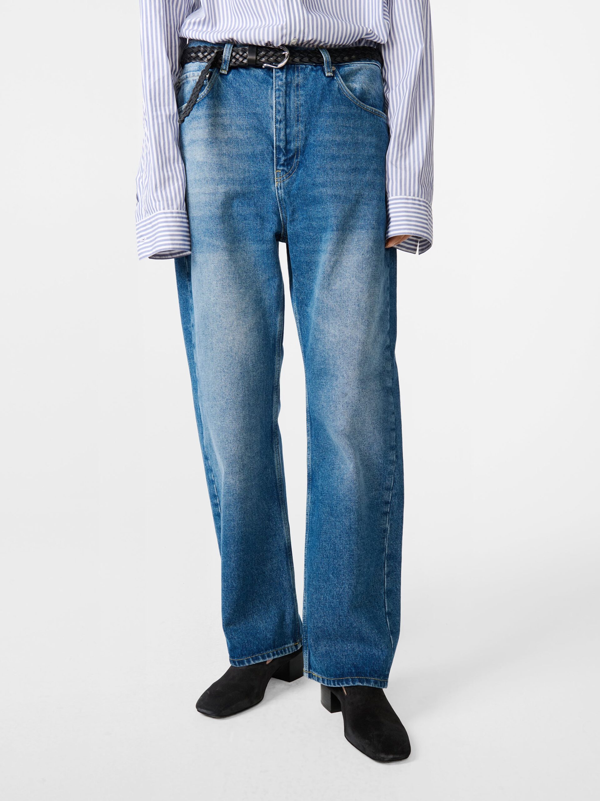 The Denjo jeans have a wide leg that’s softly shaped with a forward seam, creating an ergonomic fit that feels relaxed and wearable. This pair is cut from denim woven with regenerative cotton in a rich washed-indigo shade.