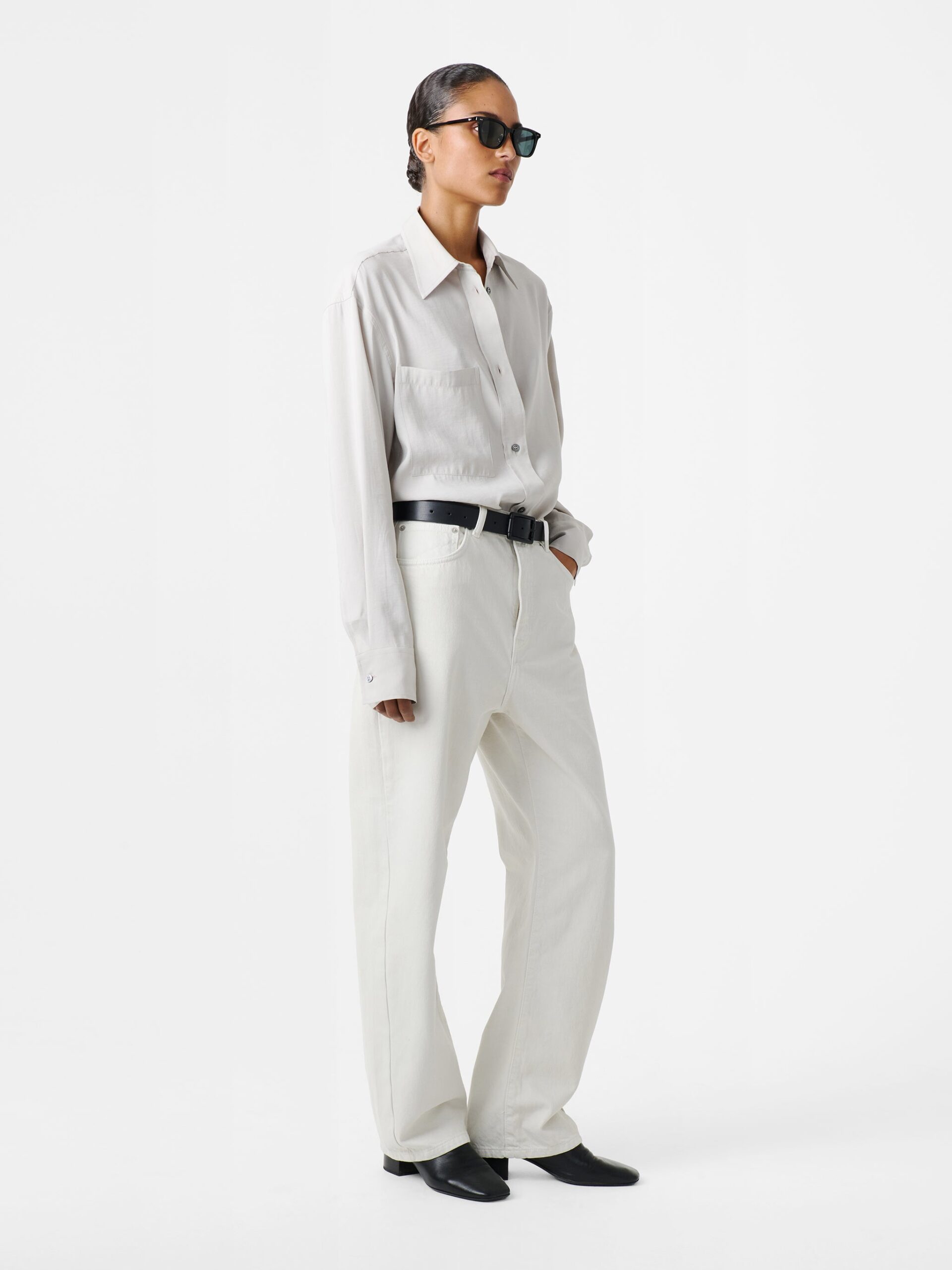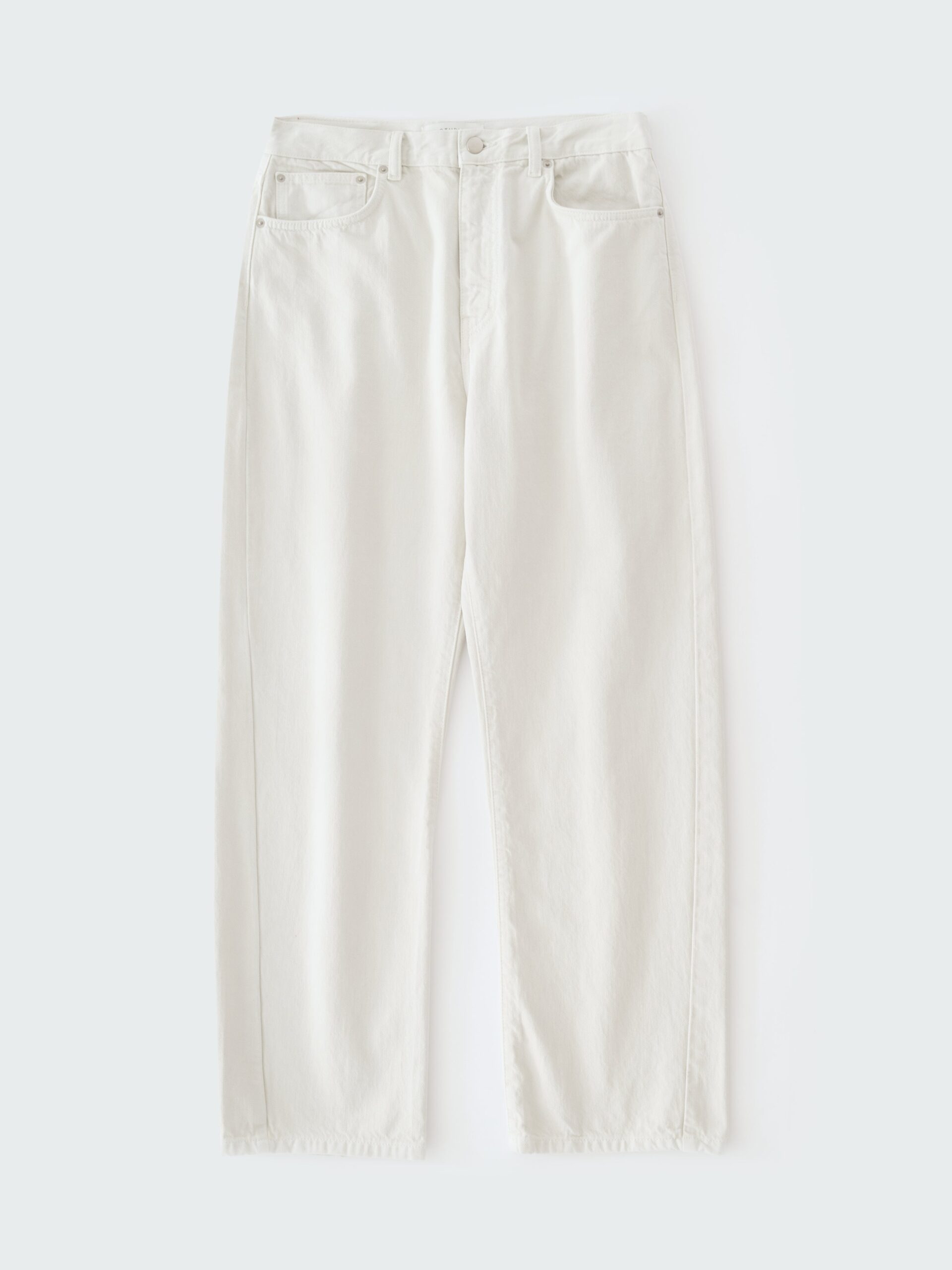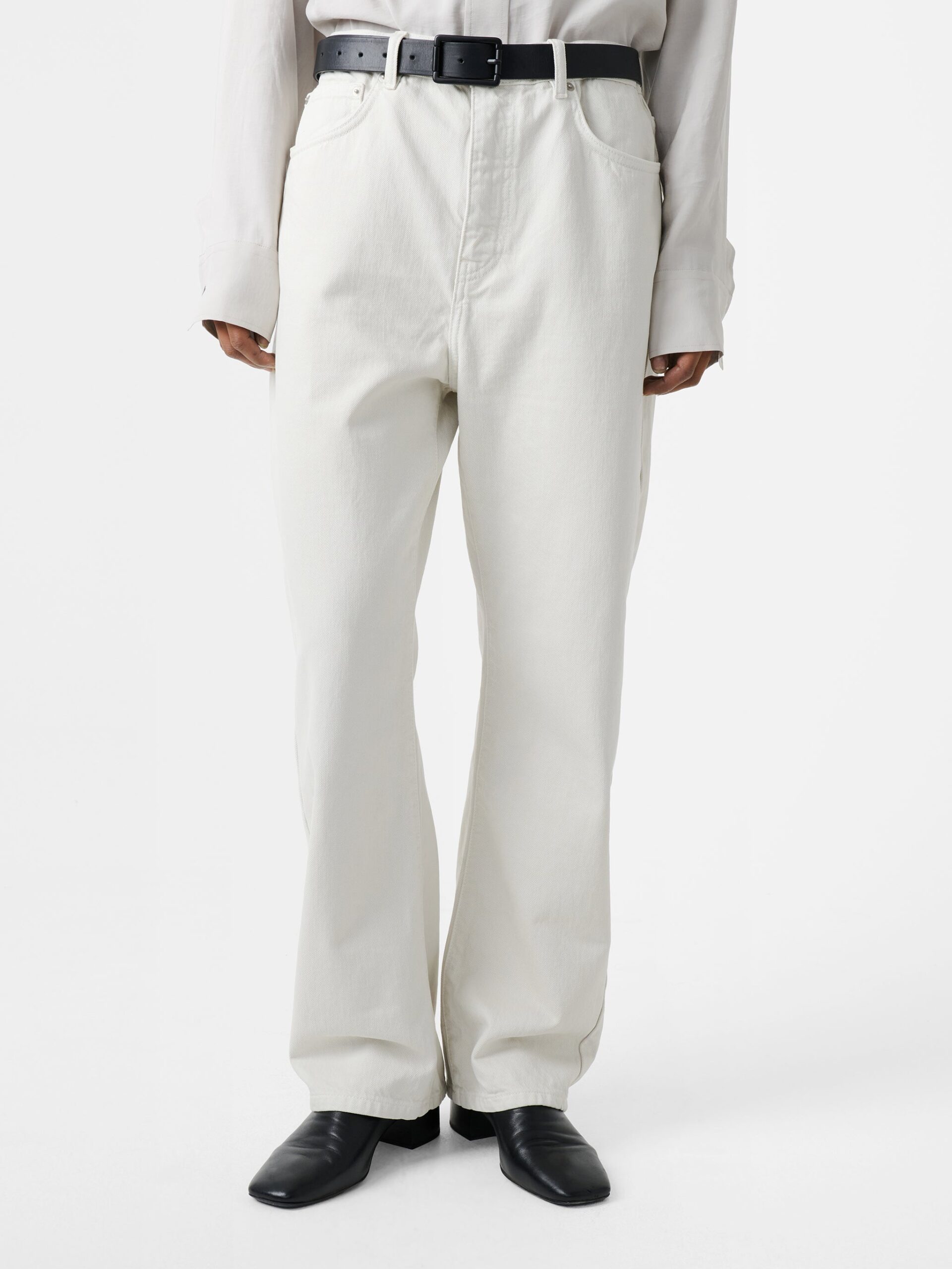 The Denjo jeans have a wide leg that’s softly shaped with a forward seam, creating an ergonomic fit that feels relaxed and wearable. This pair is cut from cotton denim that’s garment-dyed in neutral ice shade.