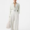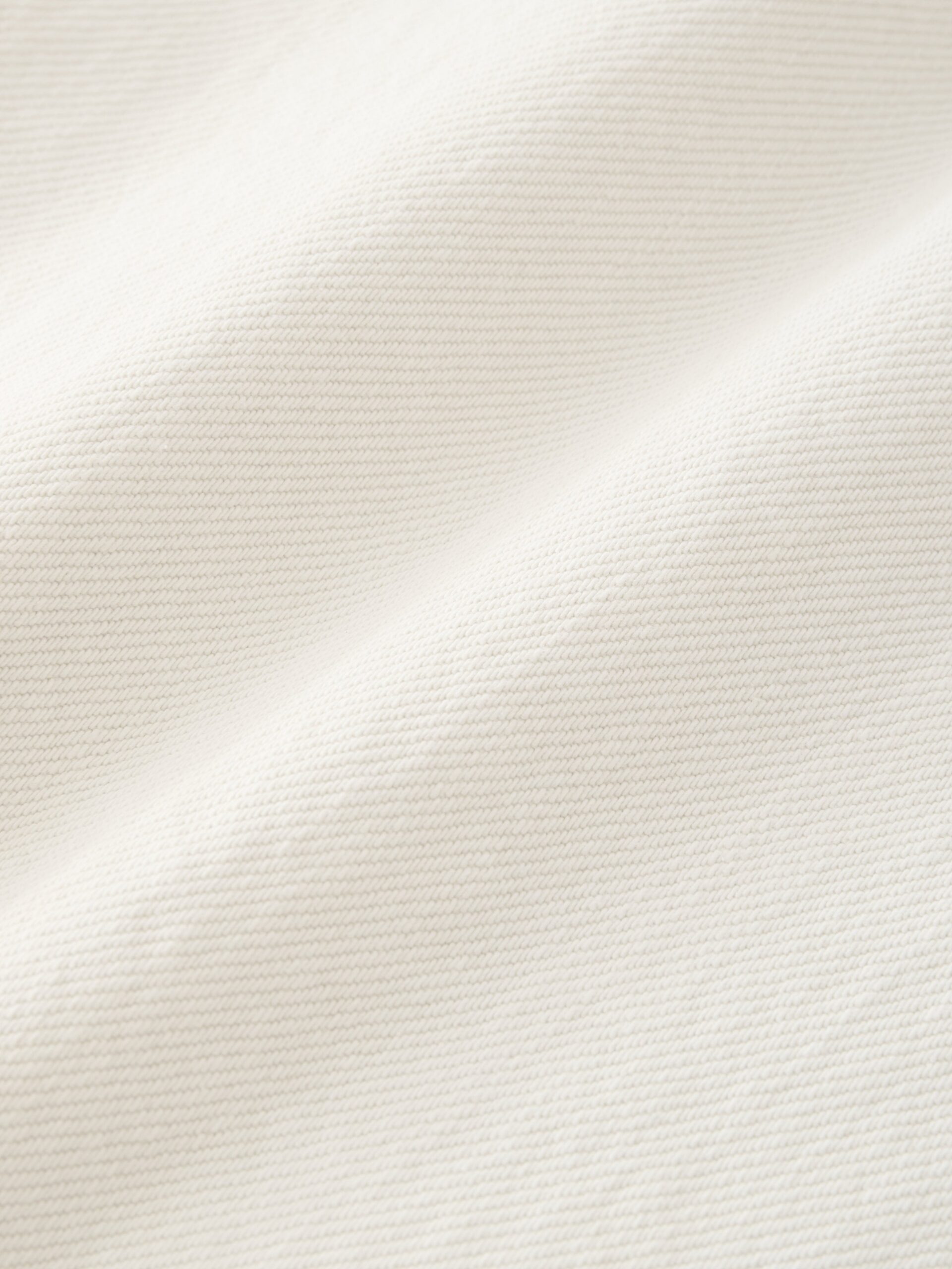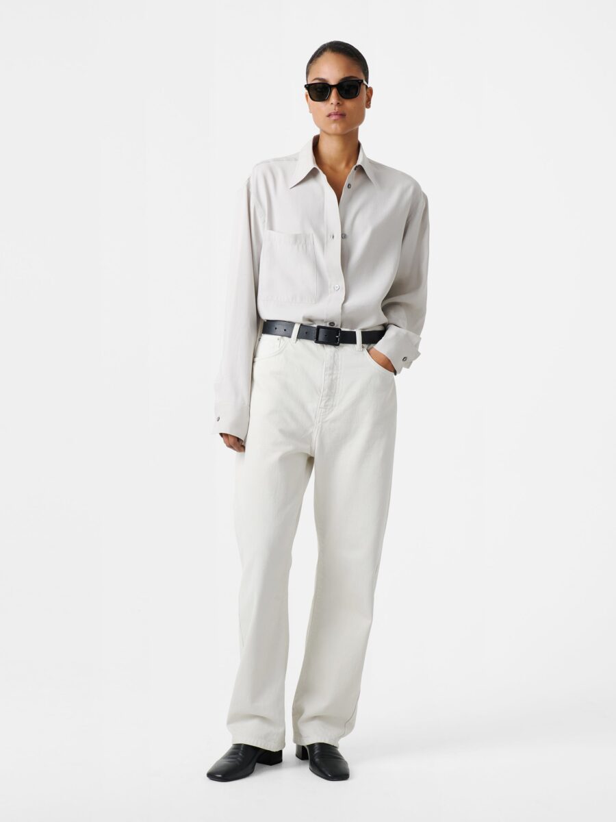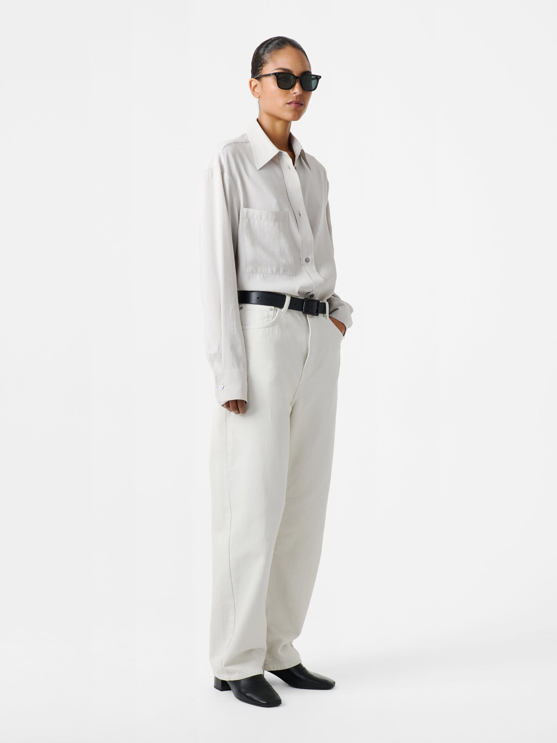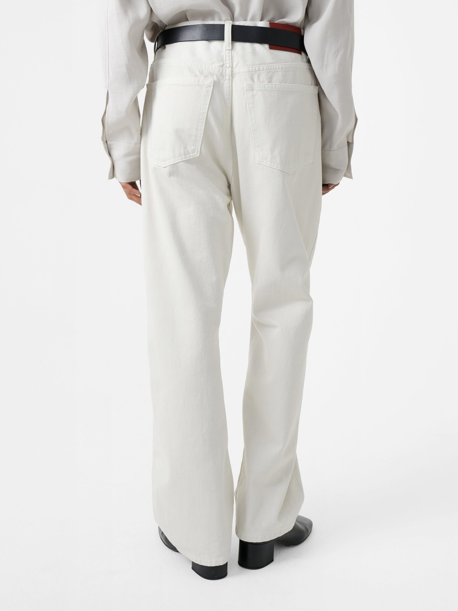 The Denjo jeans have a wide leg that’s softly shaped with a forward seam, creating an ergonomic fit that feels relaxed and wearable. This pair is cut from cotton denim that’s garment-dyed in neutral ice shade.