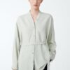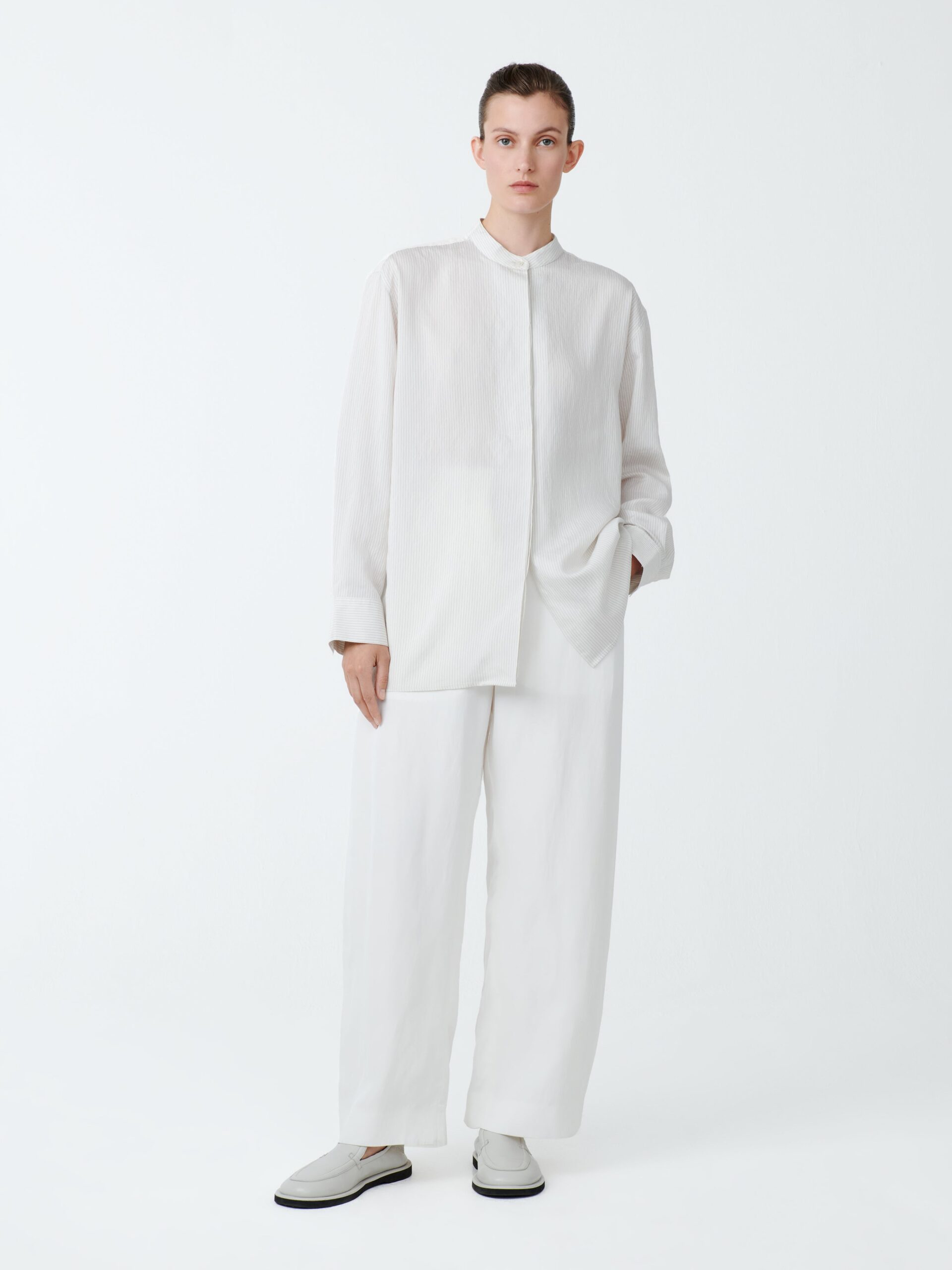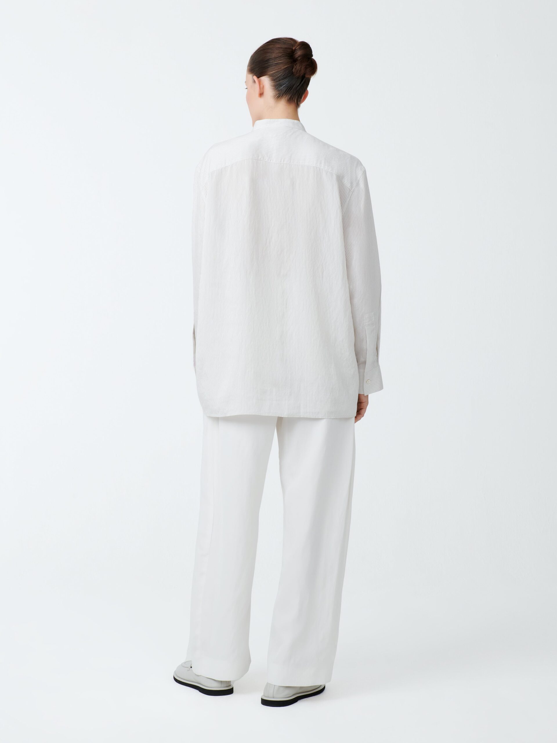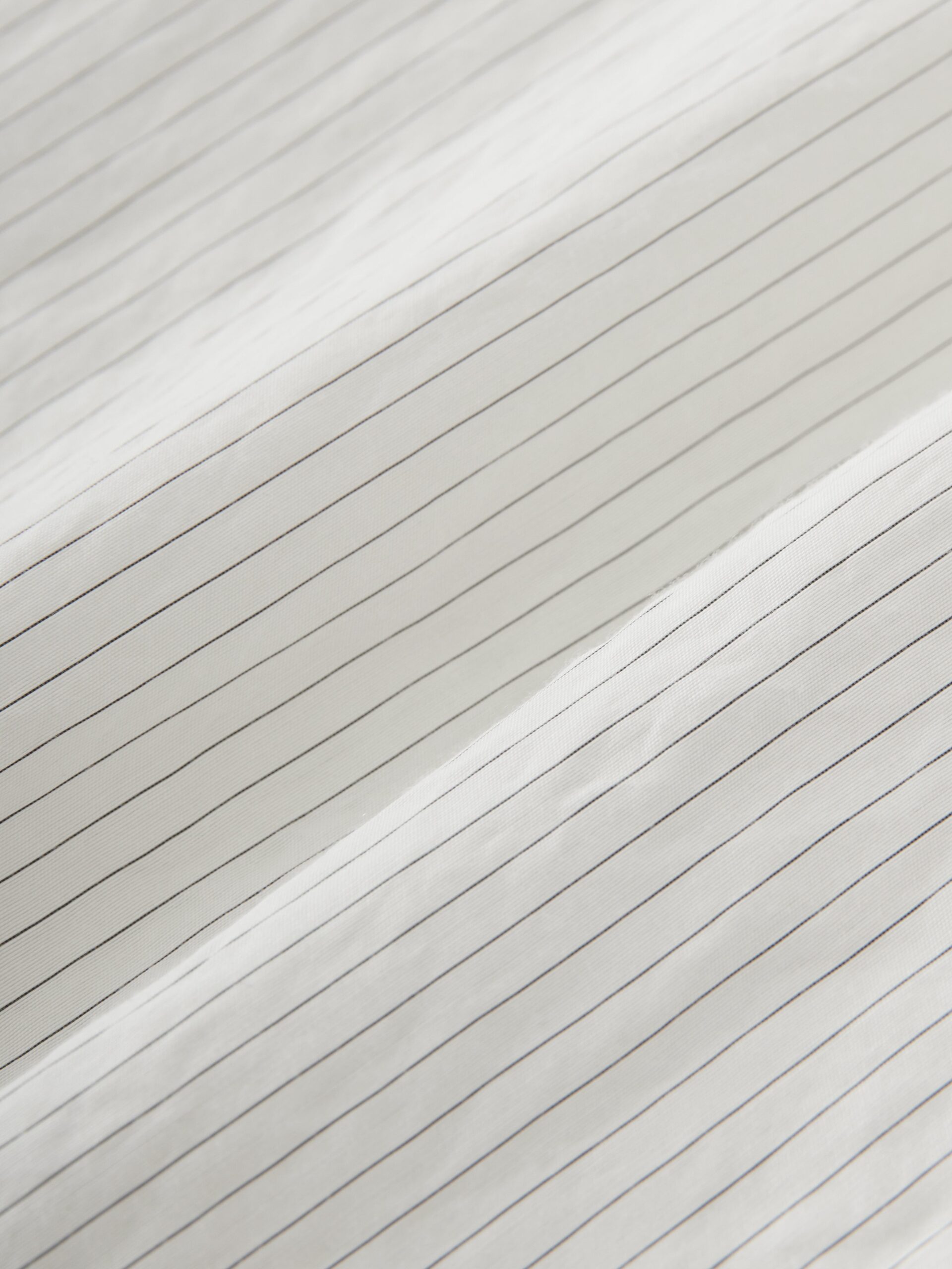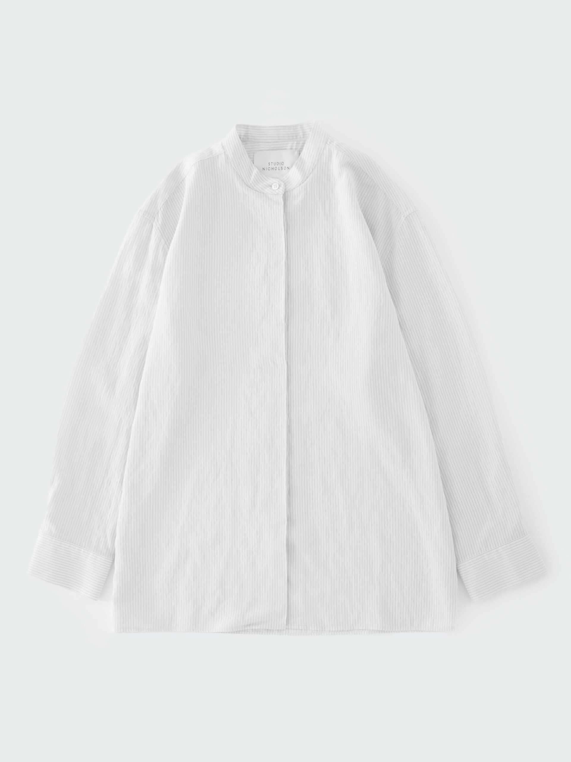 The lightweight Faber shirt is woven in a fine black-and-white crinkle fine stripe fabric that’s unique to Studio Nicholson, and has a washed, gently textured hand feel. Its clean and simple aesthetic is thanks to a concealed front placket and minimal topstitching.