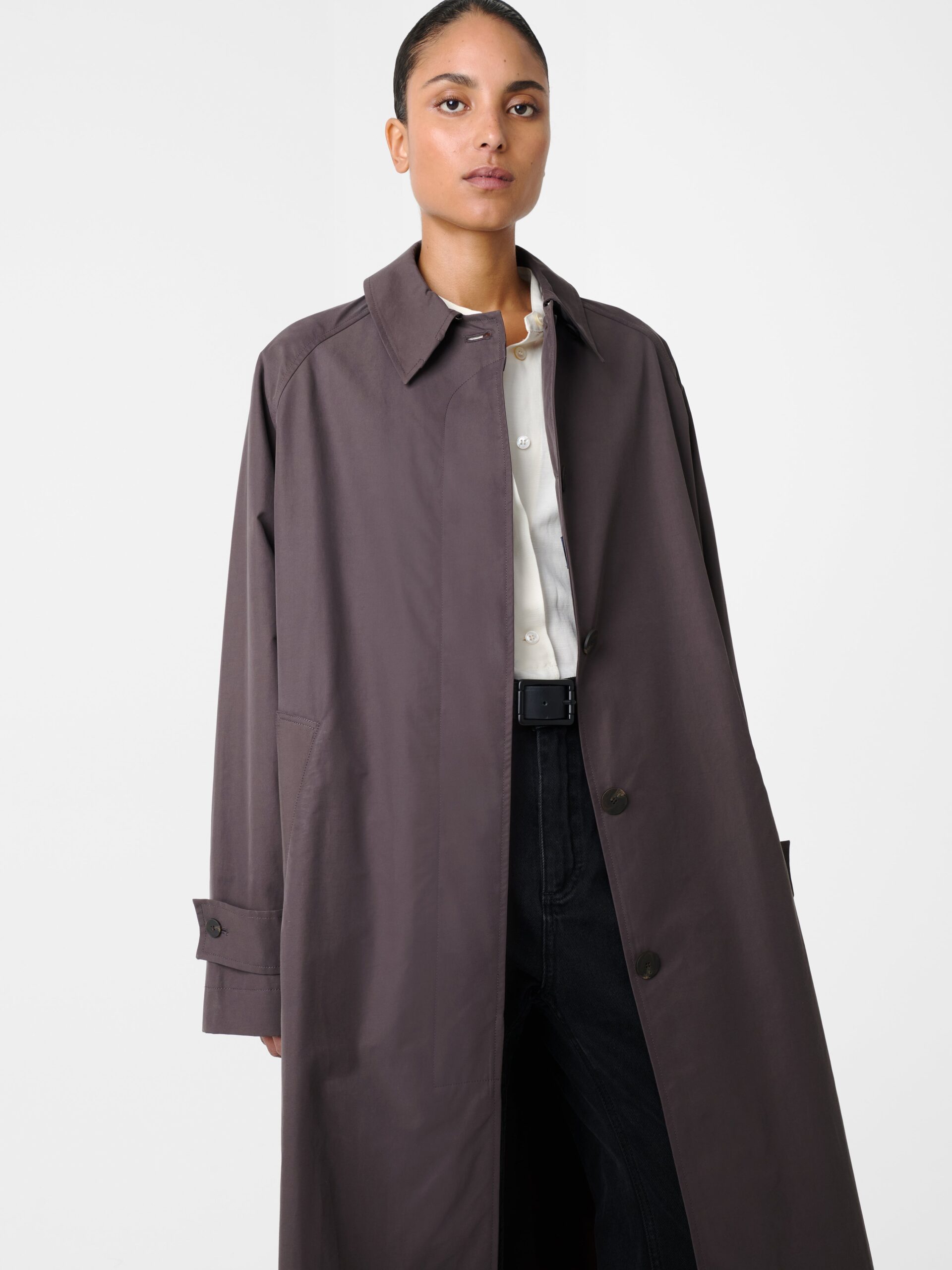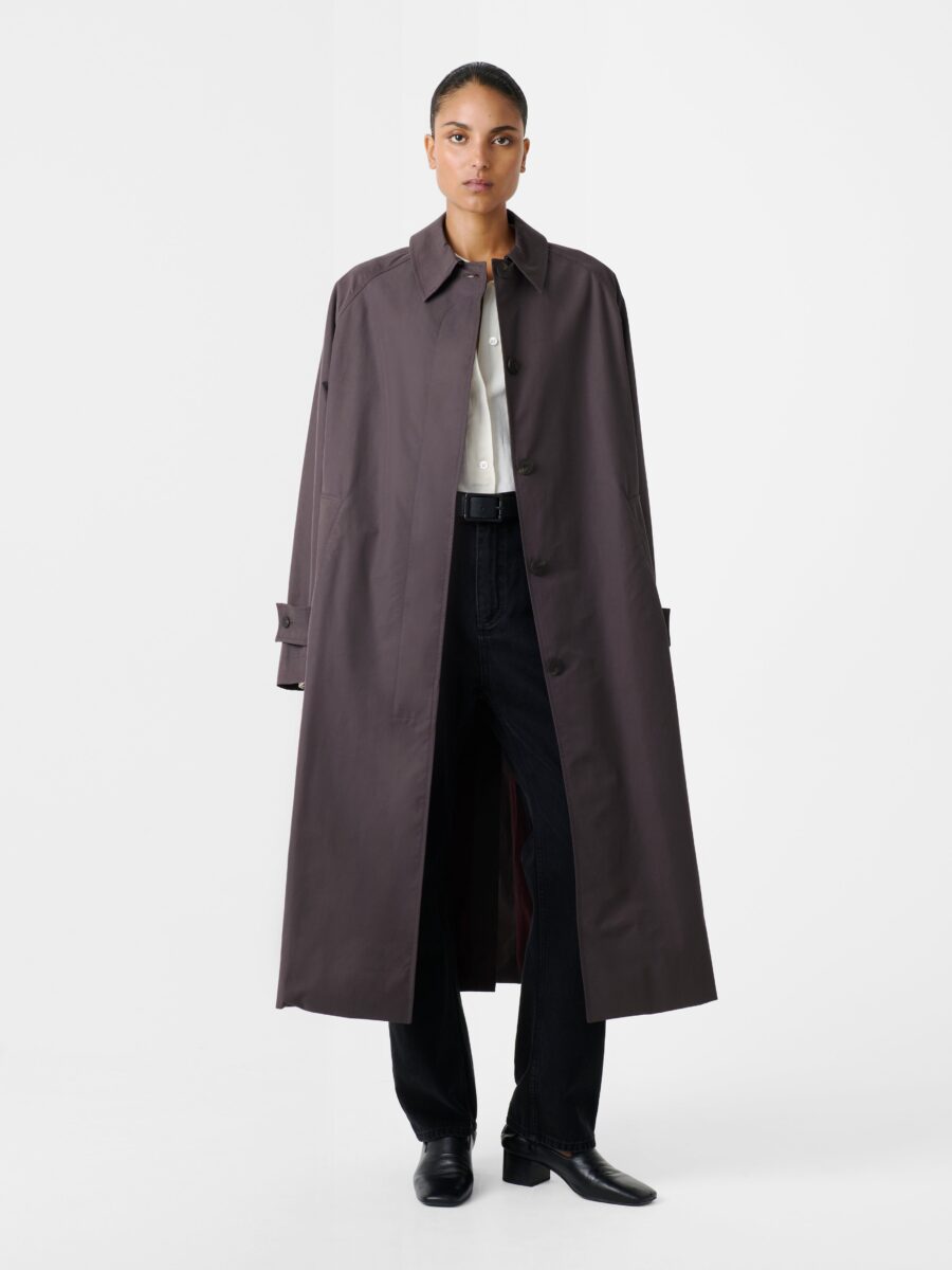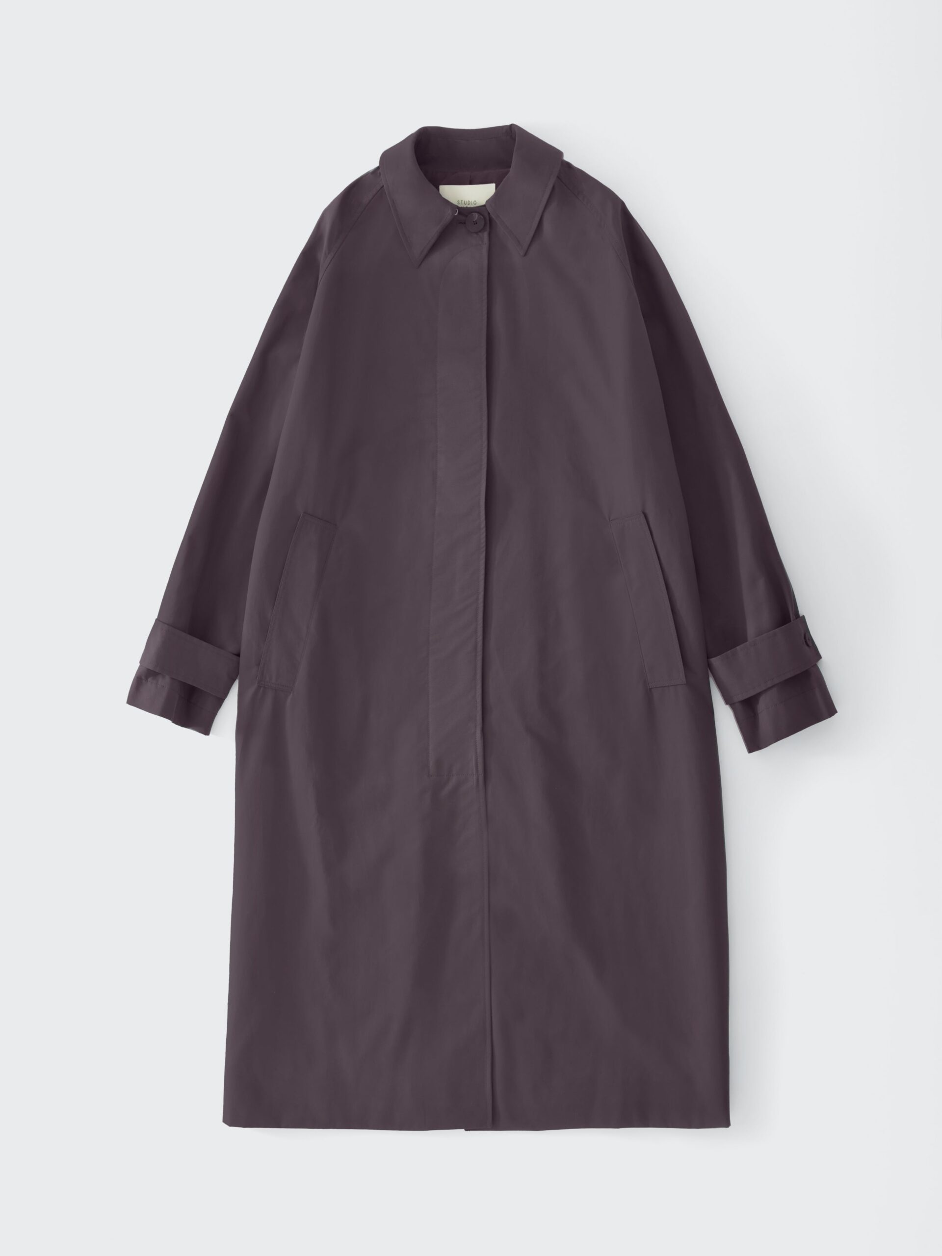 A loving tribute to classic trench coats, Holin’s raglan shoulder and full, voluminous cut make it a sophisticated outerwear choice that’s easy to style. The lightweight fabric is a crisp, performance-style cotton and nylon blend that’s woven to a very fine twill with a smooth handle and water repellent qualities. A true Studio Nicholson classic.