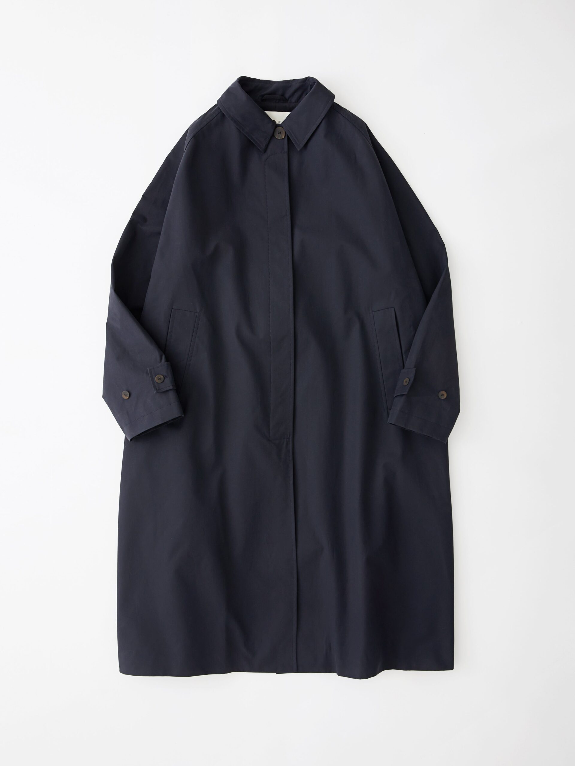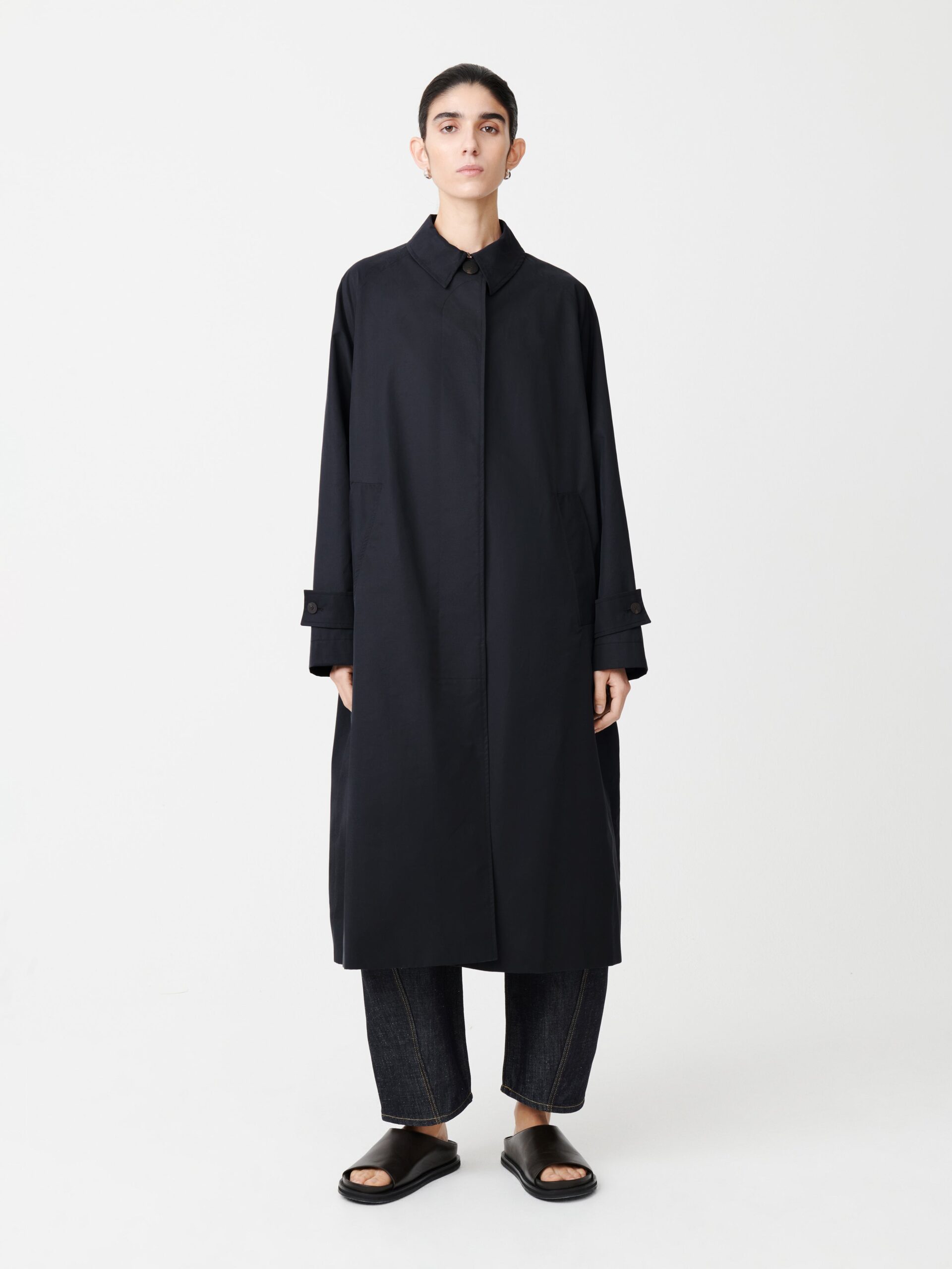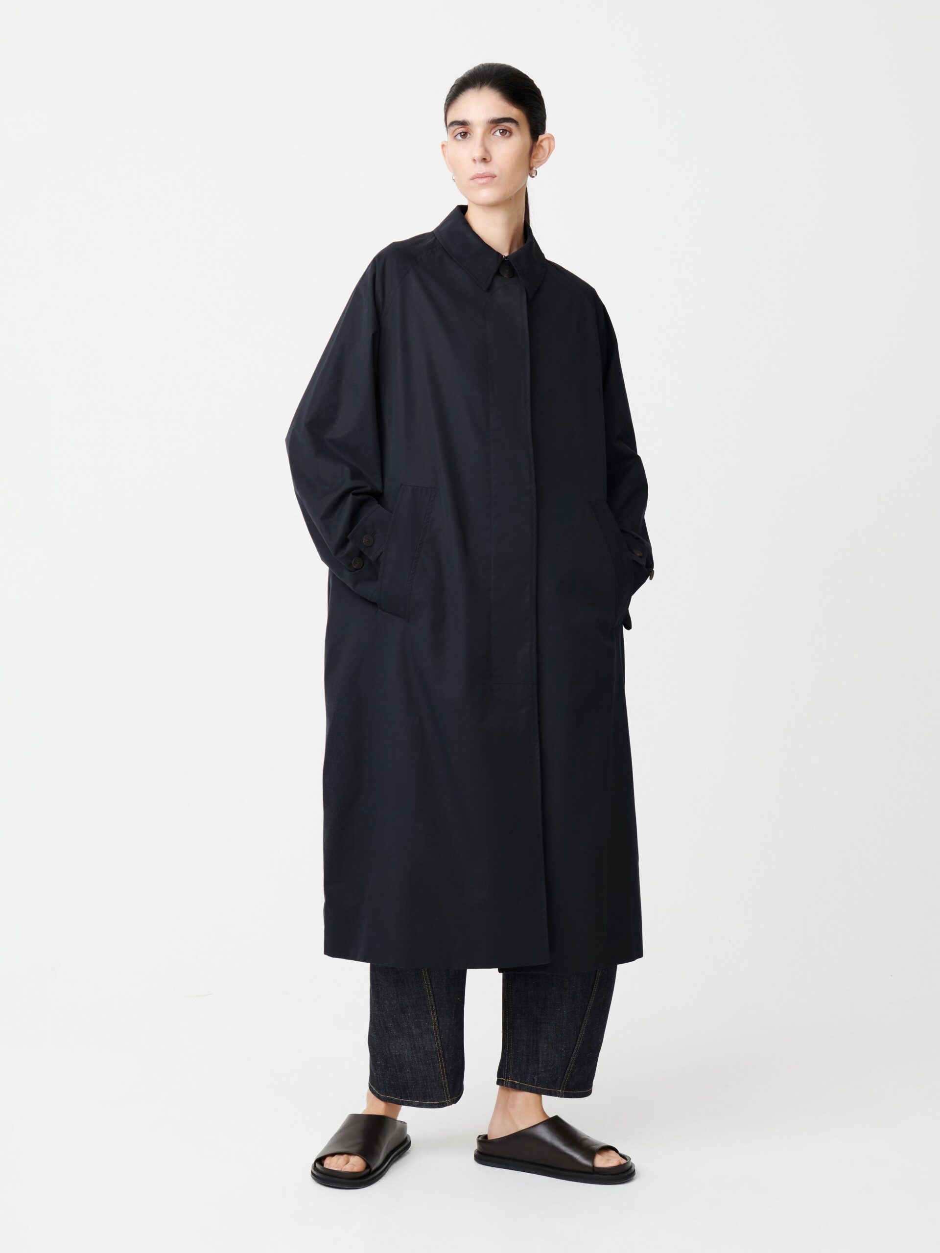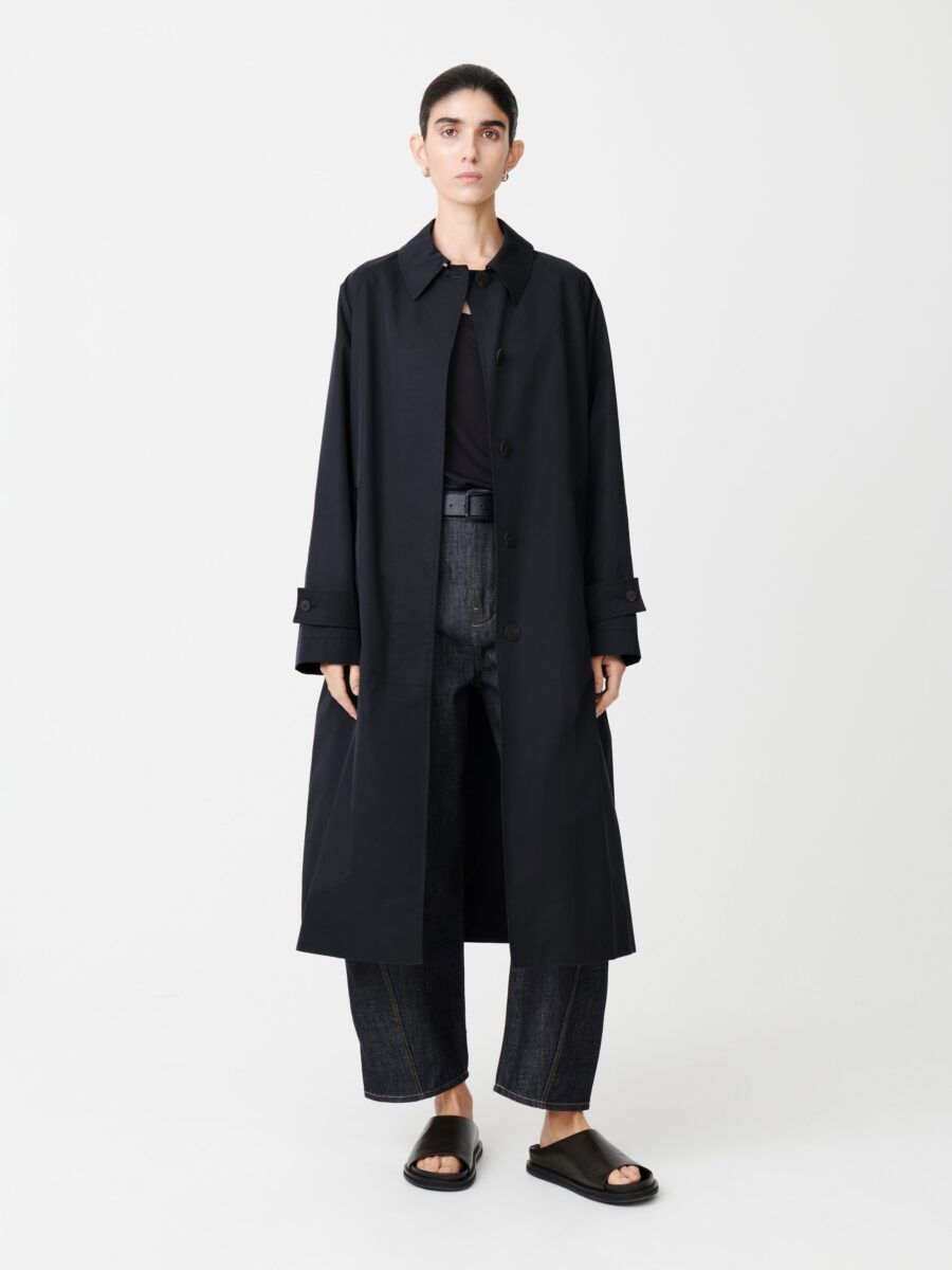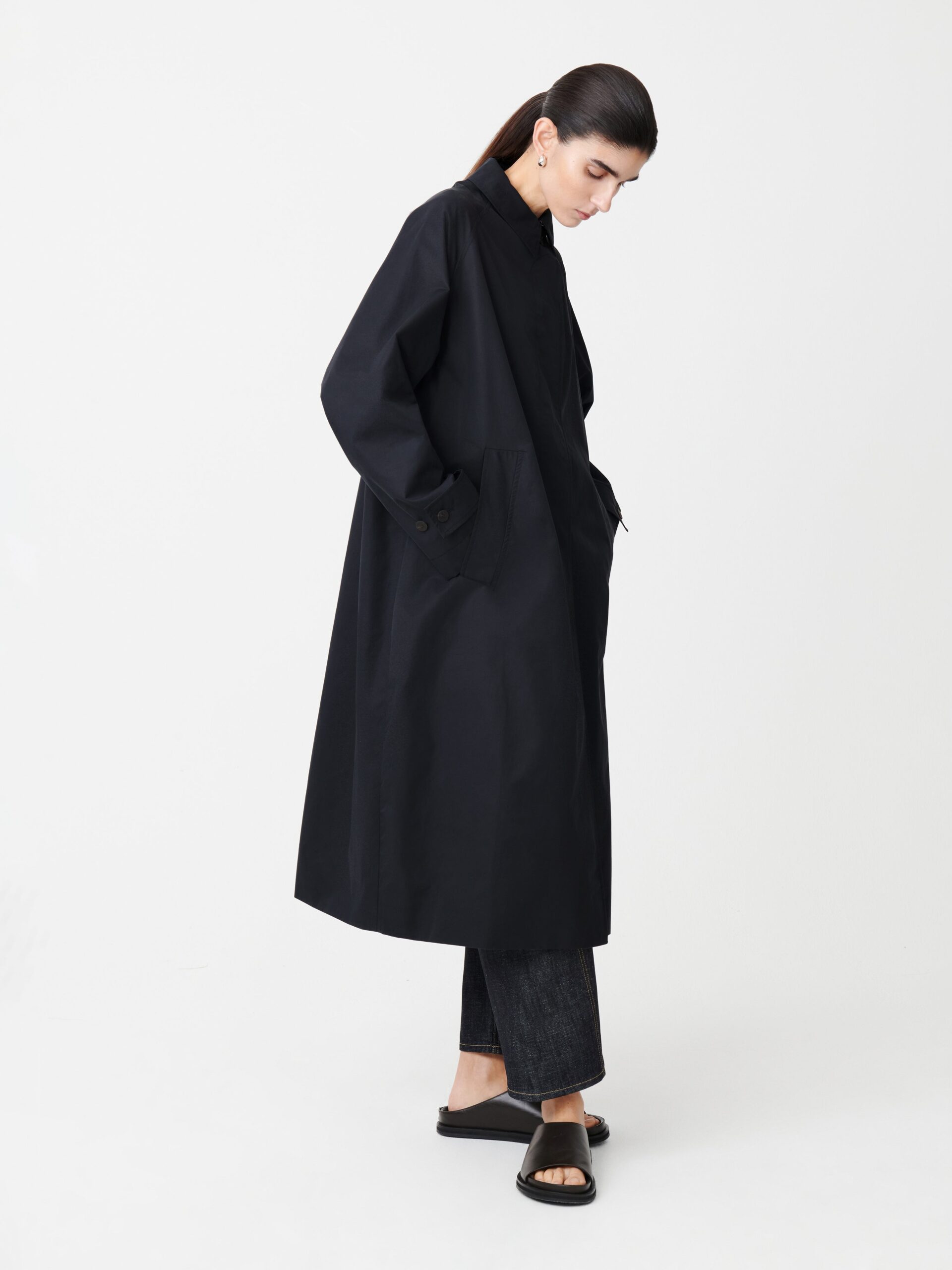 A loving tribute to classic trench coats, Holin’s raglan shoulder and full, voluminous cut make it a sophisticated outerwear choice that’s easy to style. The lightweight fabric is a crisp, performance-style cotton and nylon blend that’s woven to a very fine twill with a smooth handle and water repellent qualities. A true Studio Nicholson classic.