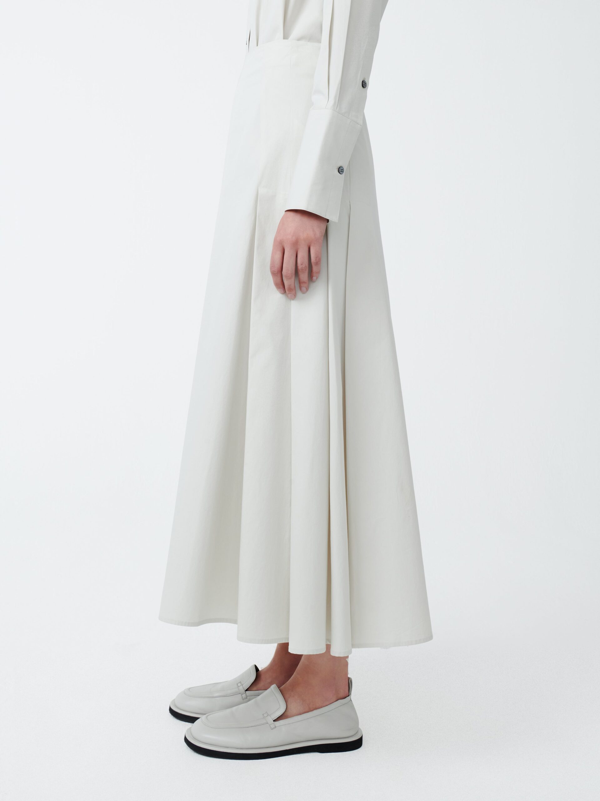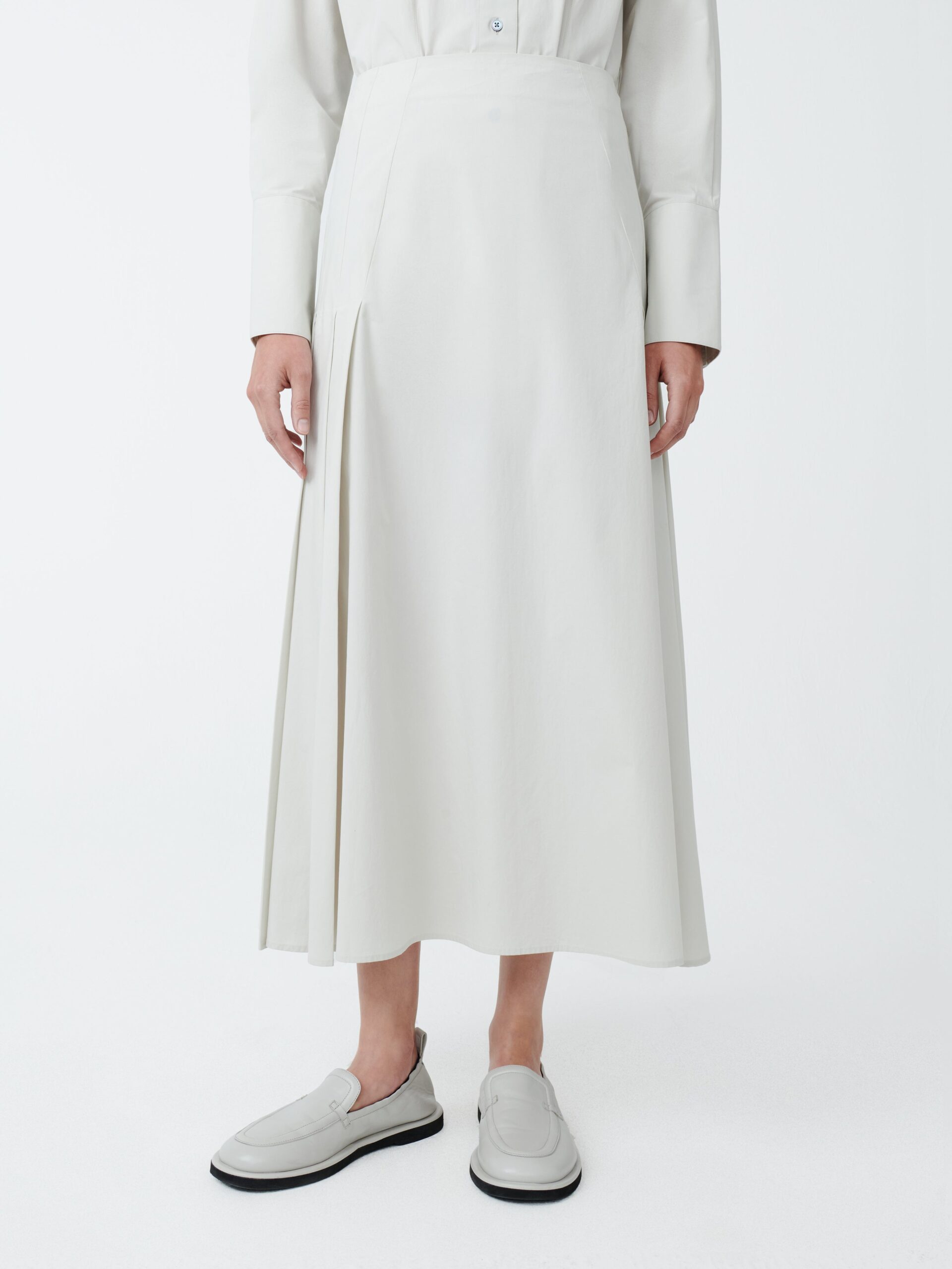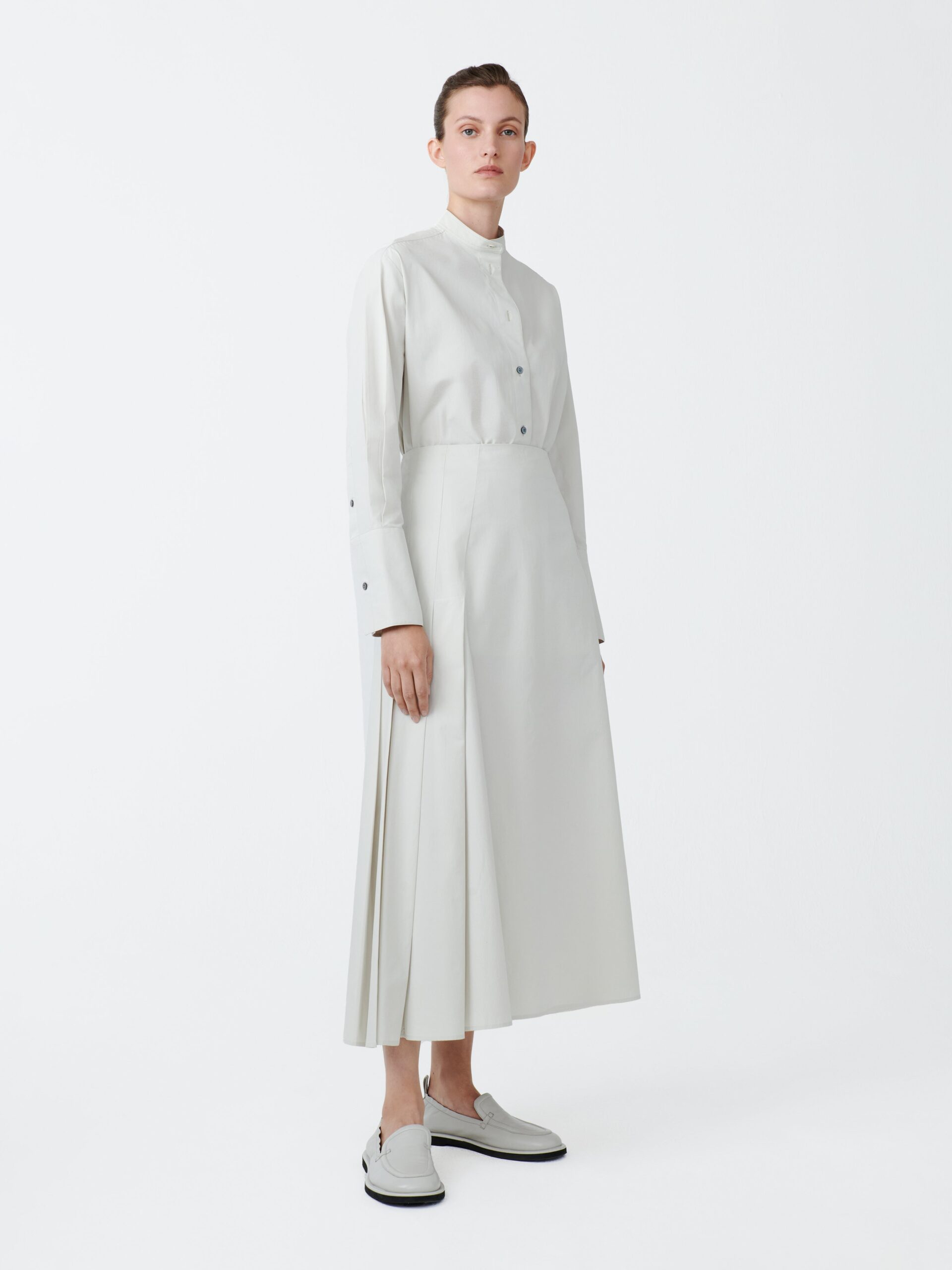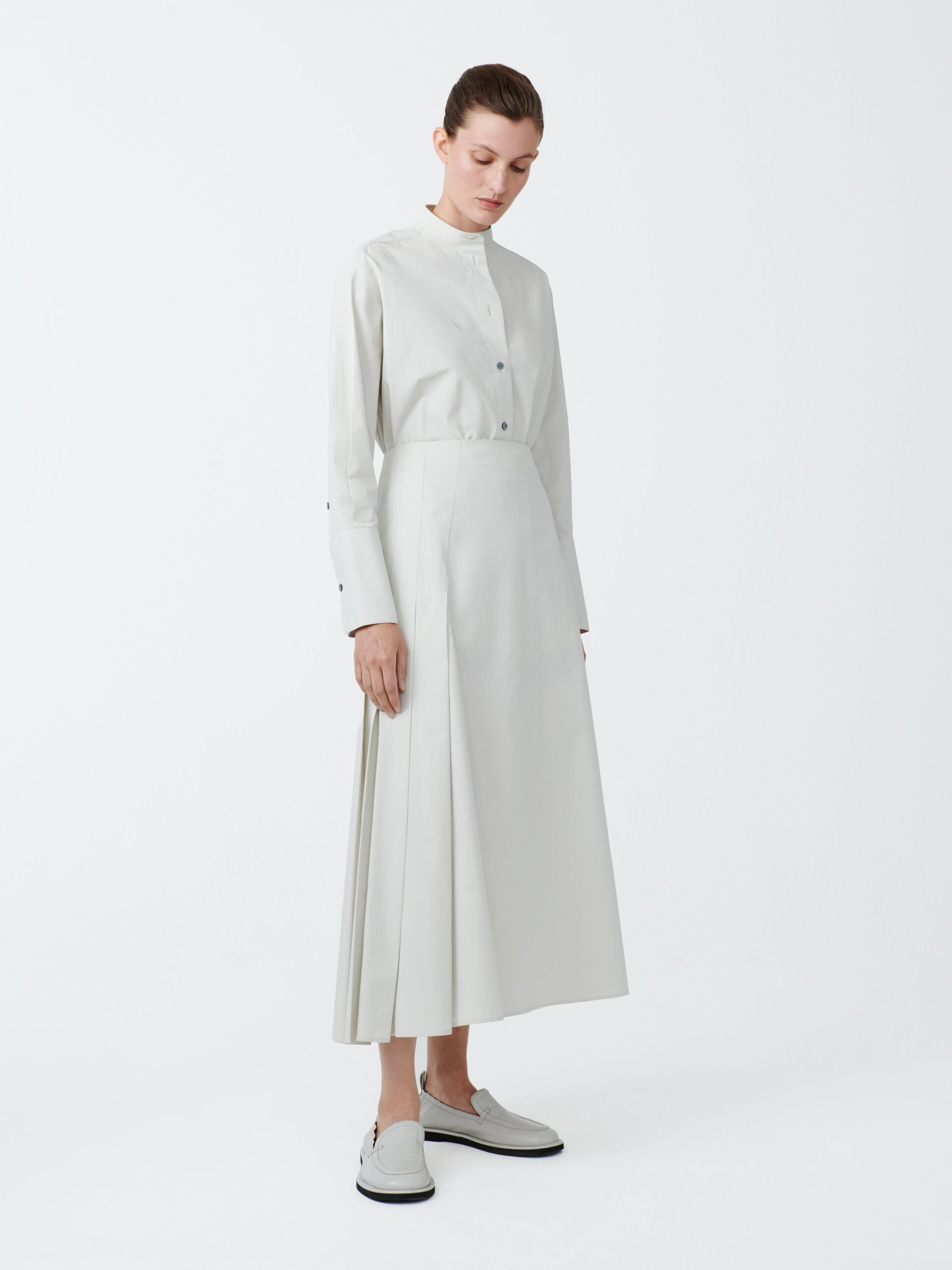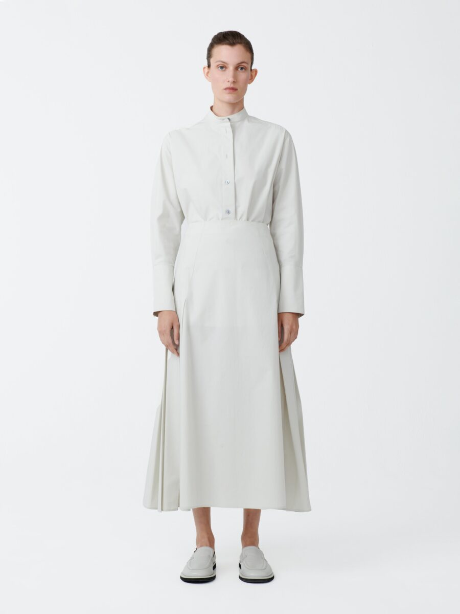 The Lawson has a feminine silhouette, with long lines and plenty of movement. It has a relaxed drape, emphasised by classic ‘knife’ pleating on the side seams, while remaining flat at the front and back. It is made from our signature mid-weight cotton; soft, with a matte, powdery finish.