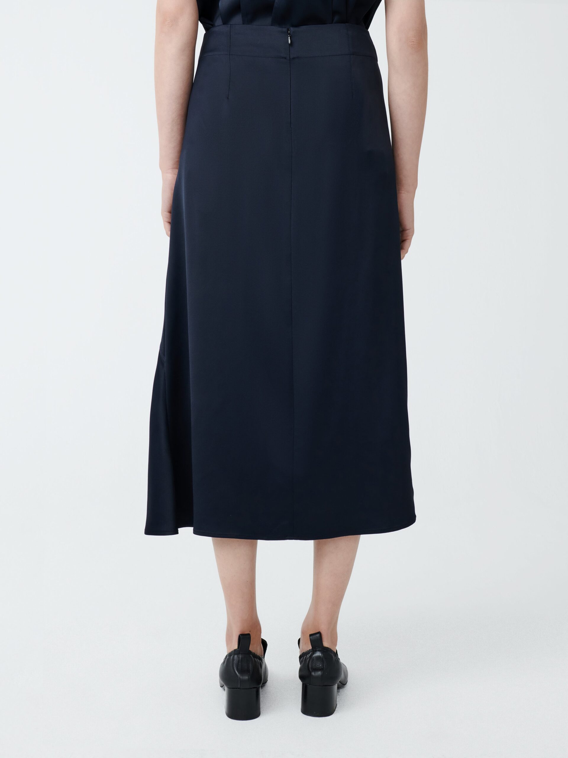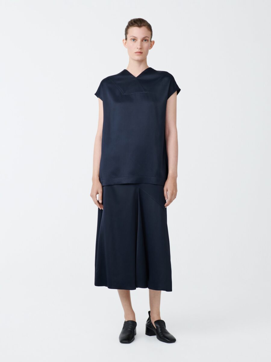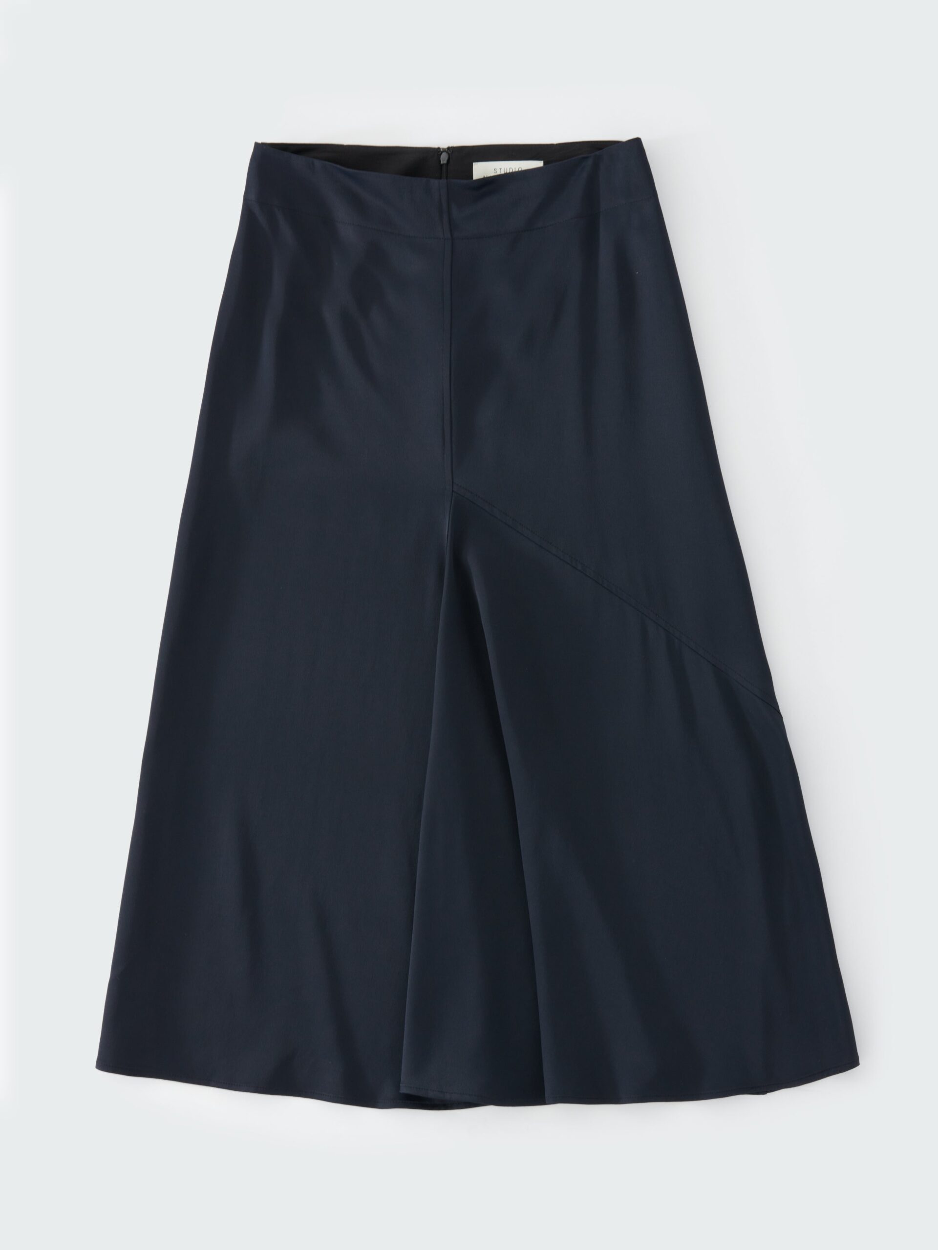 The Naye skirt is a new style for Autumn ’24, taking its shape from the Wylie slip dress. Cut from a Crepe Back Viscose Satin, asymmetric detailing and a kick pleat exaggerate the fabric’s natural fluidity and drape.