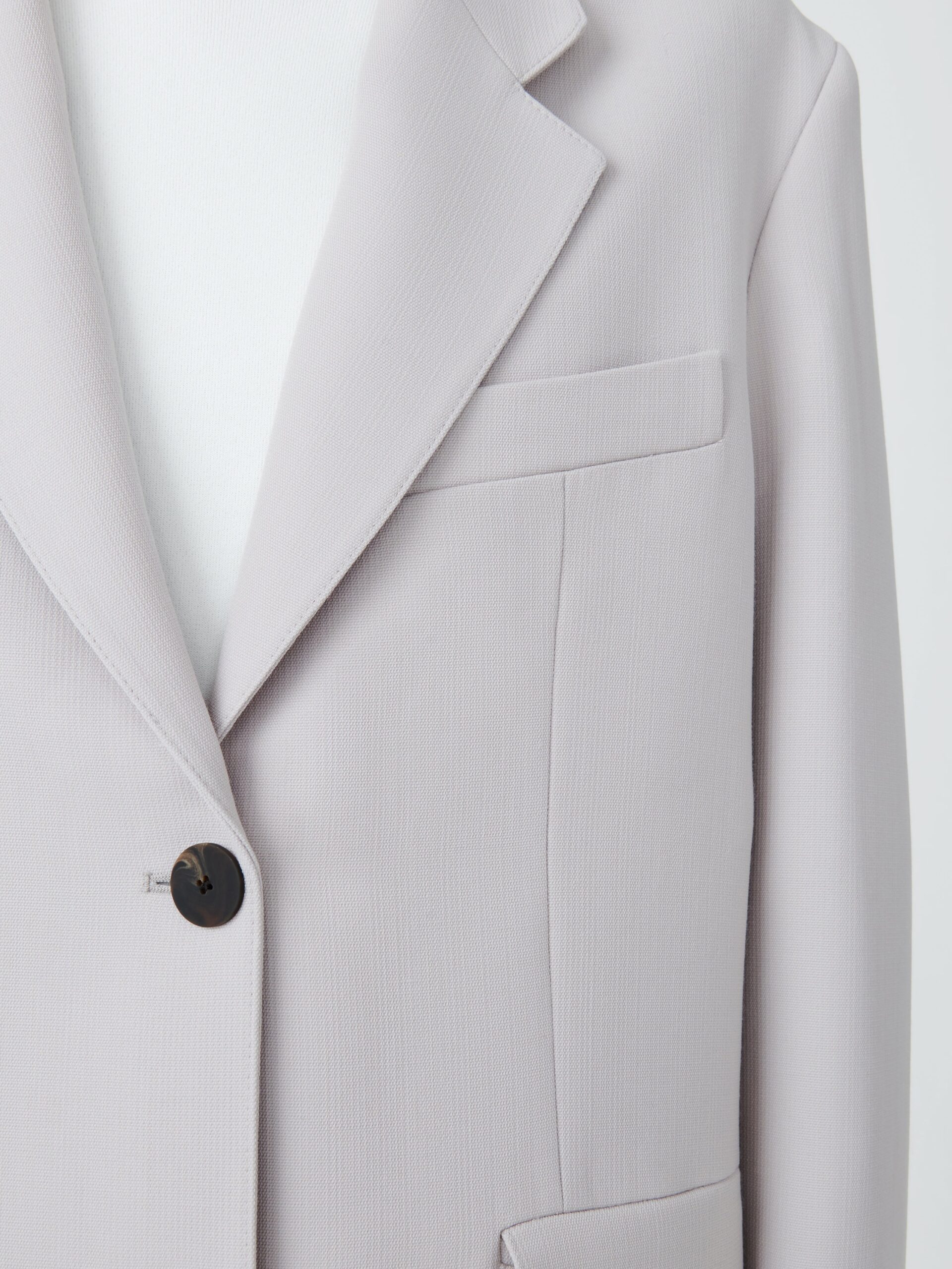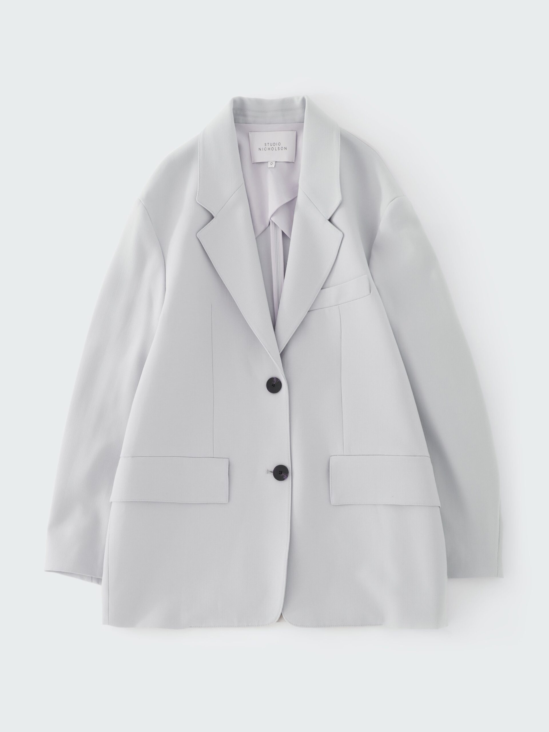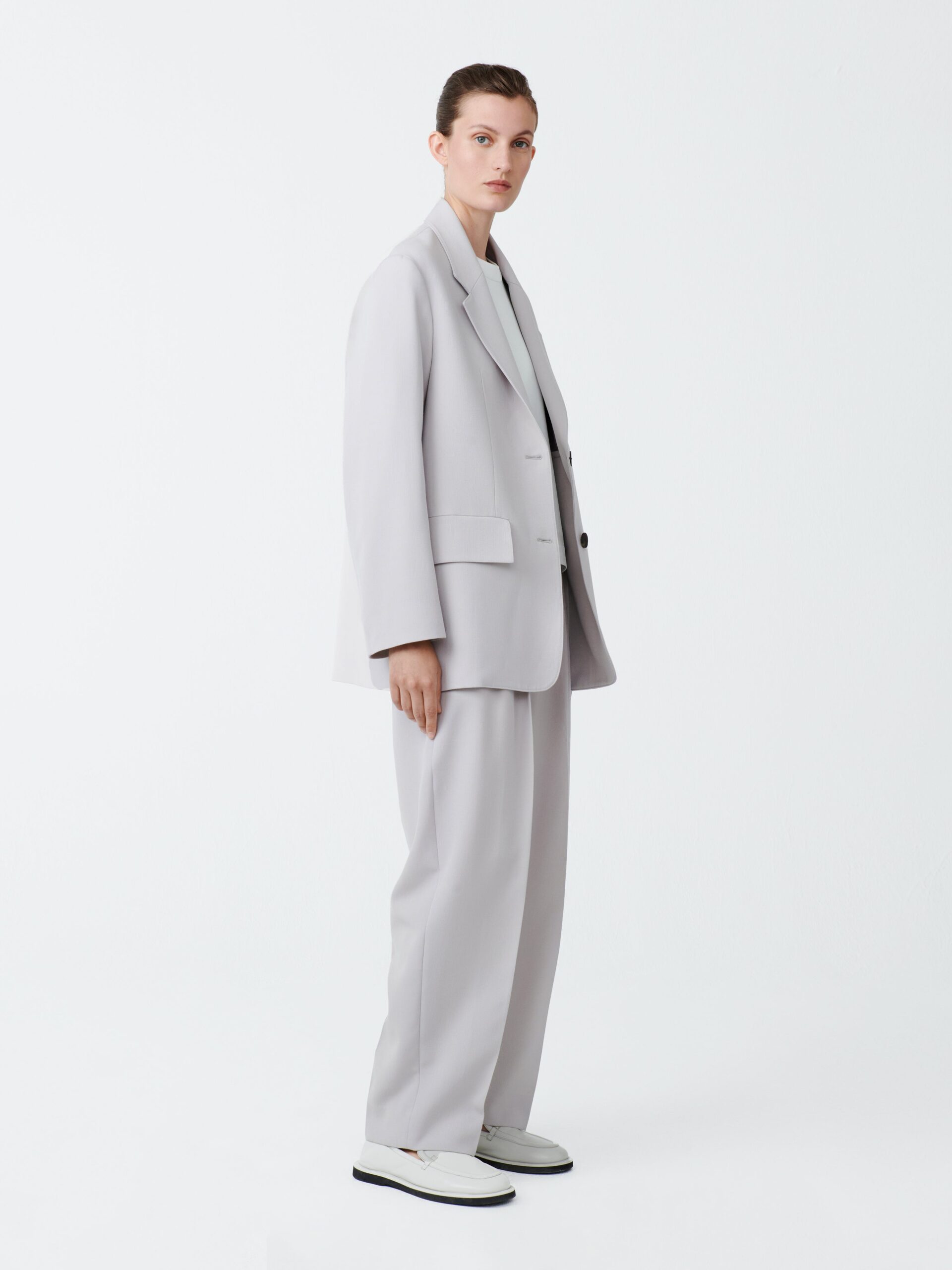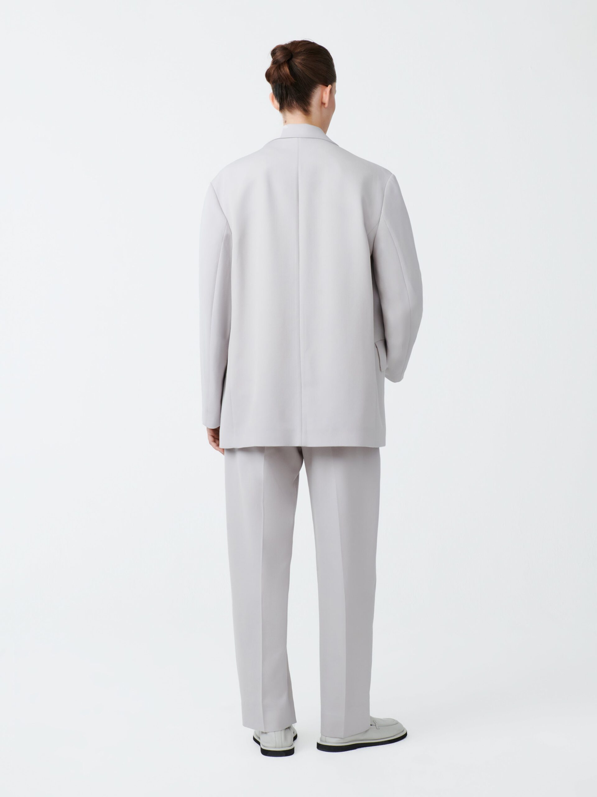 Adapted from a men’s blazer and retaining the exaggerated proportions, Phelps is wide through the body, with a slouchy dropped shoulder. The compact poly viscose fabric lends a dense, spongy texture.