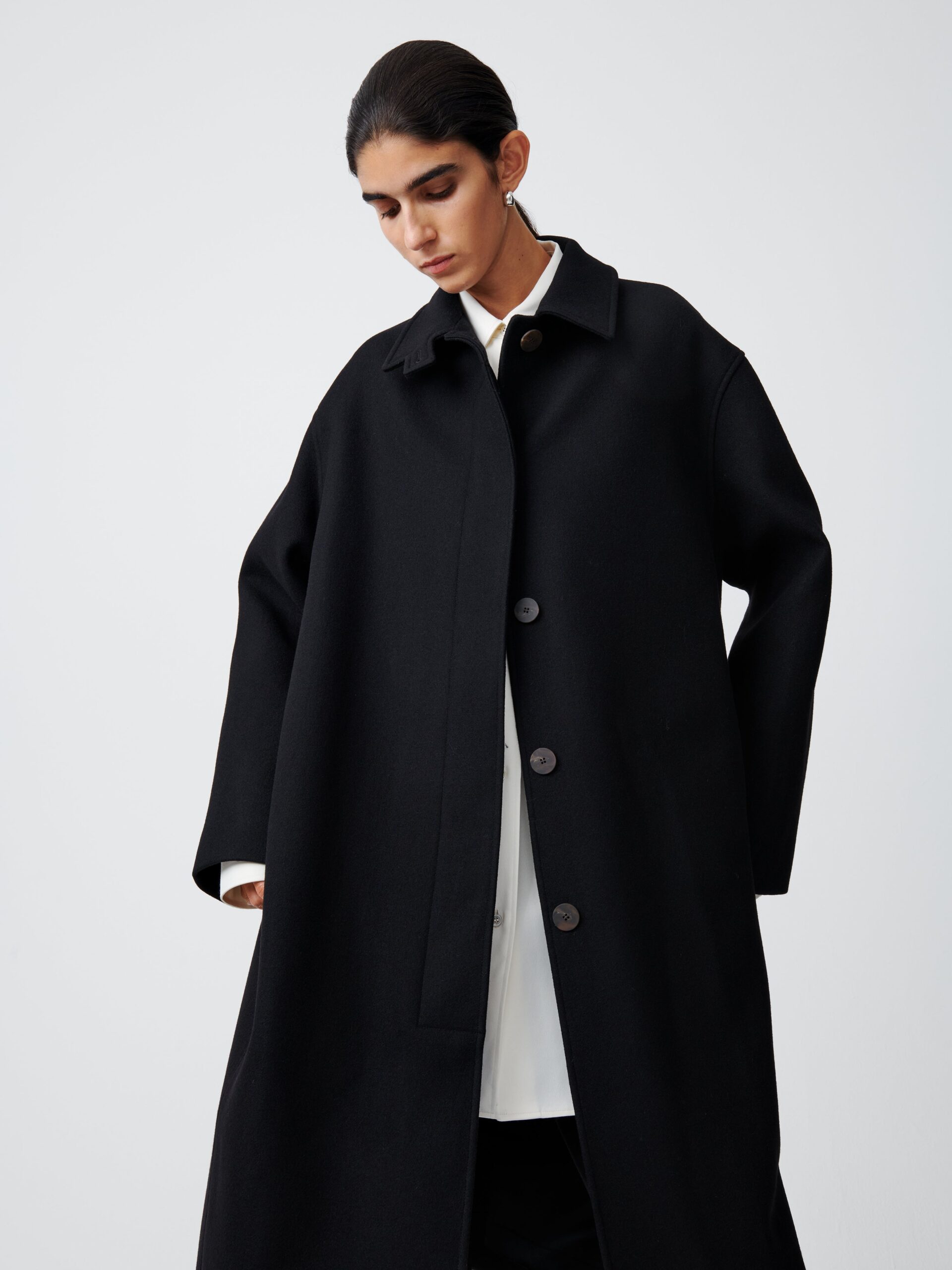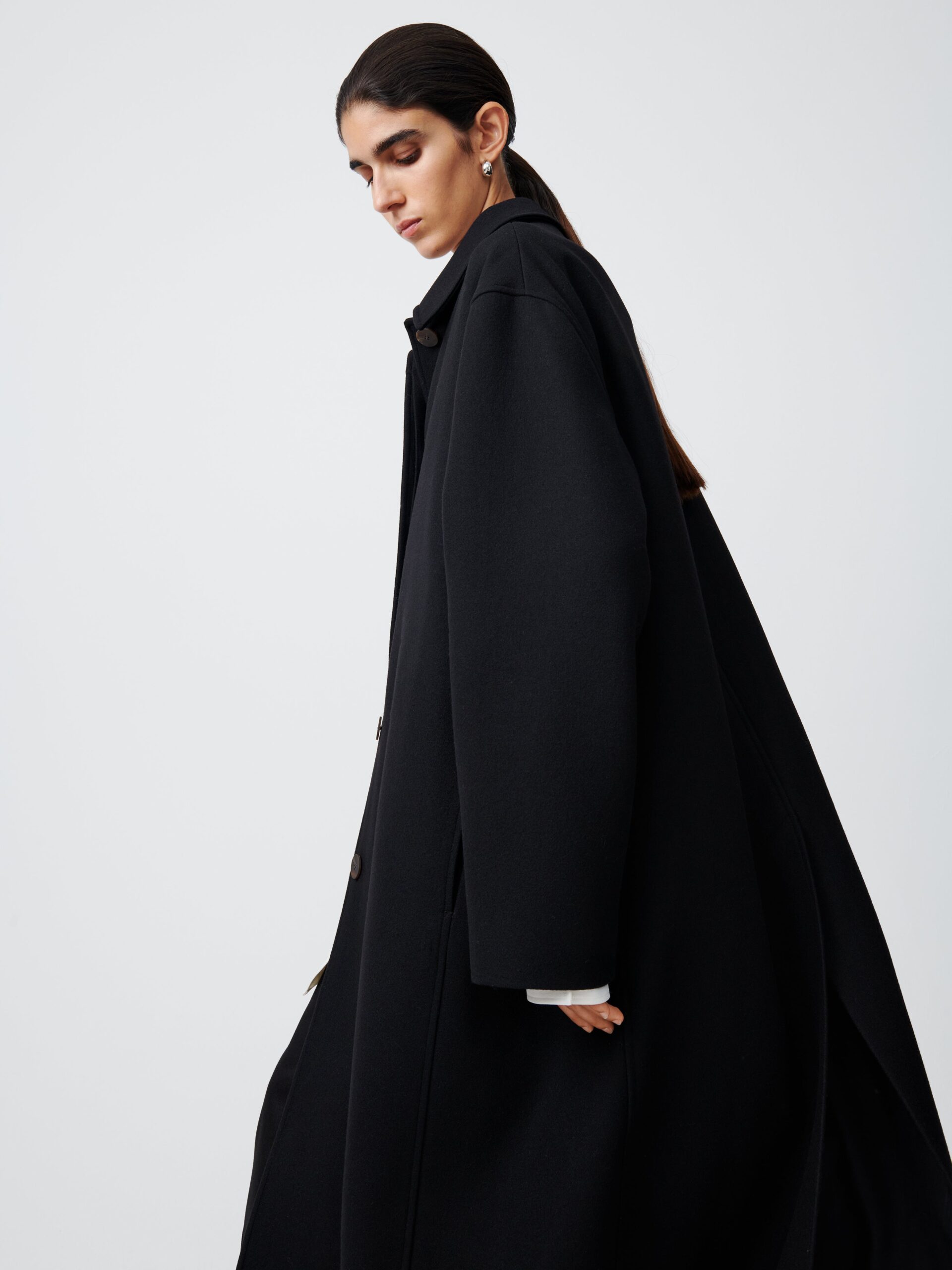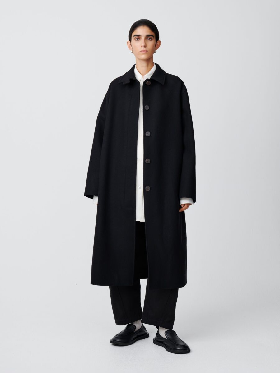 An A-line, swing-style coat, Ria takes its inspiration from traditional tailored overcoats. It is designed to drape and move fluidly, something that is aided by the use of dense Melton wool blend.
