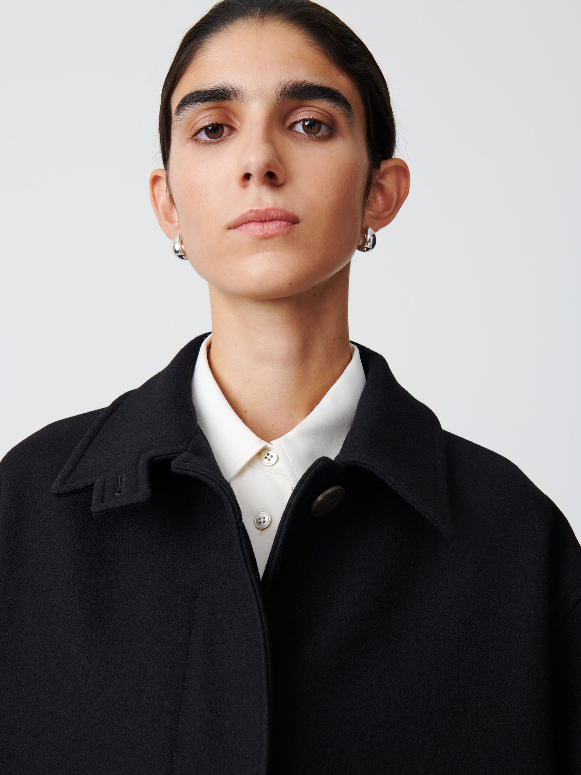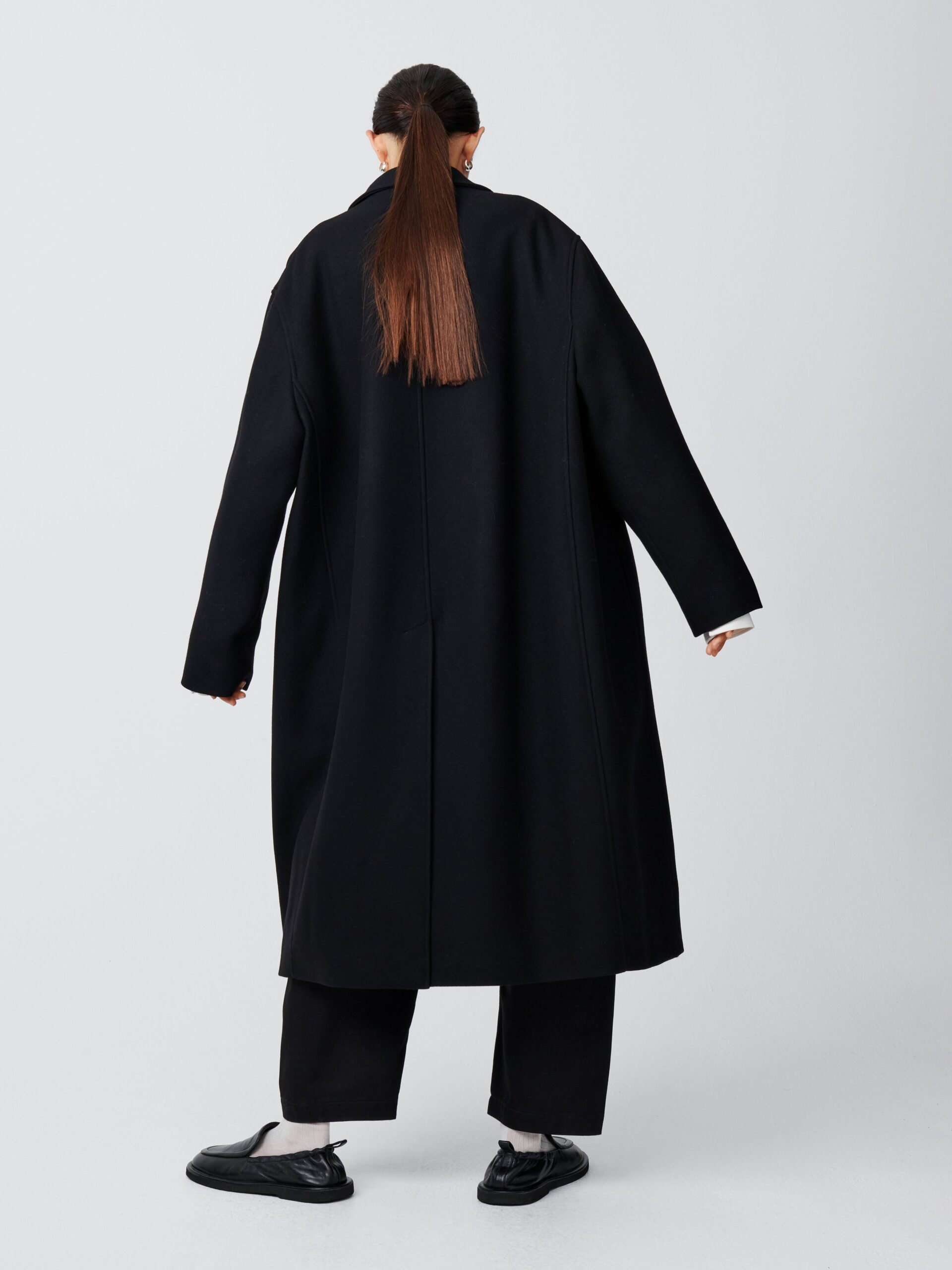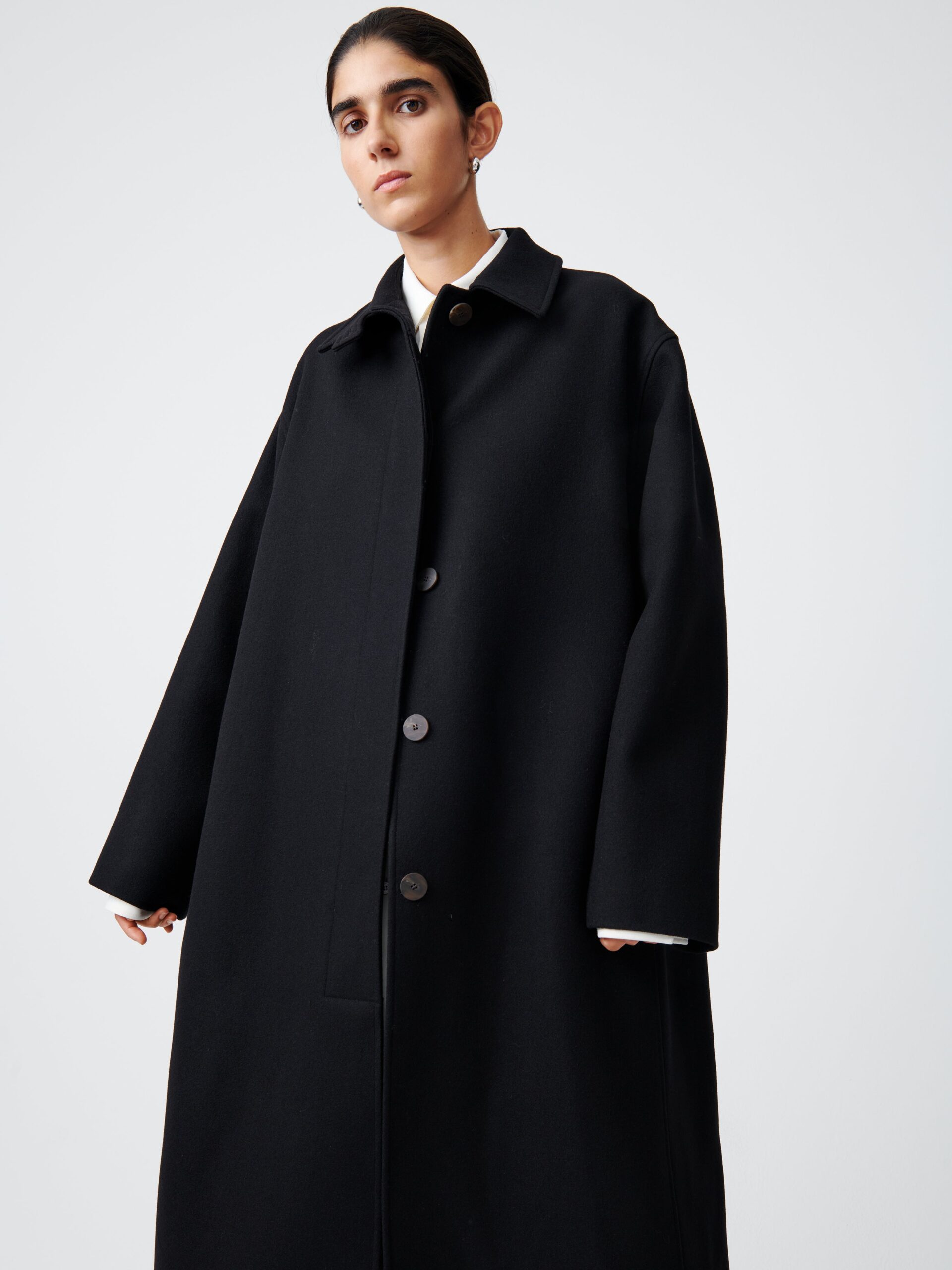 An A-line, swing-style coat, Ria takes its inspiration from traditional tailored overcoats. It is designed to drape and move fluidly, something that is aided by the use of dense Melton wool blend.