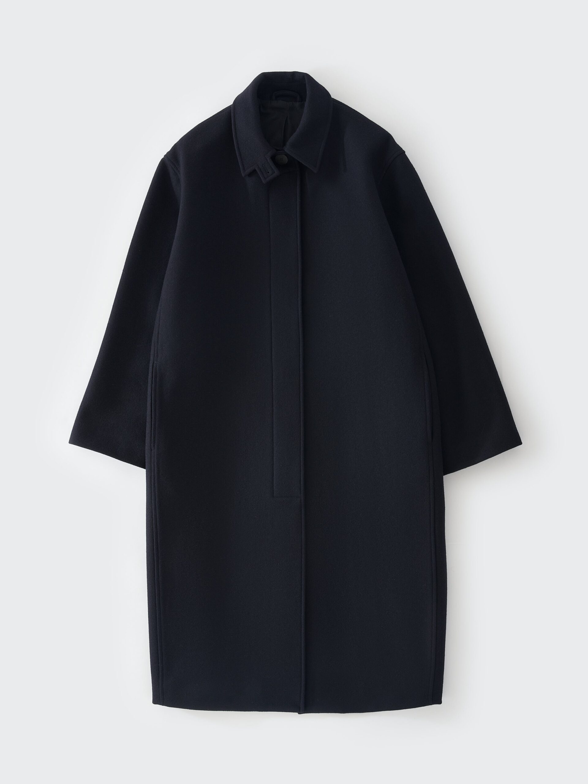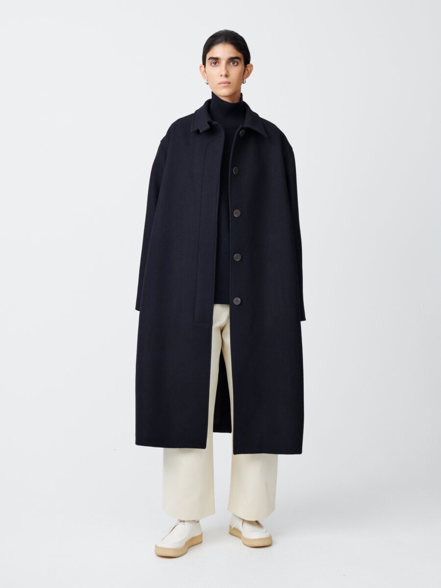 An A-line, swing-style coat, Ria takes its inspiration from traditional tailored overcoats. It is designed to drape and move fluidly, something that is aided by the use of dense Melton wool blend.