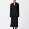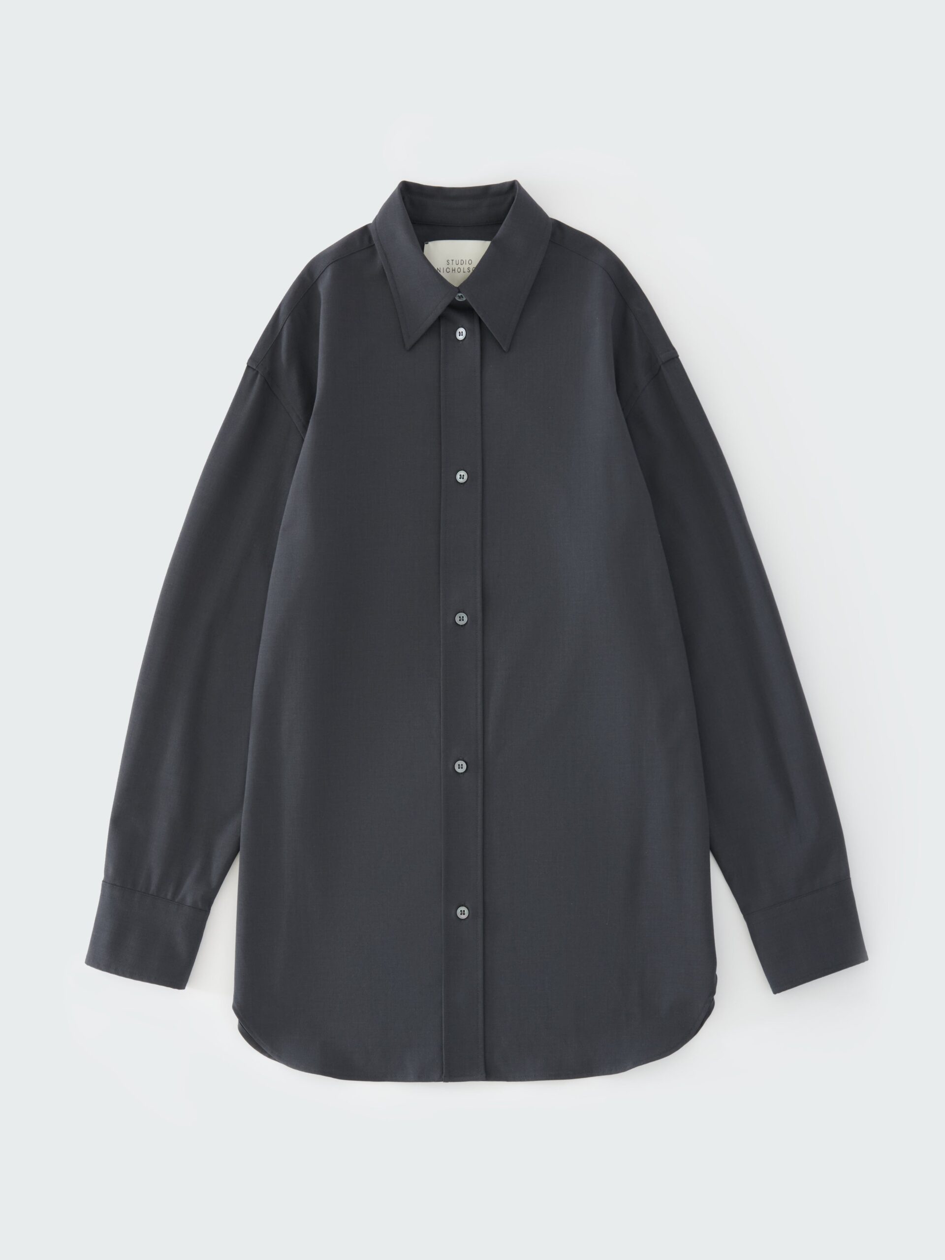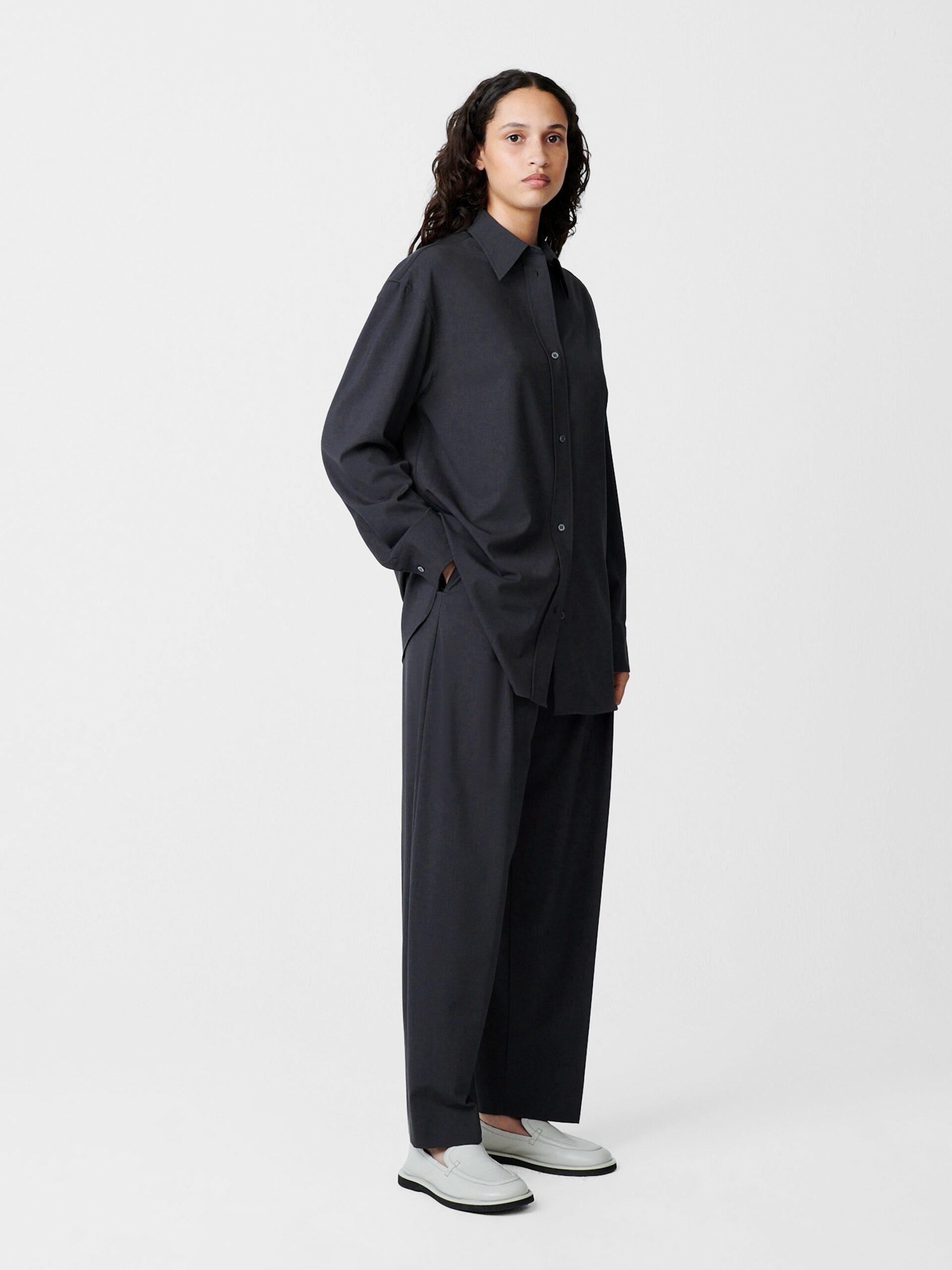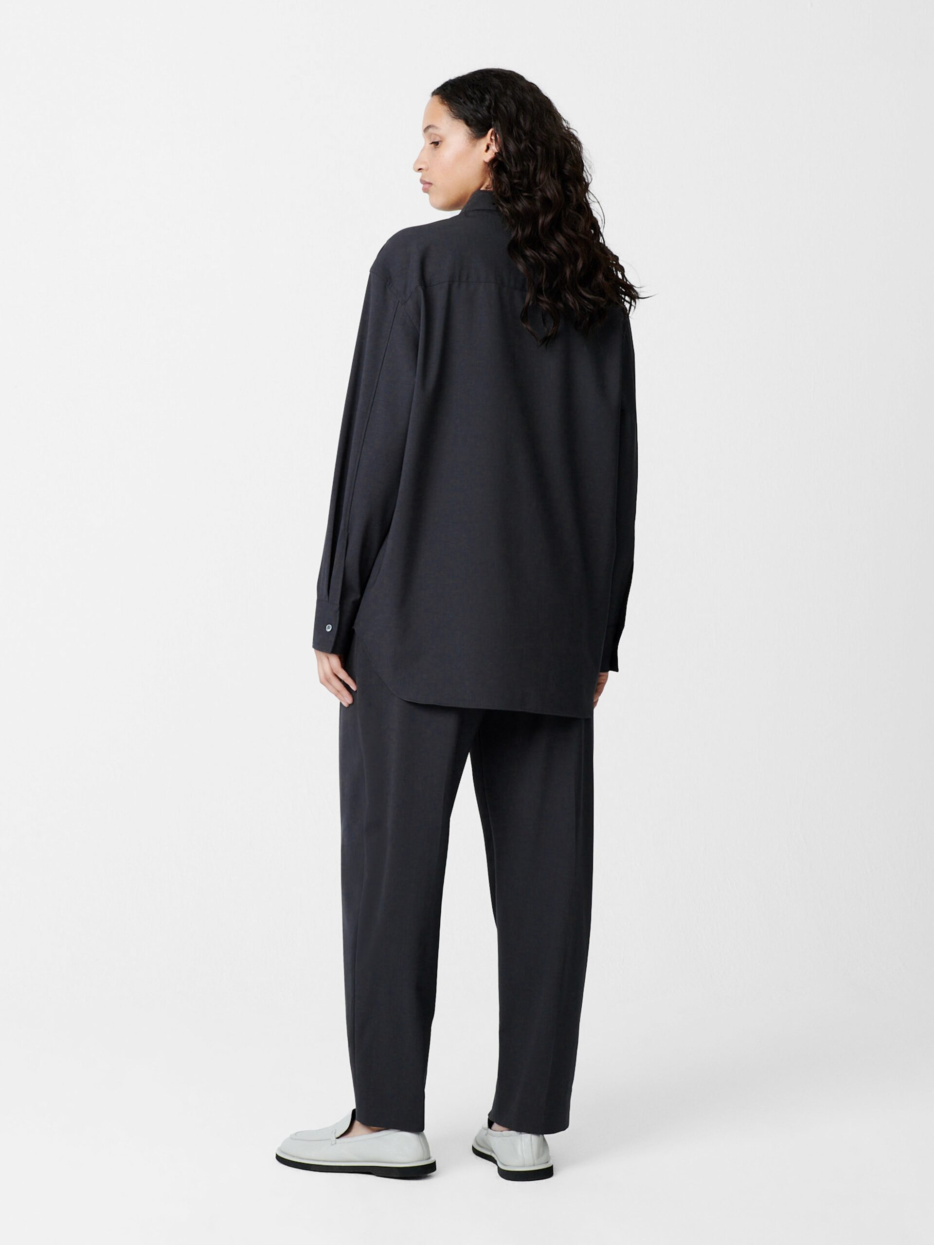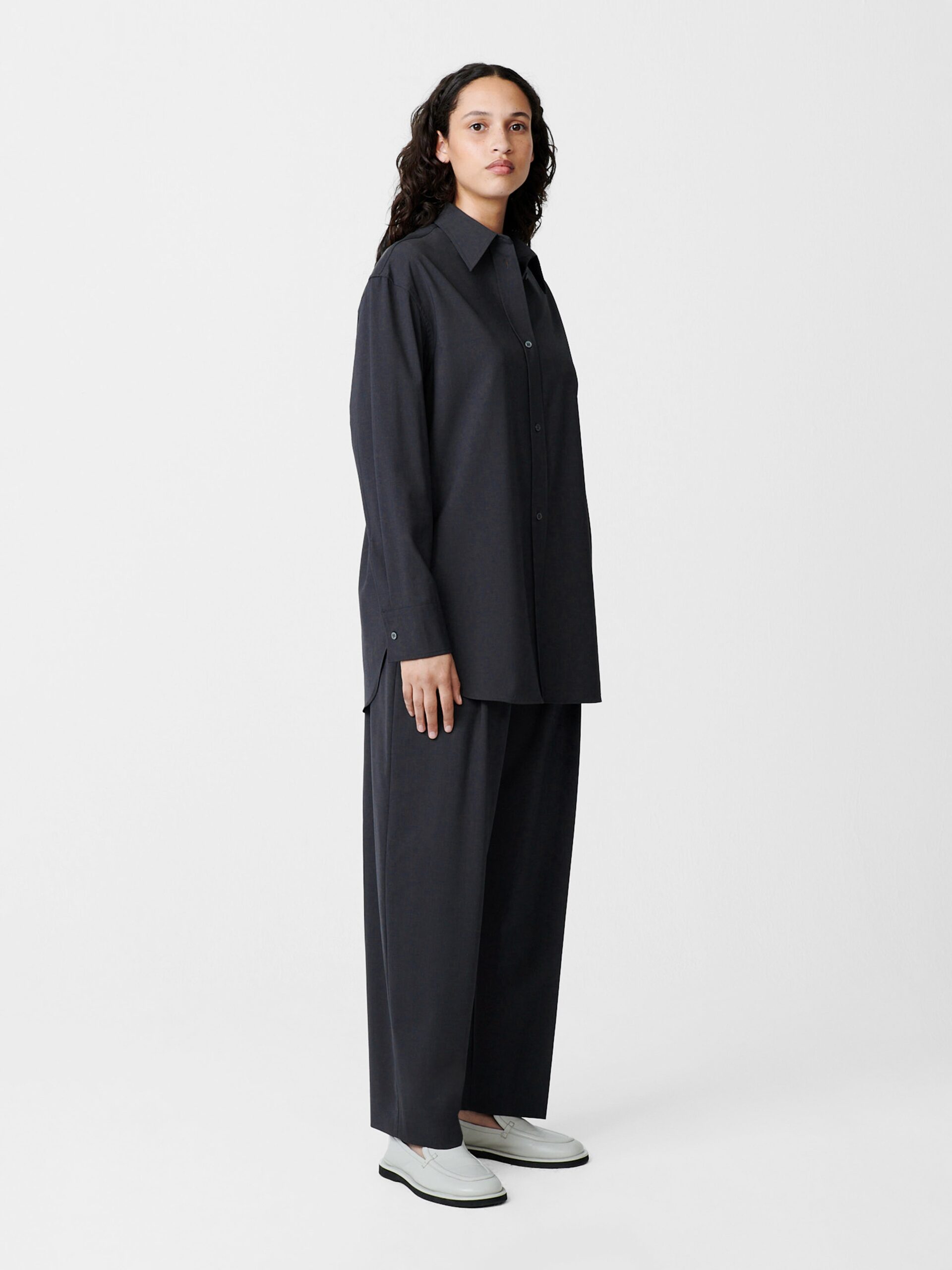Founder and creative director, Nick Wakeman, had numerous images of figures from the 1990s on her reference board for Winter ‘24. A key design trope is the decade’s affinity for minimalism, reflected in the understated design of this Santos shirt. Made from tropical wool, it is cut with a gentle rise at the side of the shirt tail to reduce constriction on the waist and has a relaxed, longline fit.