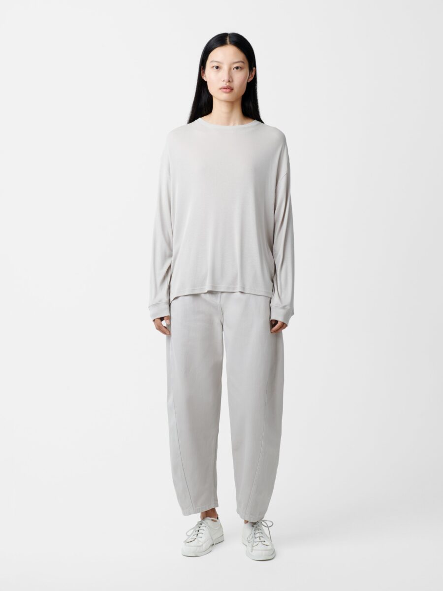 Based on a men’s long-sleeved thermal top, Simmons has a relaxed, oversized fit. It’s cut from our feminine lyocell jersey, which has a drapey, fluid character, and a slight sheen.