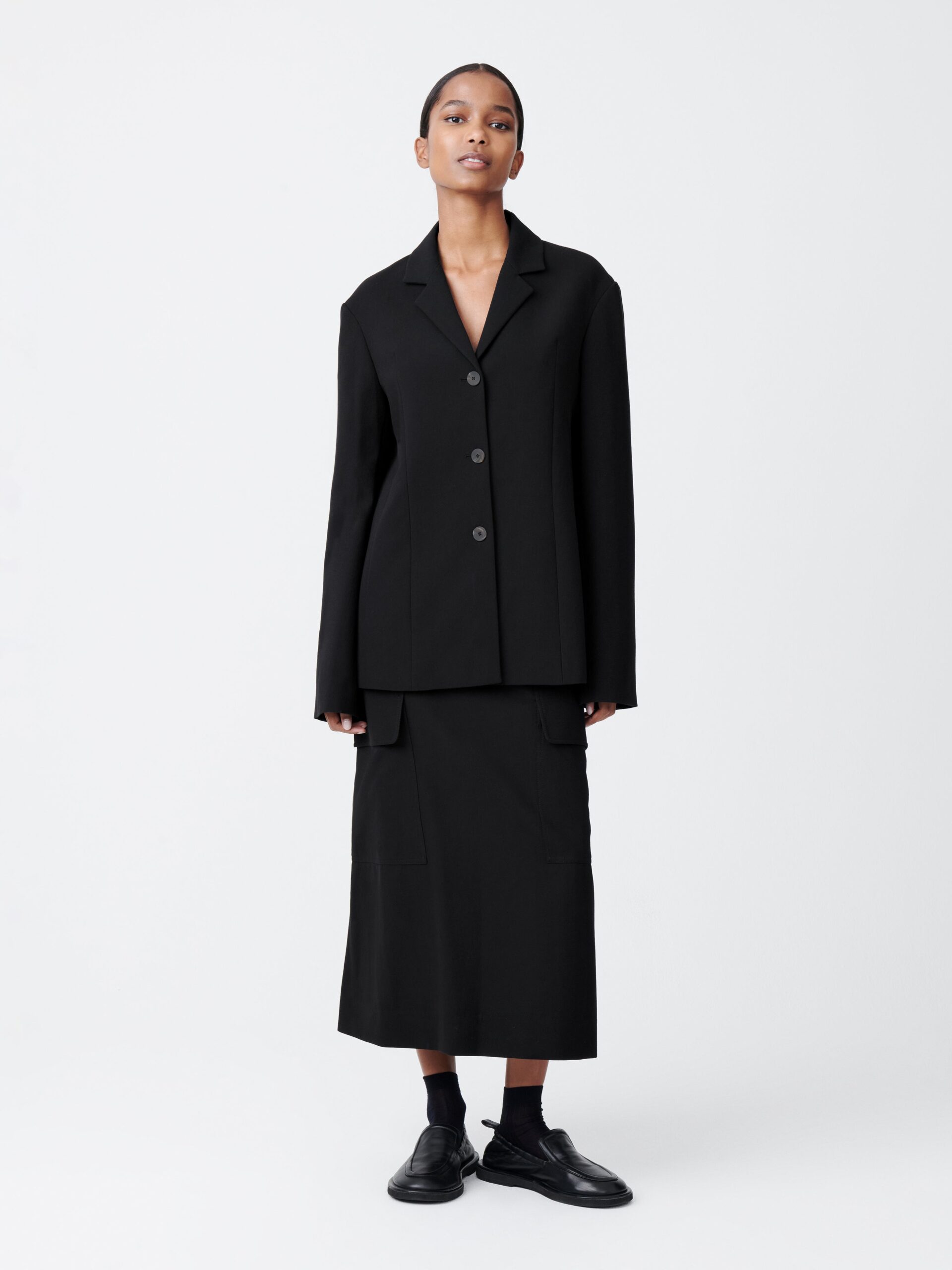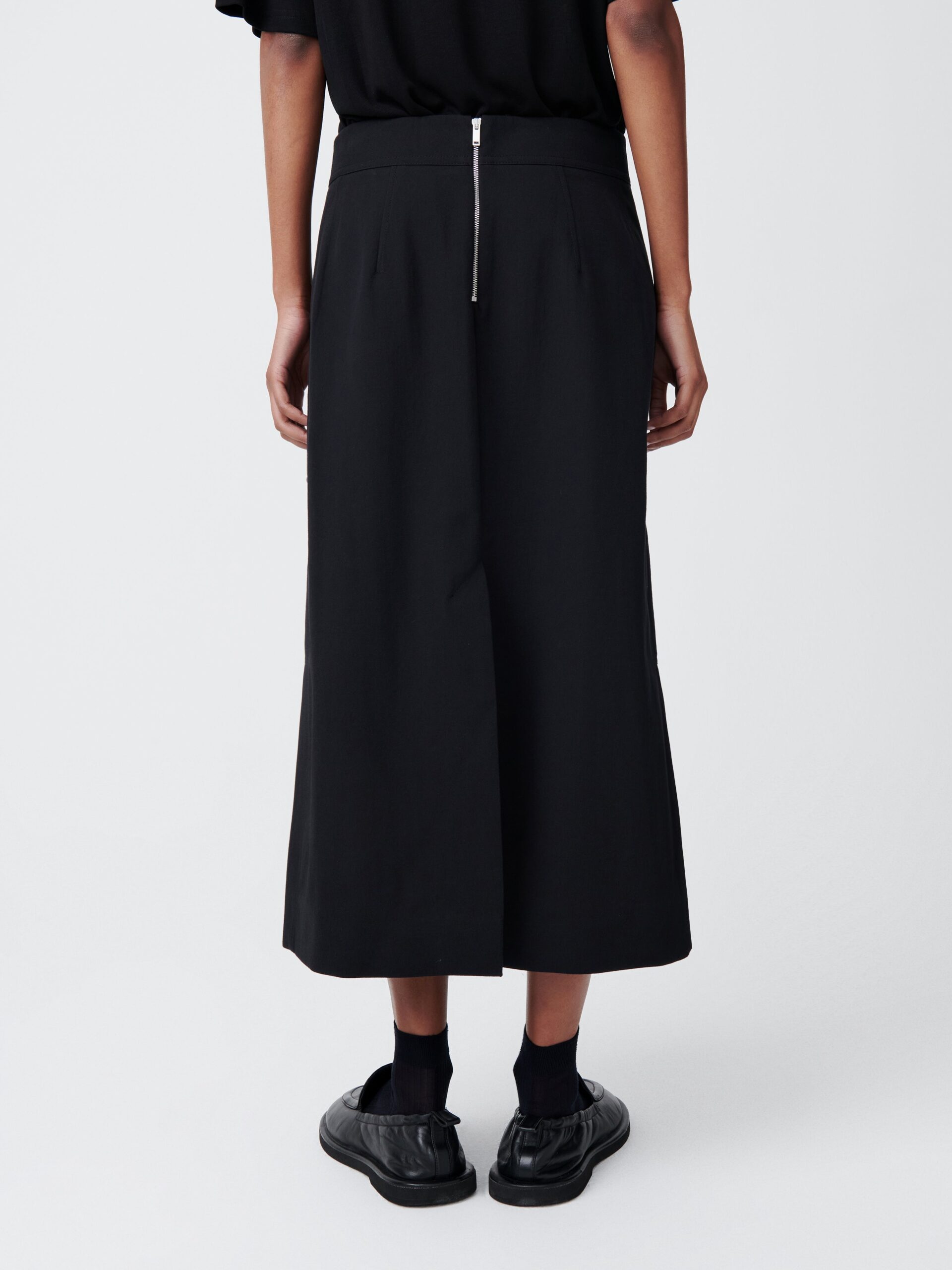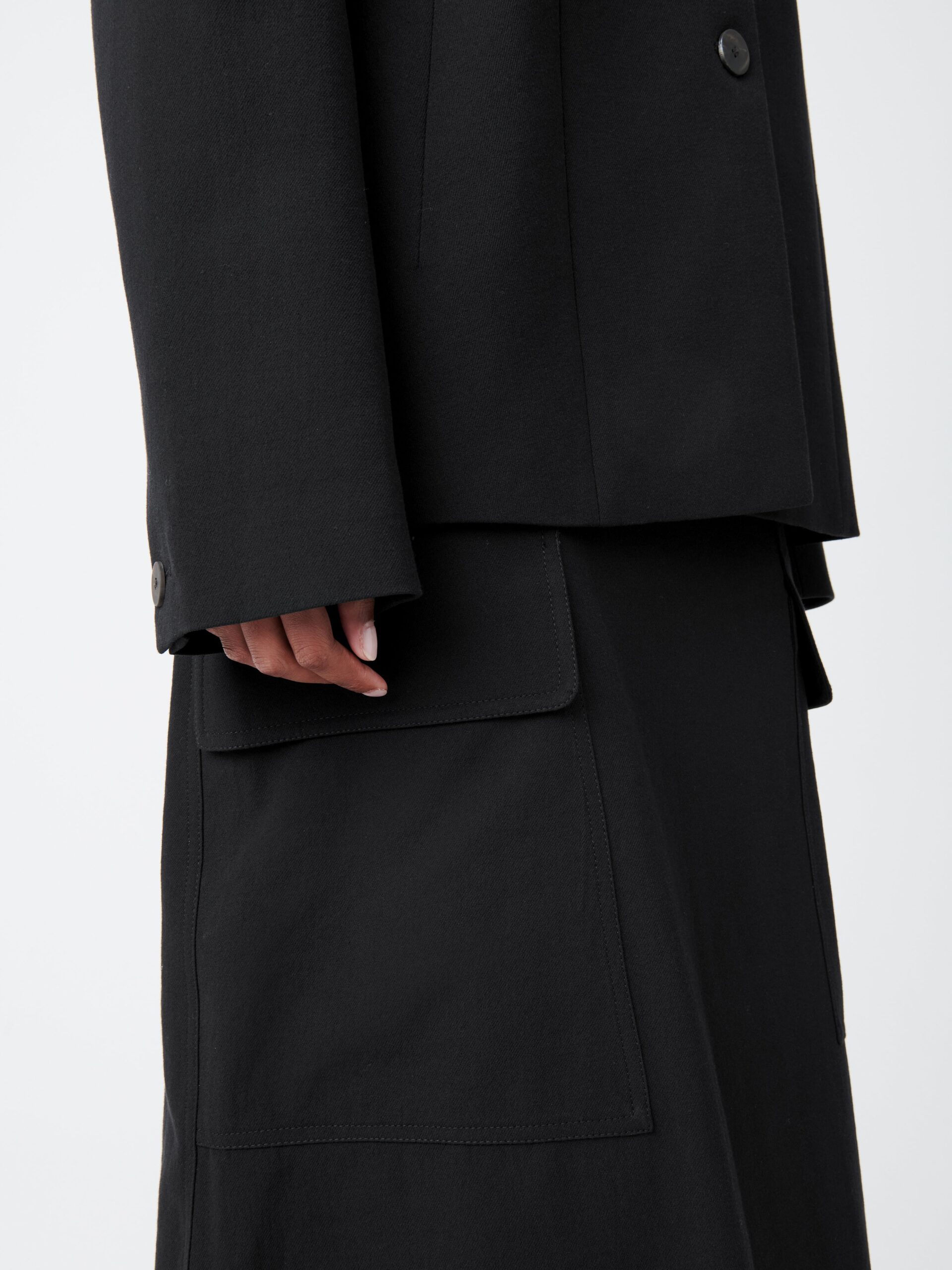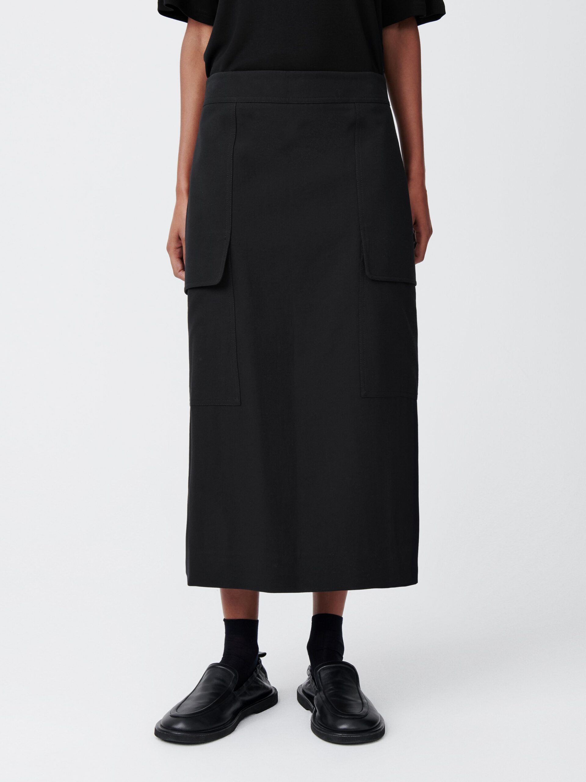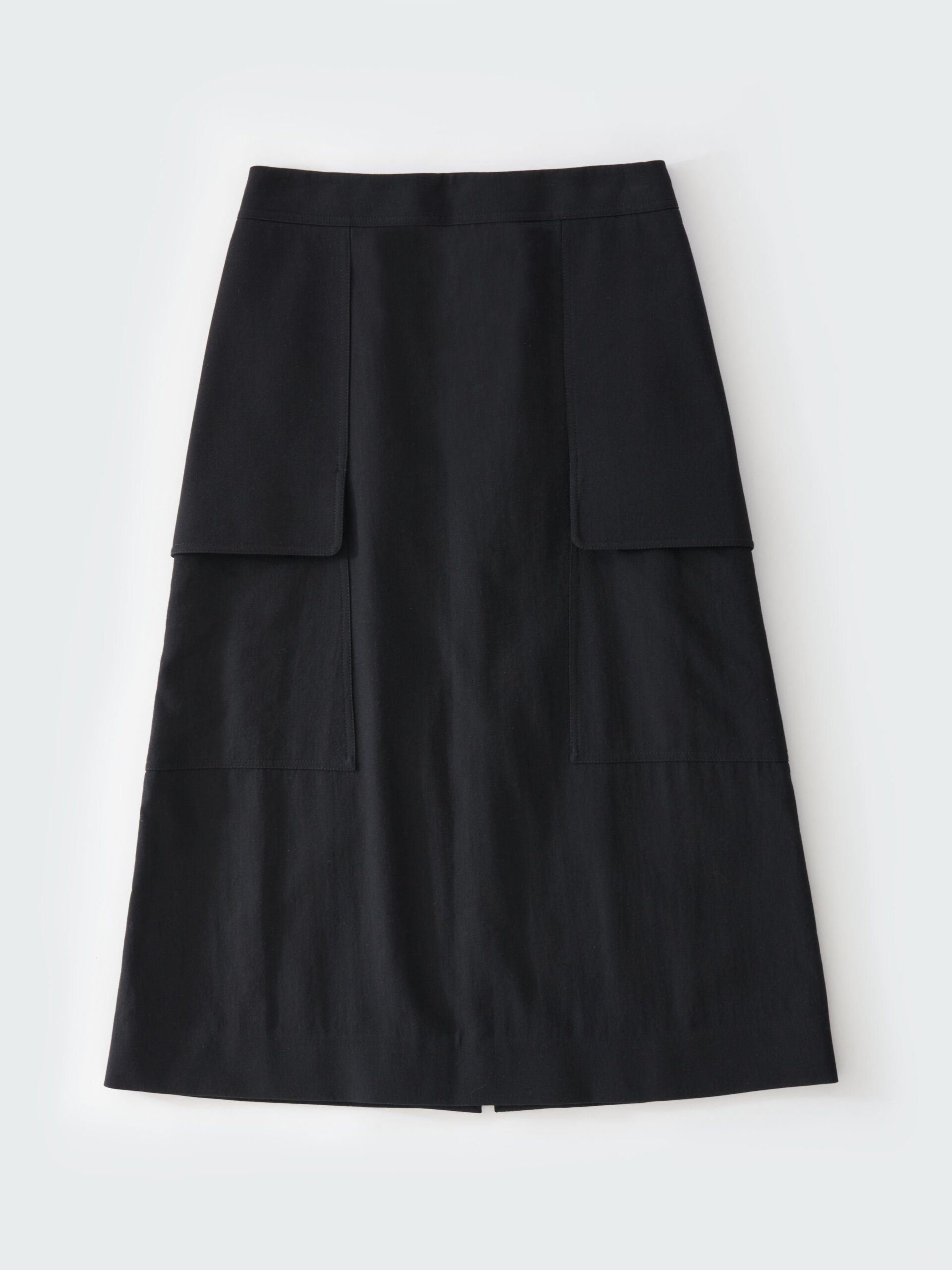 A long skirt with a generous A-line shape, Tyrell has two large patch pockets that wrap around the skirt’s side in a cargo style. It also has a top-stitched panel detail that cleverly runs into the pockets’ flaps.
