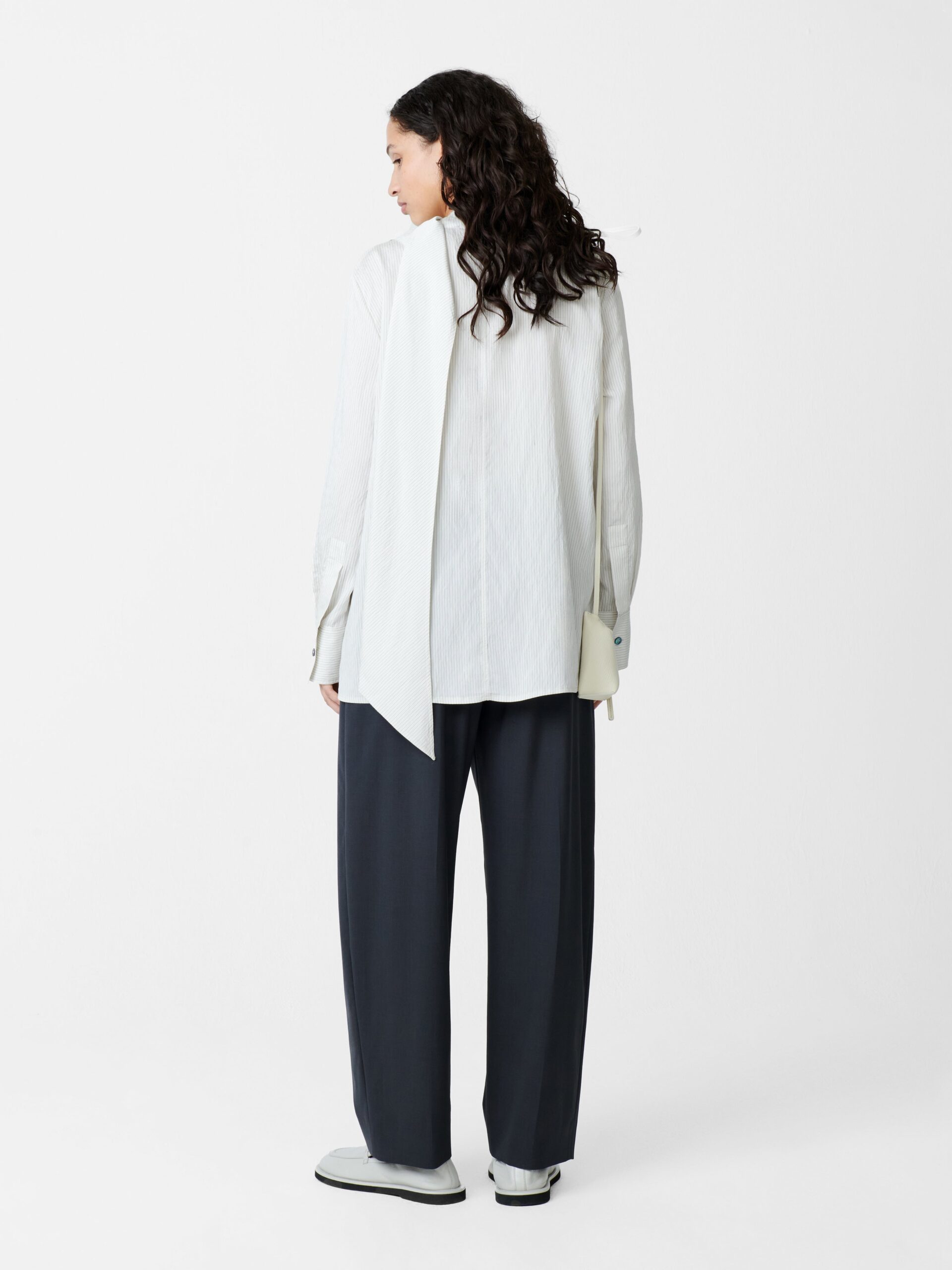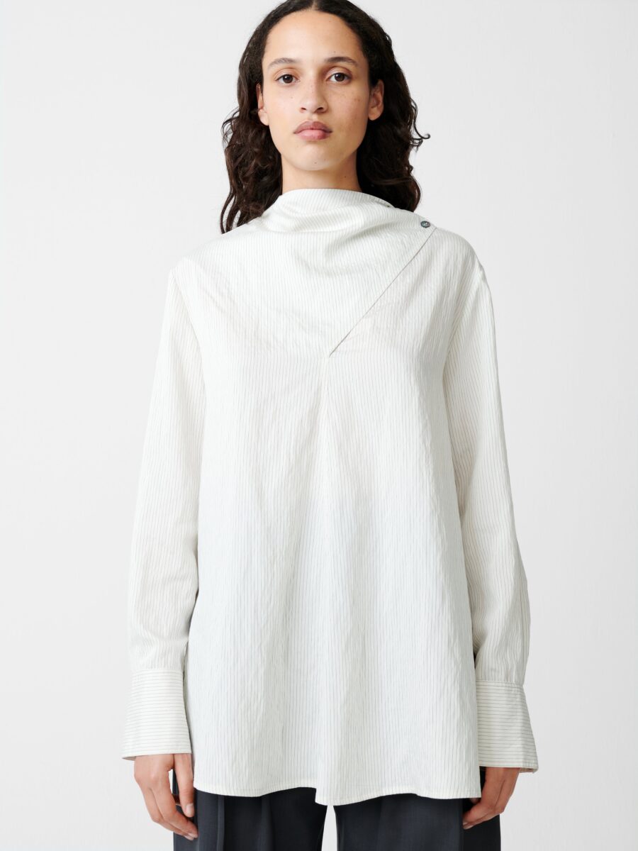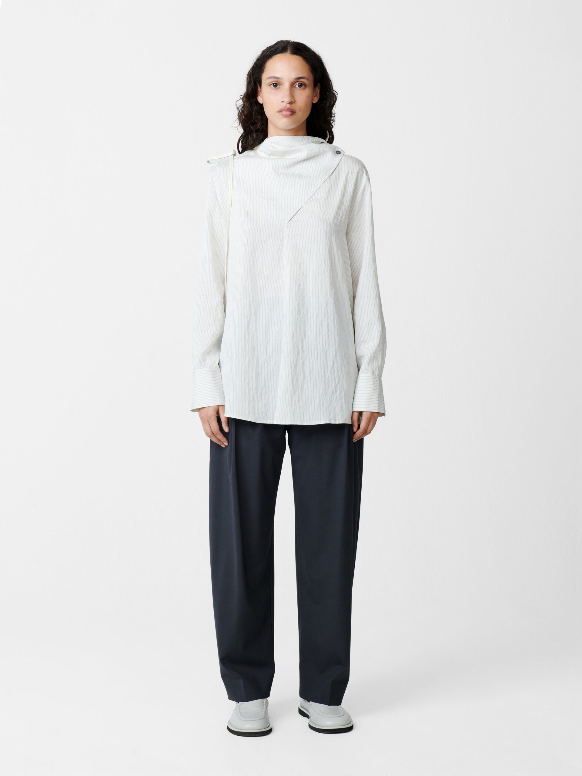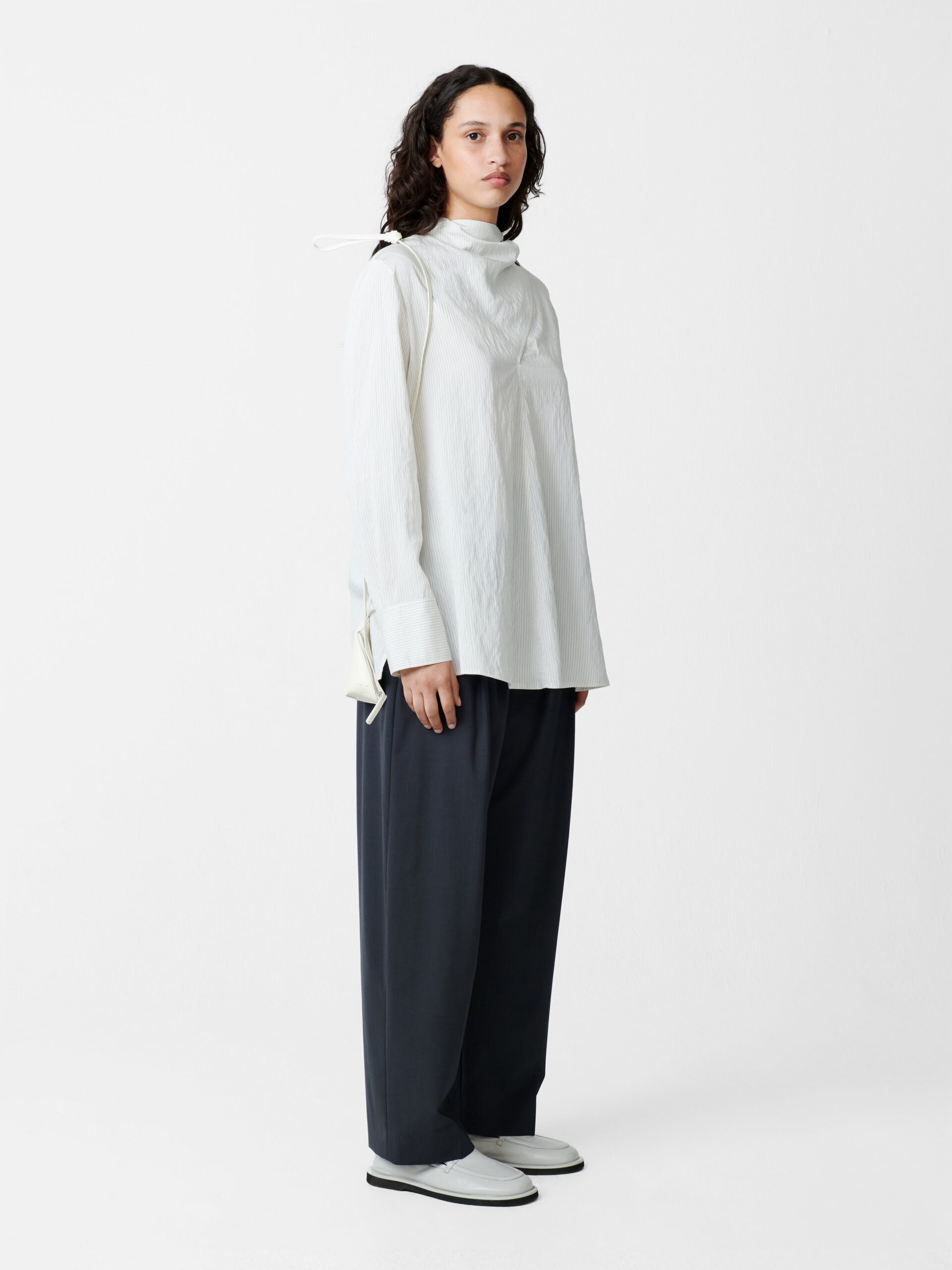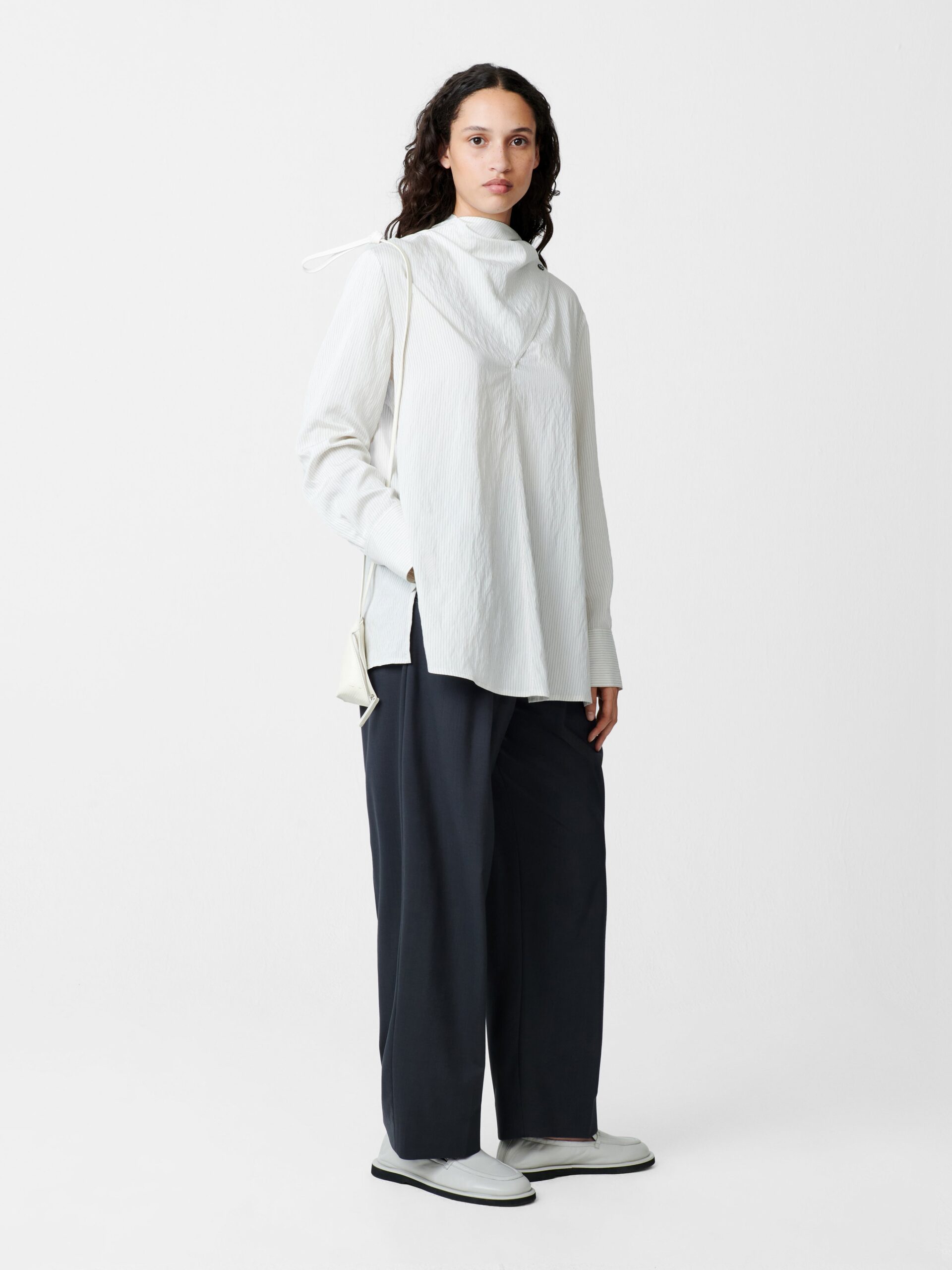 Our Utah top is imagined in a modal blend fabric, which has a slightly crinkled finish for enhanced textural interest. It has an asymmetric neckline with a scarf detail to elevate the loose fit and is cut with a longline hem, making it ideal to layer over classic tailoring or casual denim.