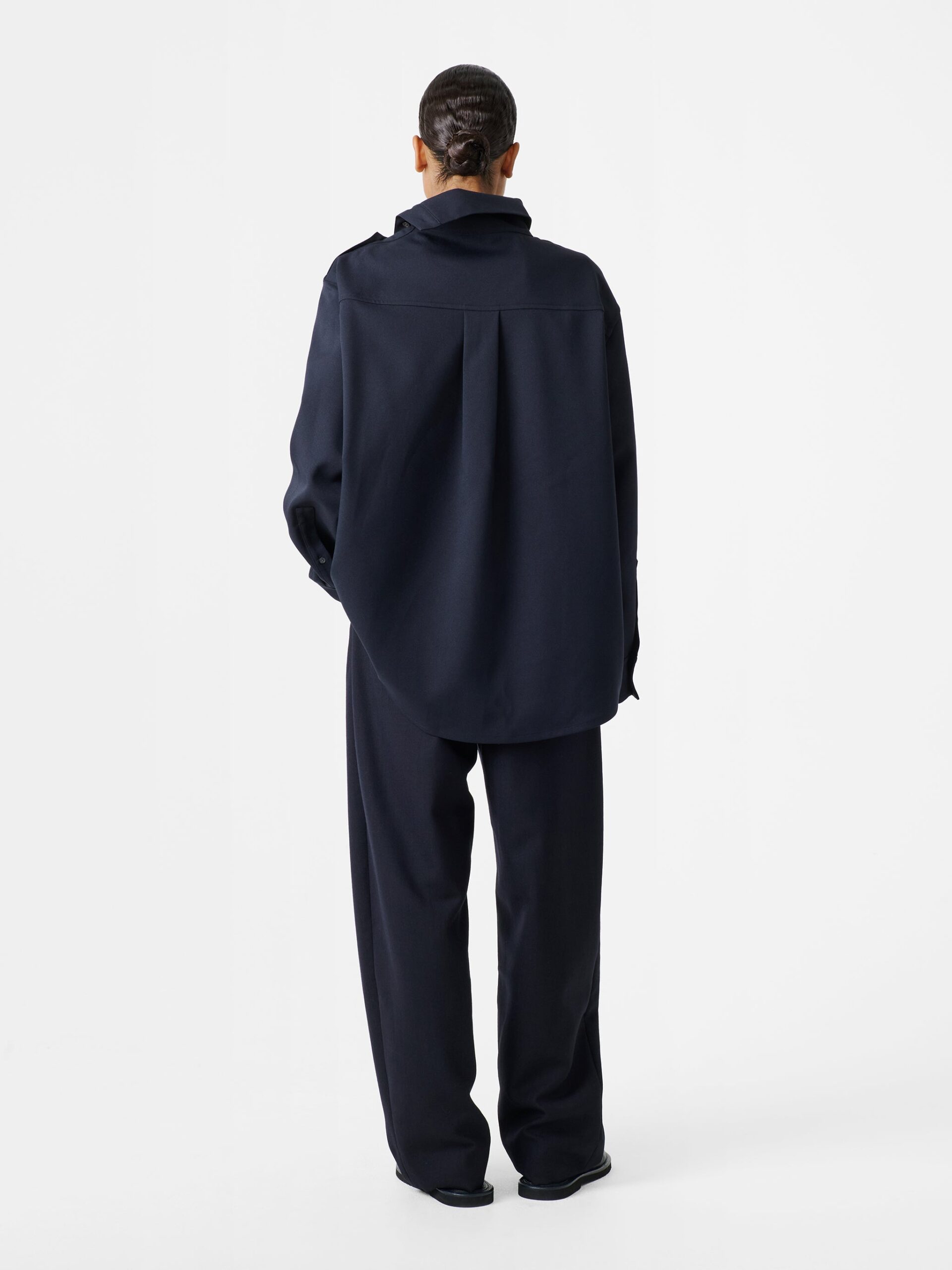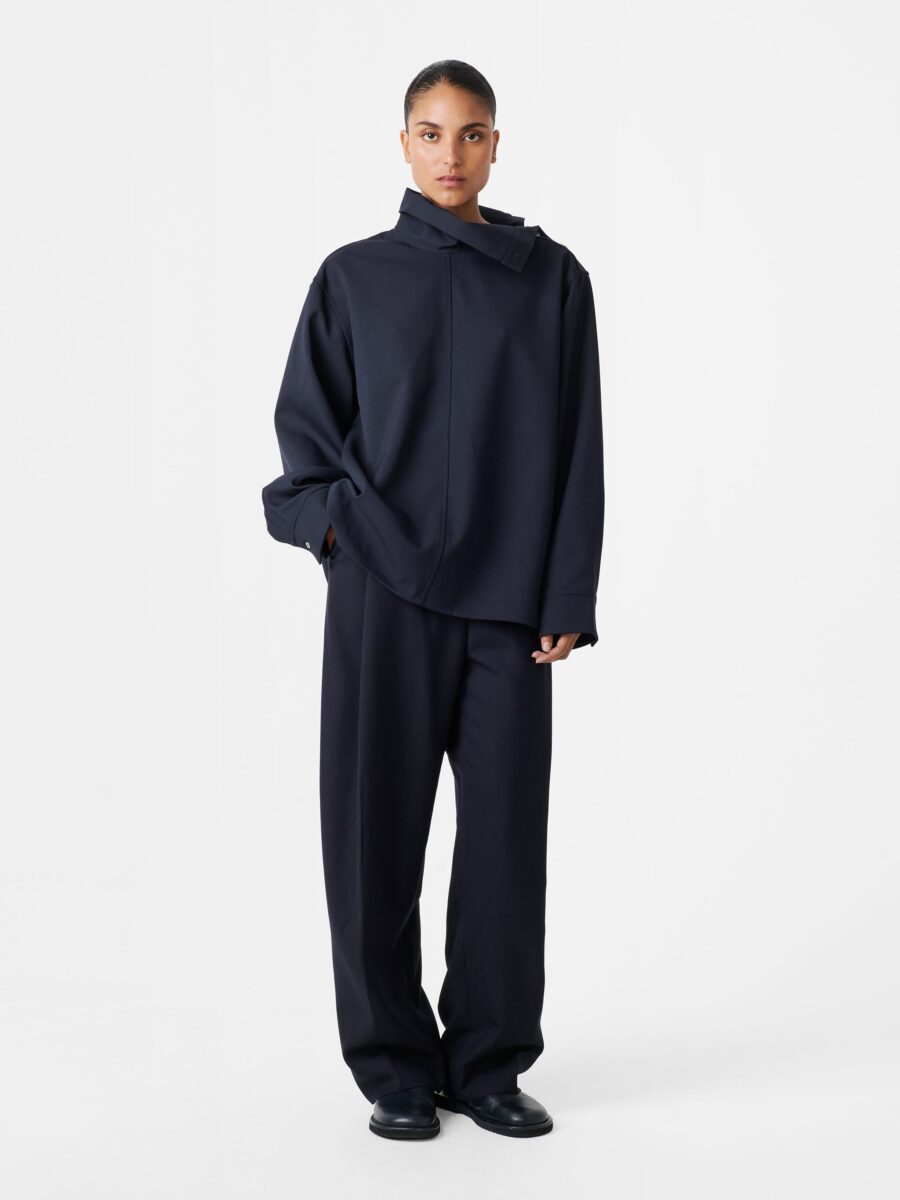 The Wist top is cut from Japanese-made twill that’s woven from recycled polyester, resulting in a crease-resistant fabric with a bouncy hand feel. It features dropped shoulders to emphasize the oversized fit, while the unstructured high neckline can also be worn unbuttoned to create a draped effect.